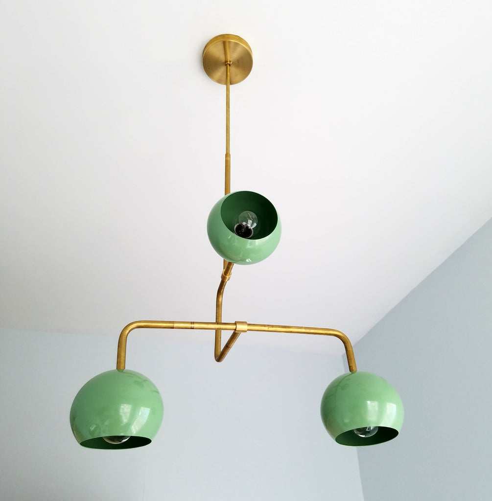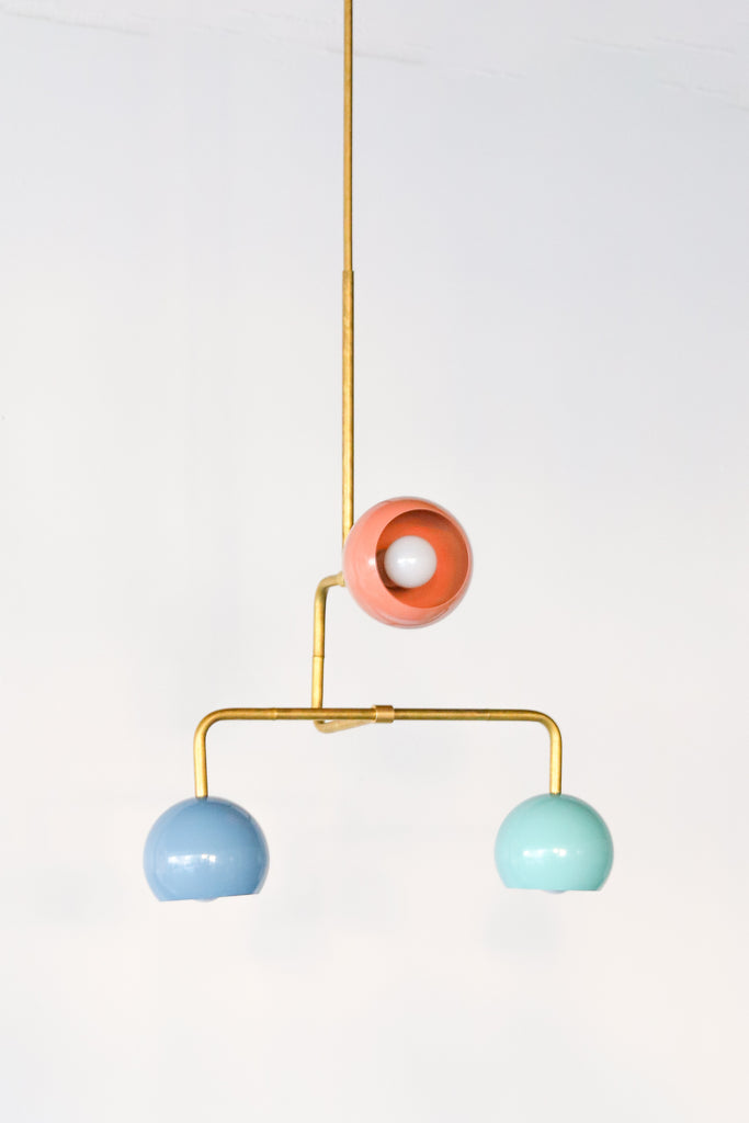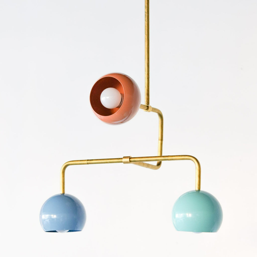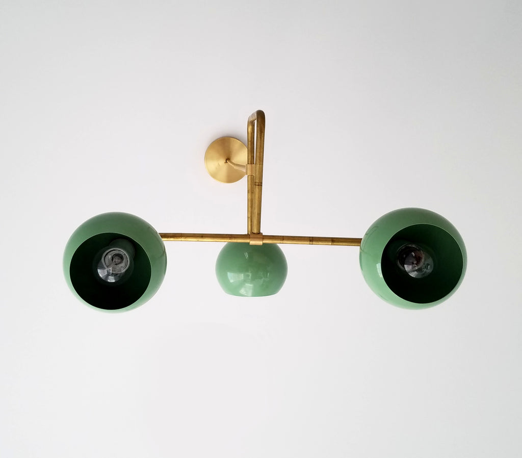 This fixture is currently available in three different shade colorways, all with brass: pink/orange combination, matte black, and vista green. Additional colors may be available upon request.