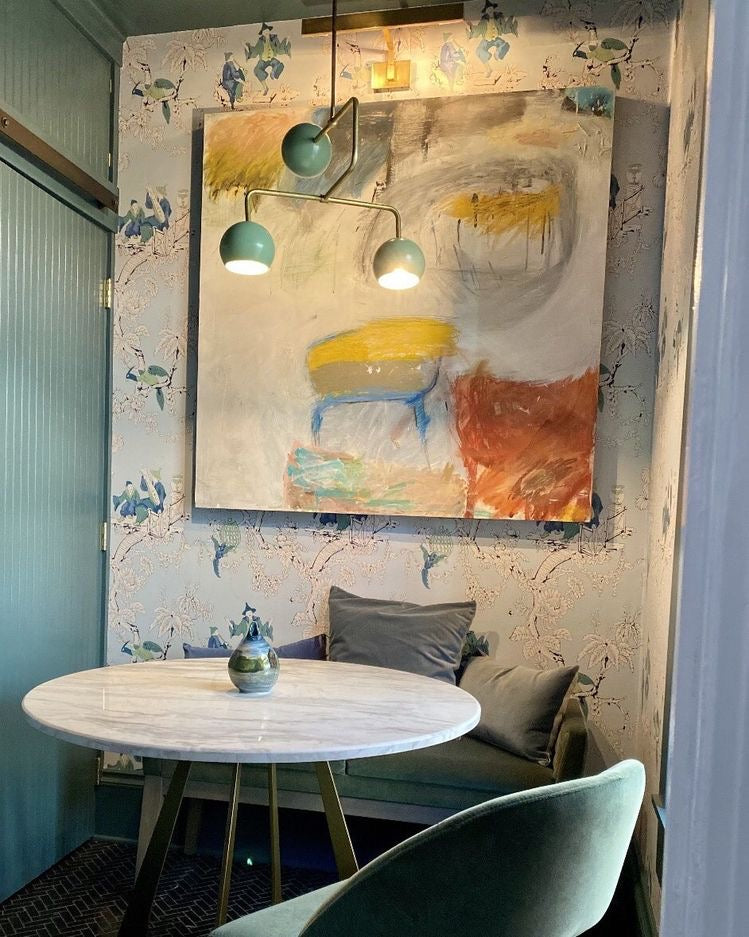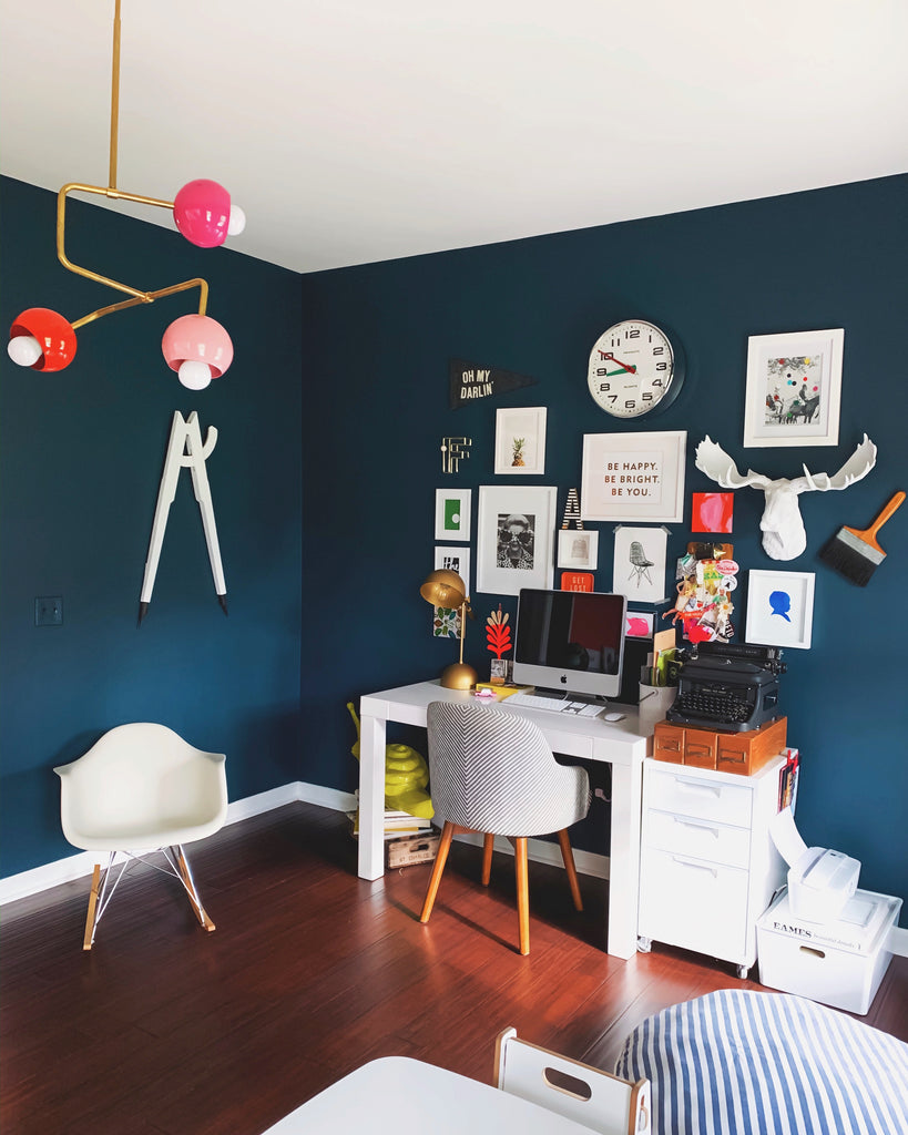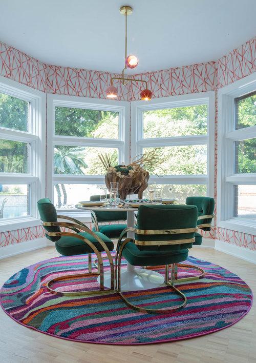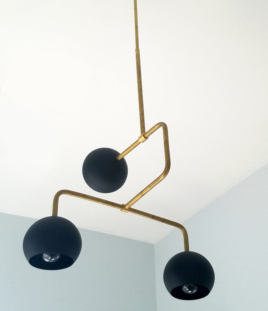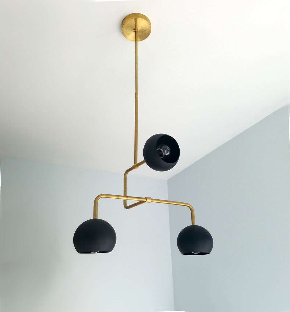 This fixture is currently available in three different shade colorways, all with brass: pink/orange combination, matte black, and vista green. Additional colors may be available upon request.