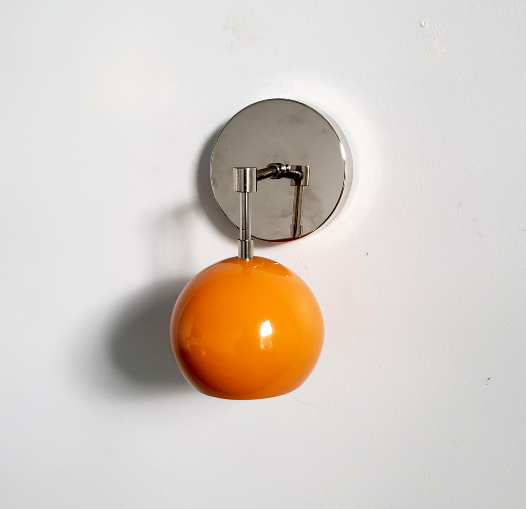 Beautiful mid-century modern inspired sconce featuring a globe-shaped Orange Peel colored shade with complimentary metal finish of brass or chrome. This simple sconce can work as accent lighting, bathroom, lighting, or to illuminate wall art. This sconce features one E26 / medium screw base socket.