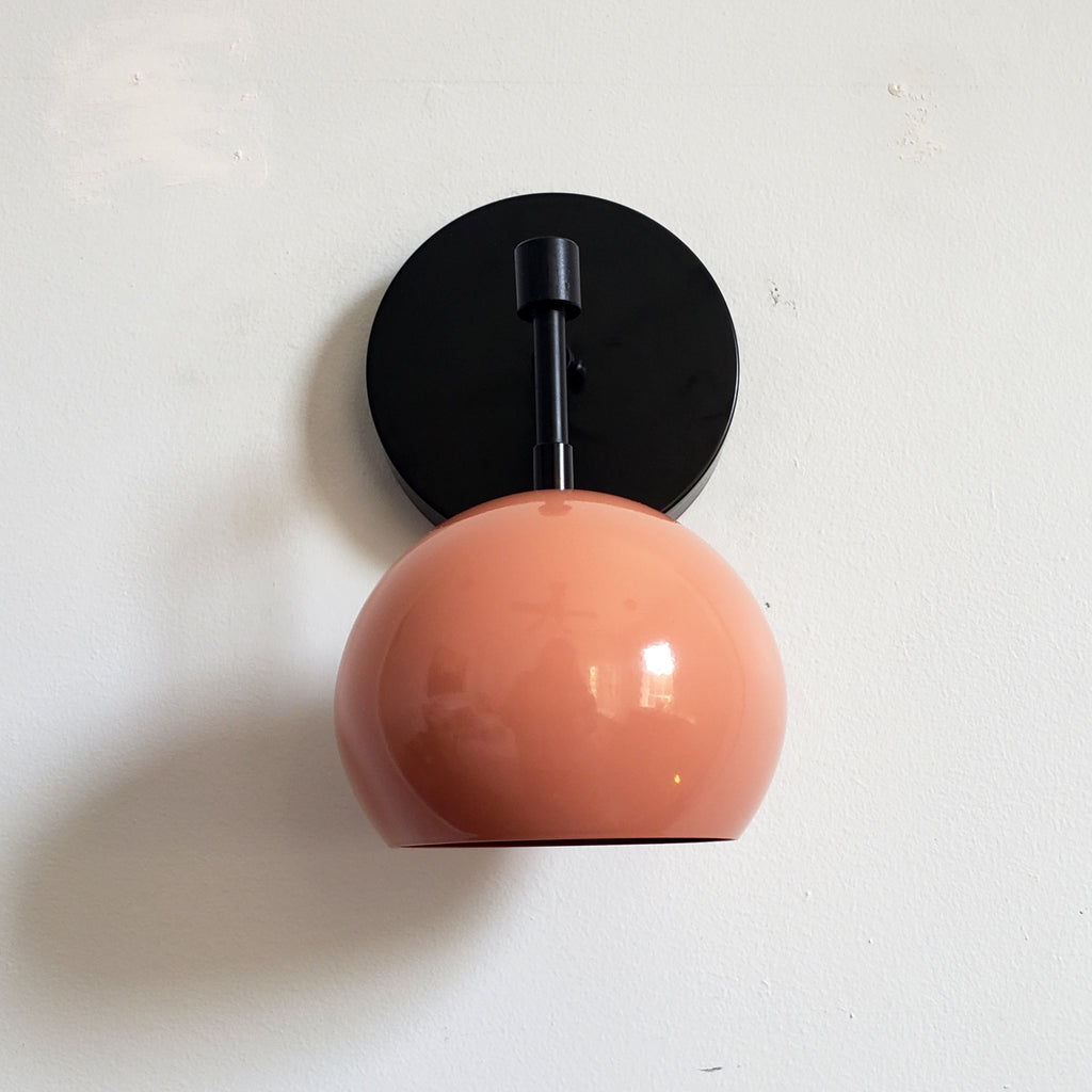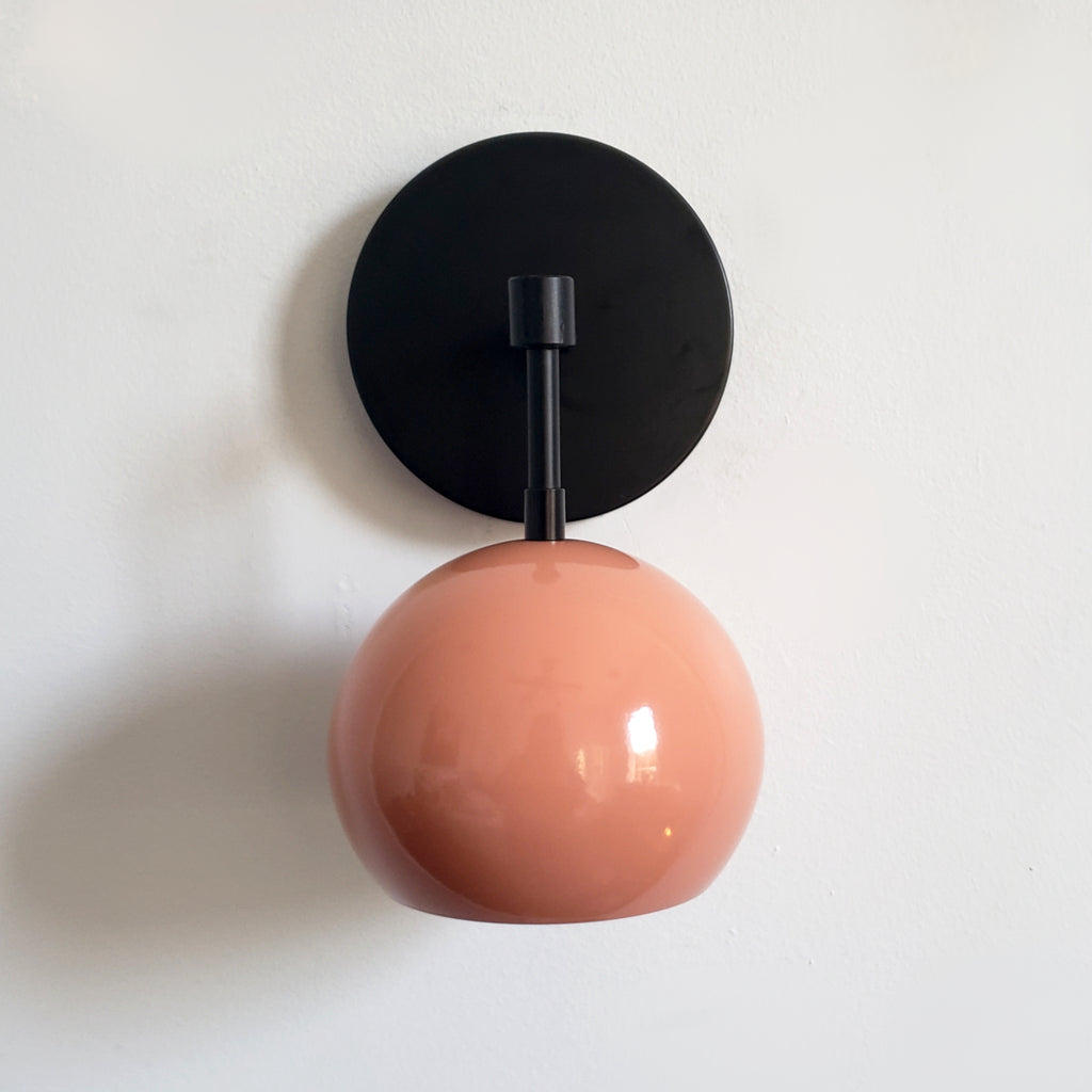 Beautiful mid-century modern inspired sconce featuring a globe-shaped Terra Cotta colored shade with complimentary metal finish of either brass or chrome.  This simple sconce can work as accent lighting, bathroom, lighting, or to illuminate wall art. This sconce features one E26 / medium screw base socket.