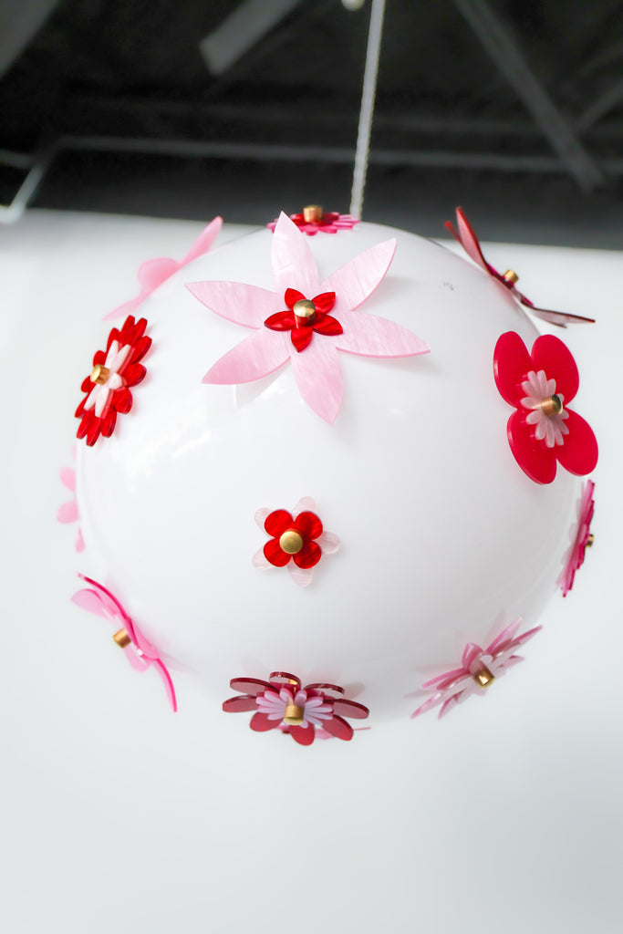 The Pink and Red Blossom Chandelier is basically a glowing flower bouquet in light fixture form. Built around a 16" white globe, it’s covered in layers of acrylic petals we cut in-house, with a mix of transparencies so some blooms read soft and sheer while others pop bold and glossy. A few of the petals are heat-curved, which gives the whole piece more movement and dimension, like the flowers are gently lifting off the globe instead of sitting flat.