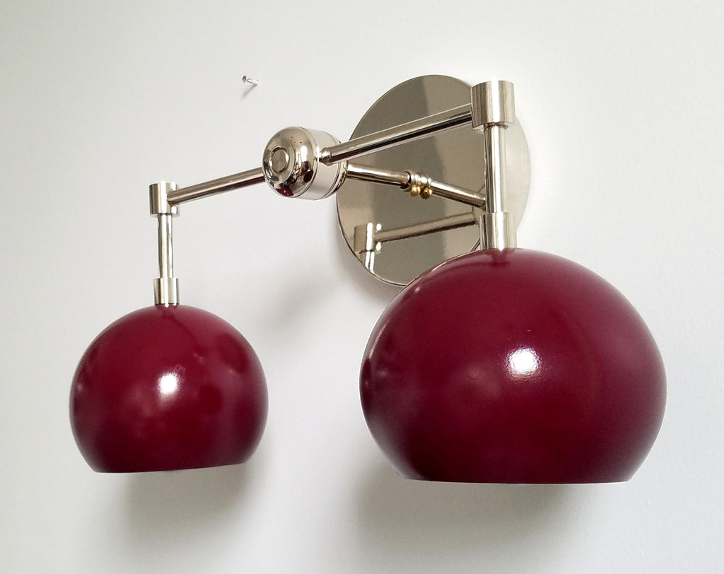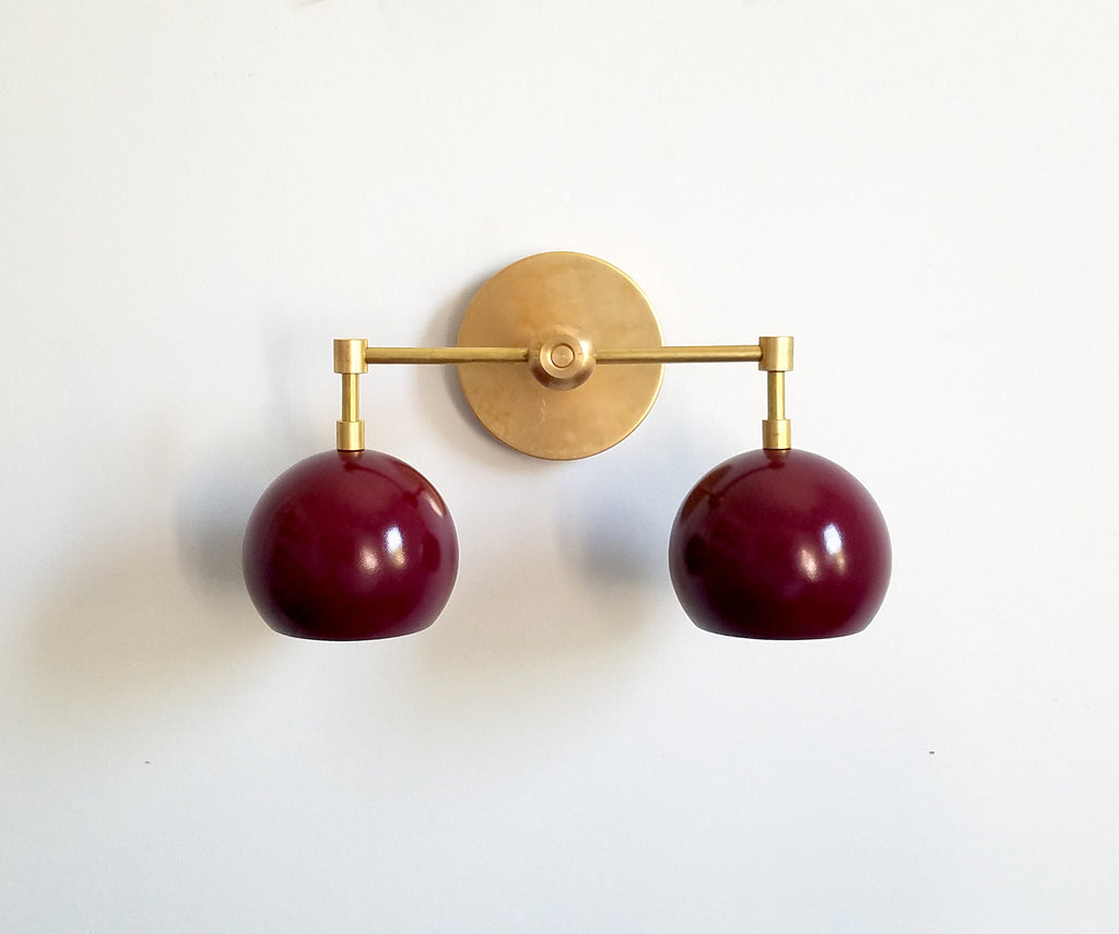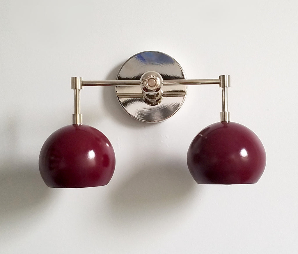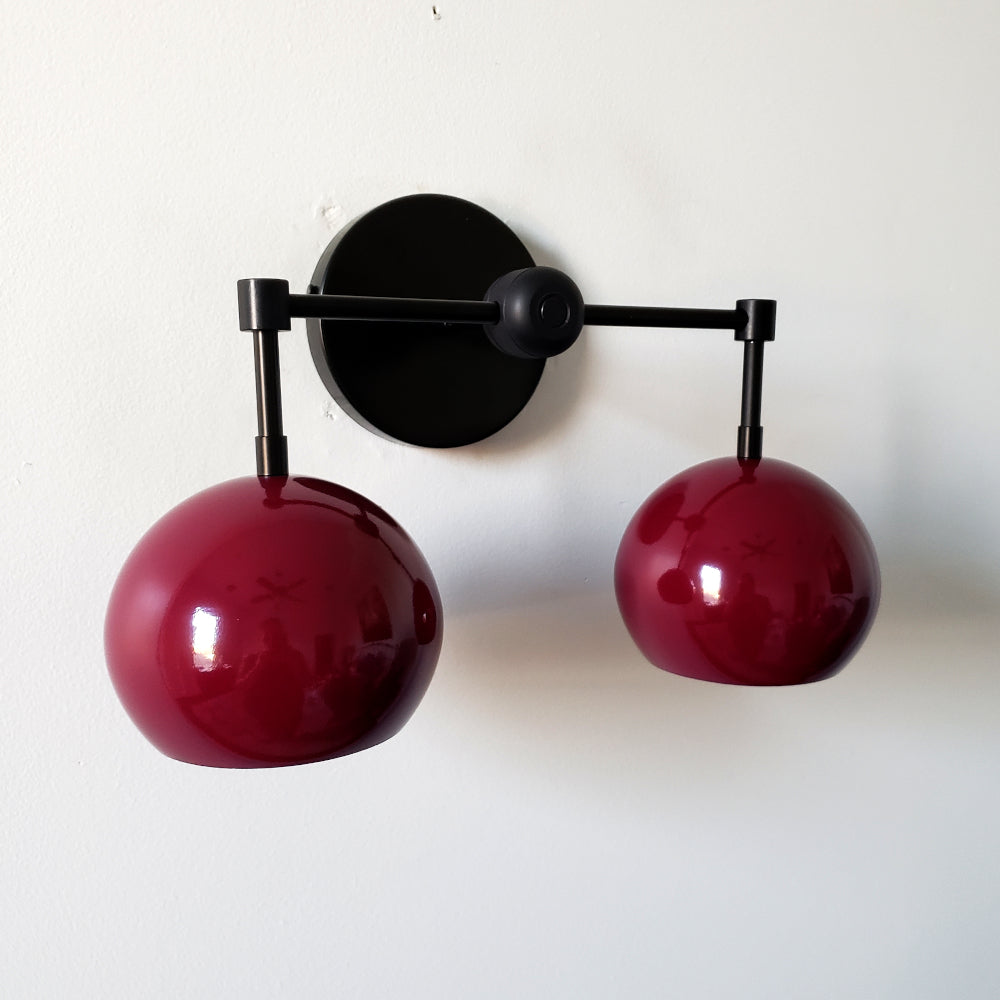The Double Loa Sconce has a simple, minimalist design that can be fun or modern. Either way, it is bound to garner loads of compliments. This fixture is a two-light version of our single Loa sconce. The shades are globe-shaped and finished in a Black Cherry Enamel.