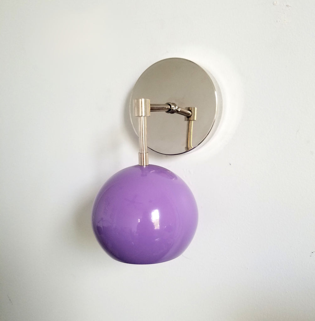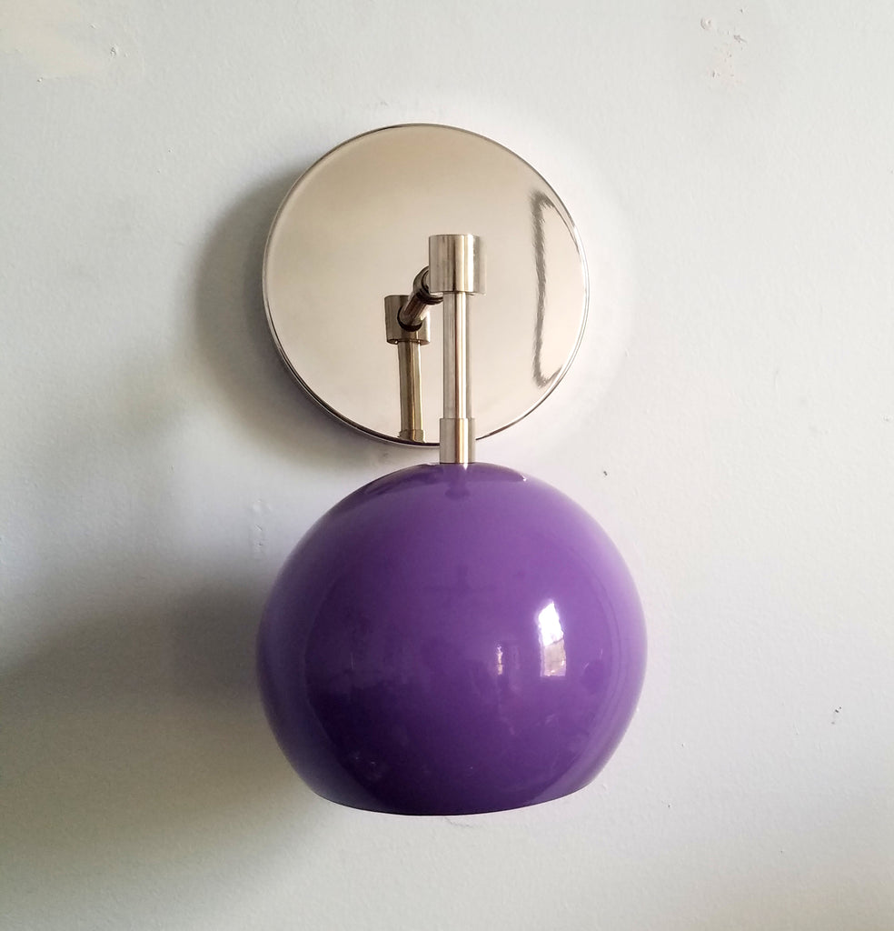 Beautiful mid-century modern inspired sconce featuring a globe-shaped orchid colored shade with complimentary metal finish of either brass or chrome. This simple sconce can work as accent lighting, bathroom, lighting, or to illuminate wall art. This sconce features one E26 / medium screw base socket.