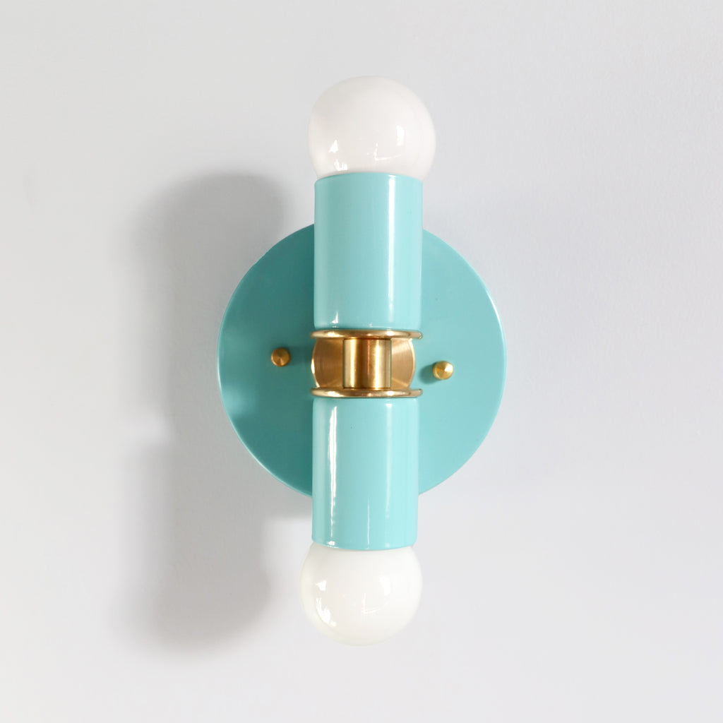 The Small Thalia Sconce is one of our best-selling light fixtures, loved for its bold use of color and compact, versatile design. Named after the Greek Muse of comedy, the Thalia brings playful energy to any interior while maintaining a timeless look with brass detailing. This two-light fixture works beautifully as a wall sconce or flush mount ceiling light and can be installed vertically or horizontally for maximum flexibility. Its vibrant powder-coated finish makes it ideal for adding a pop of color to powder rooms, hallways, entryways, or other small spaces that need stylish, high-impact modern lighting.