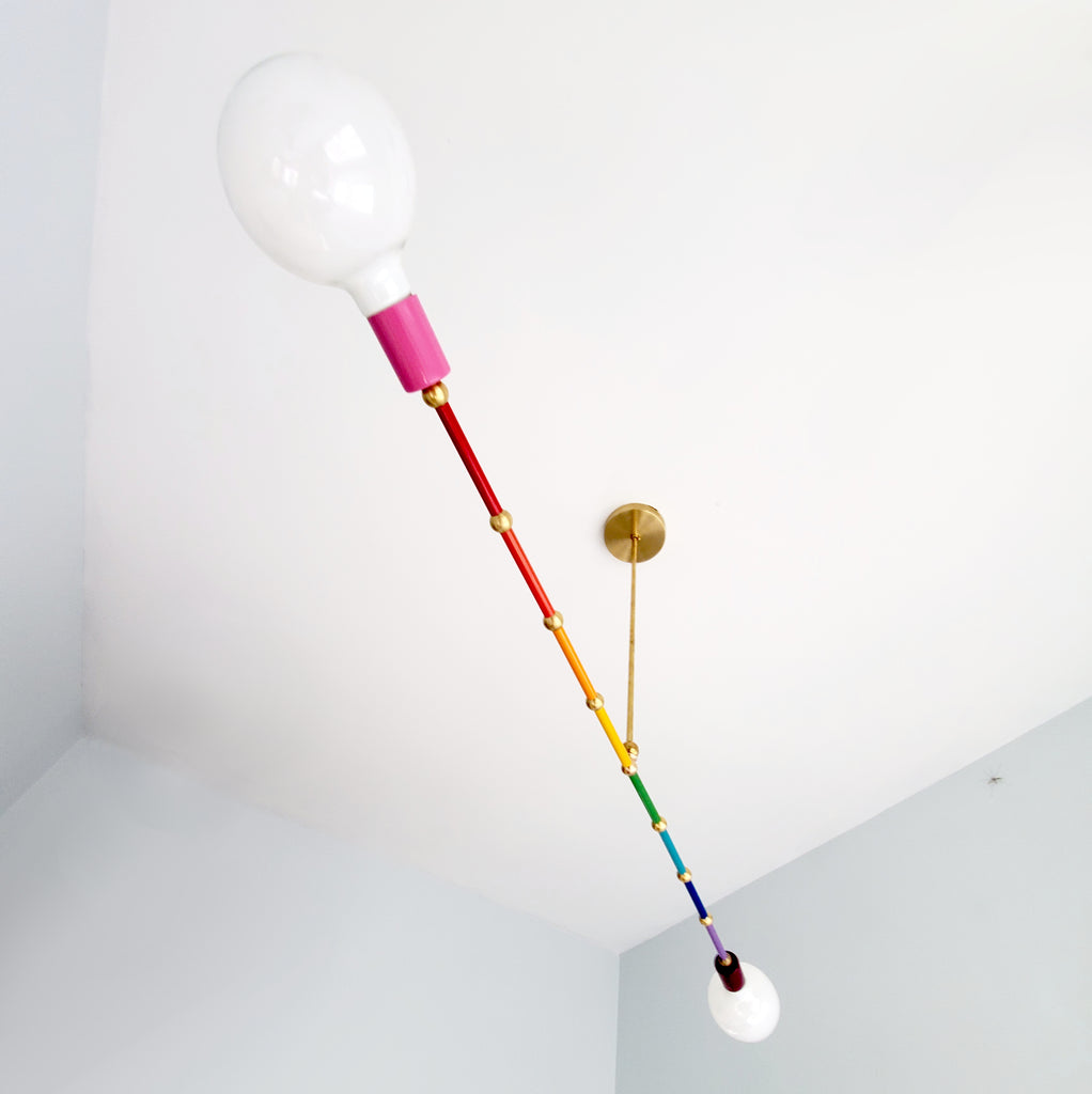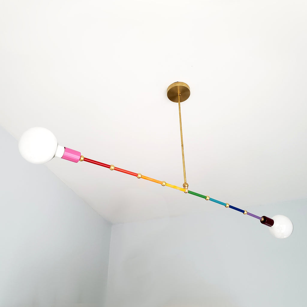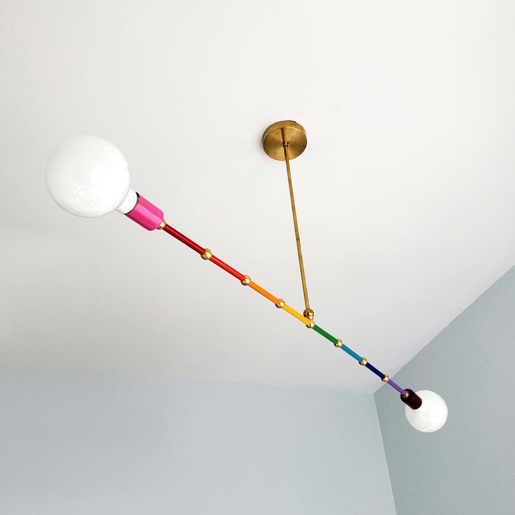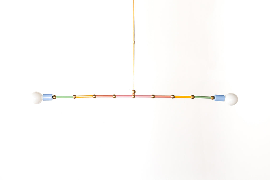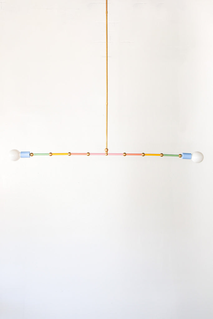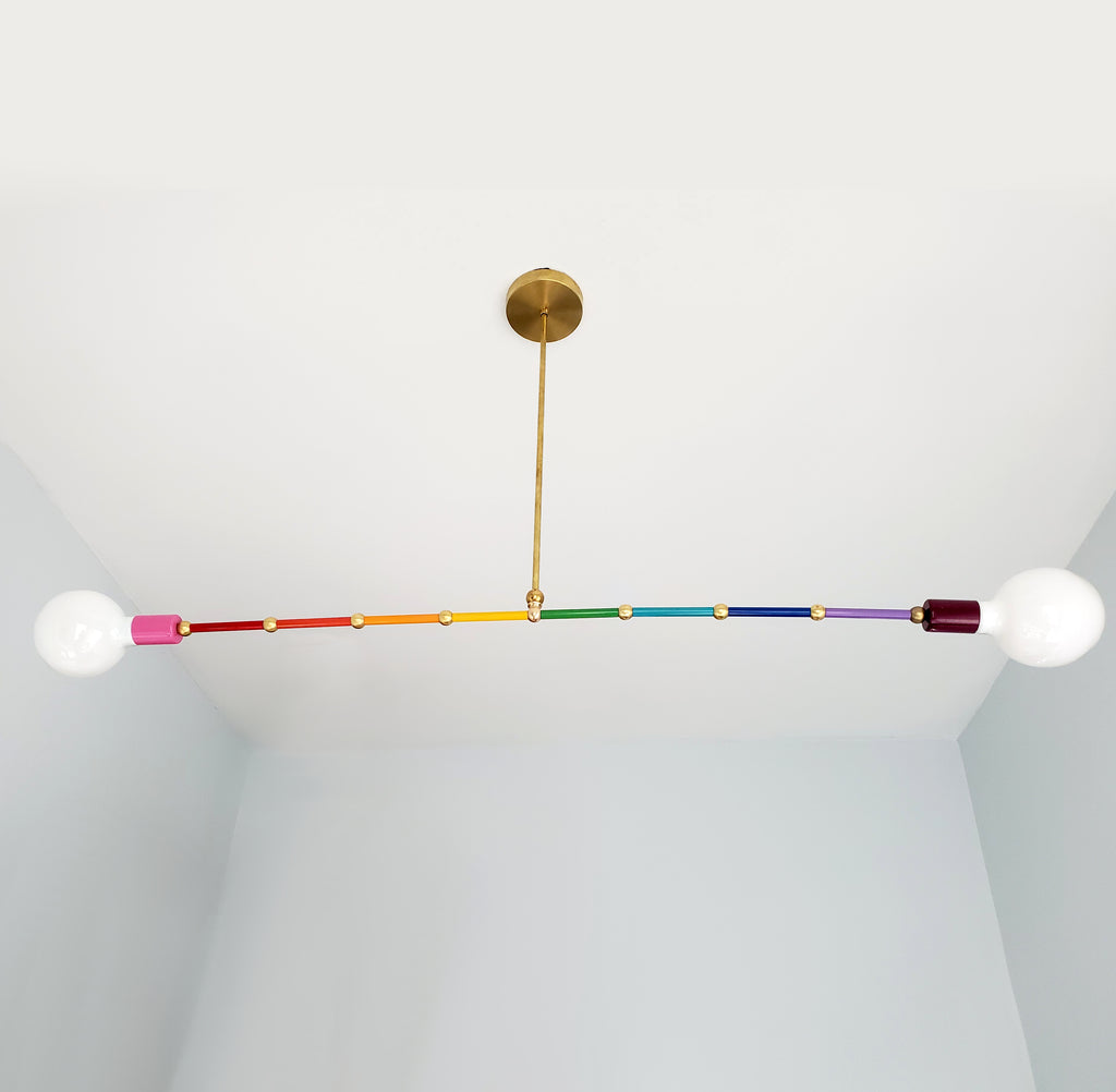Anything goes with color in the Oz chandelier. Although the shape is subtle, the color is the main star of the show. The elongated shape makes it the perfect candidate for narrow dining rooms, studios, and more. Small brass balls separate each color. Multiple downrod lengths are available for this fixture. Four inches is the recommended length for flushmount style fixtures.