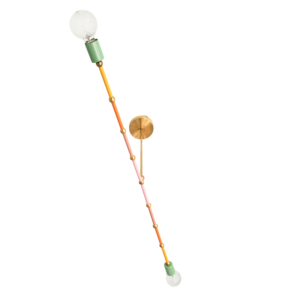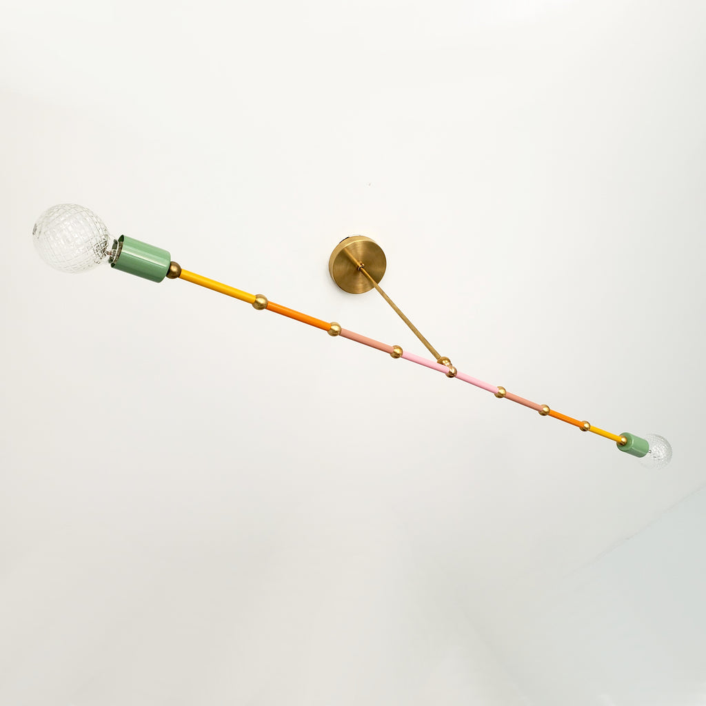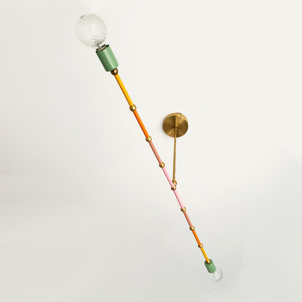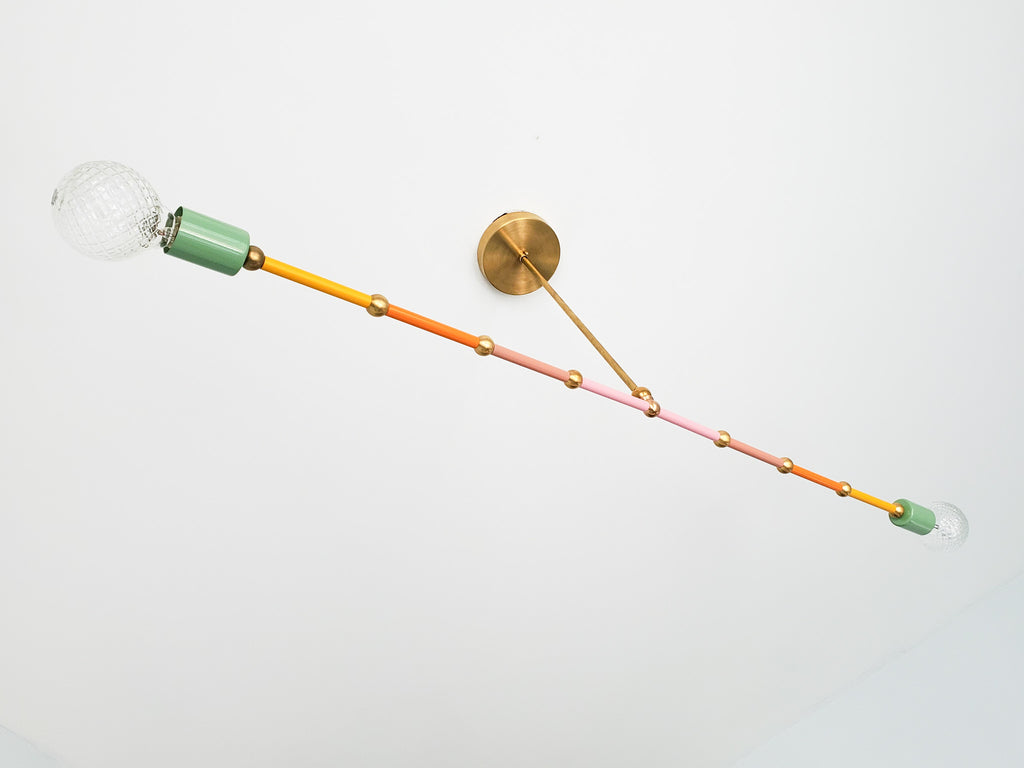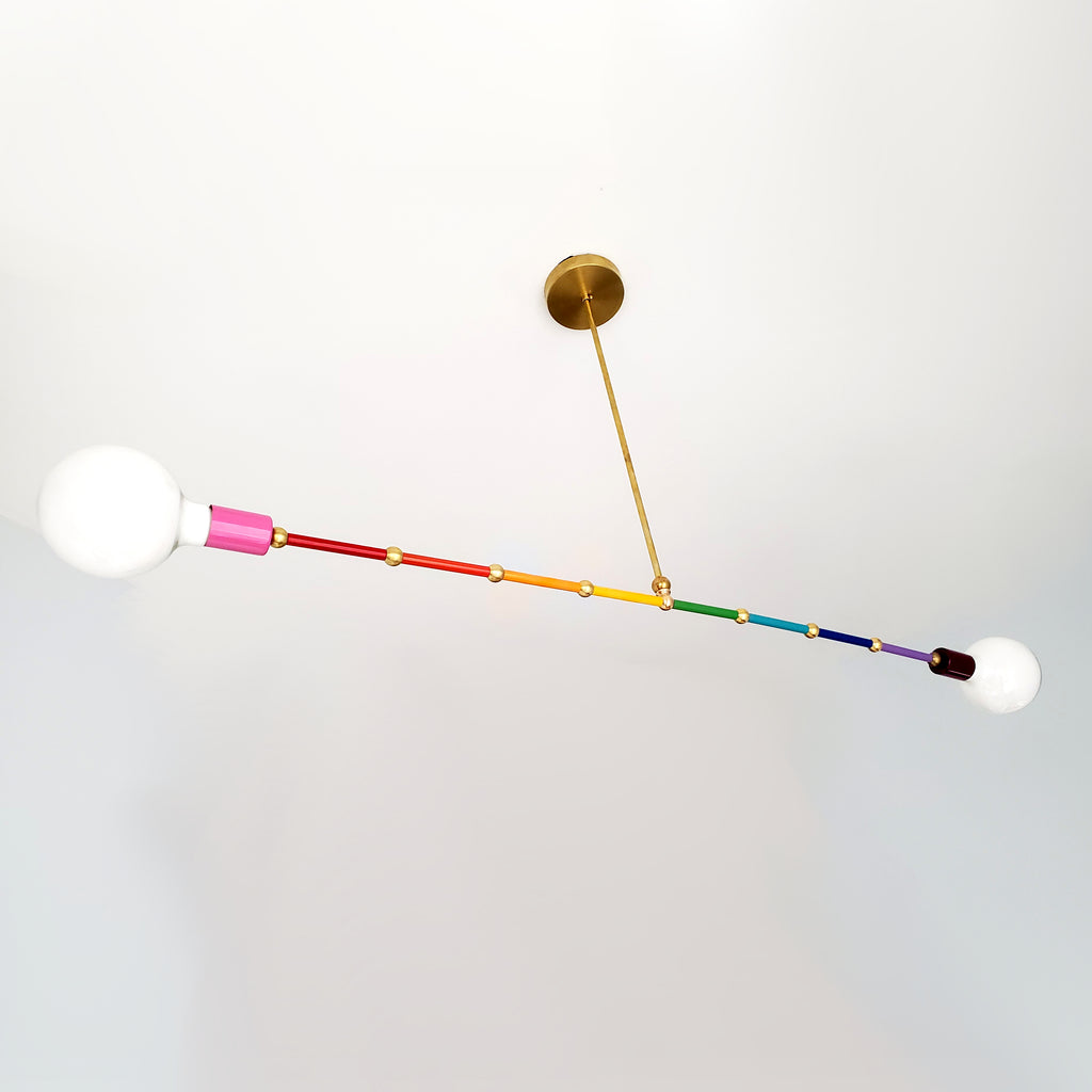 Anything goes with color in the Oz chandelier. Although the shape is subtle, the color is the main star of the show. The elongated shape makes it the perfect candidate for narrow dining rooms, studios, and more. Small brass balls separate each color. Multiple downrod lengths are available for this fixture. Four inches is the recommended length for flushmount style fixtures.