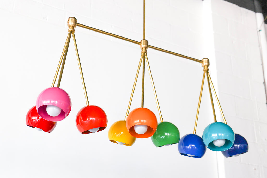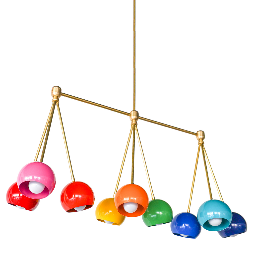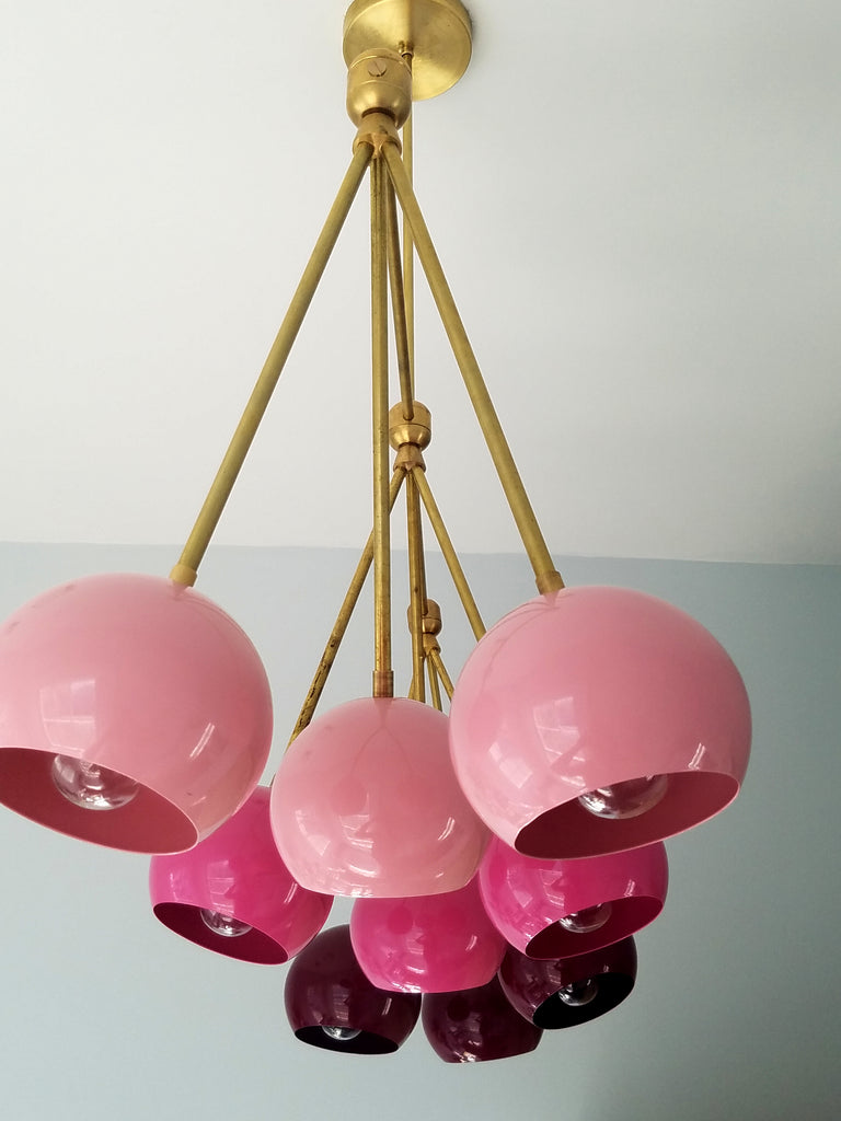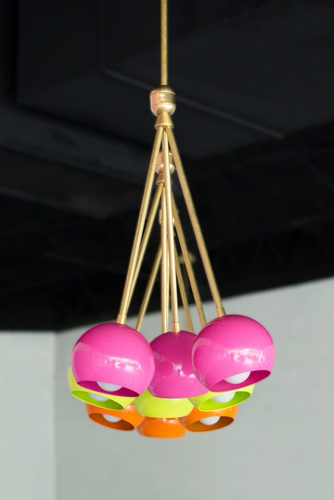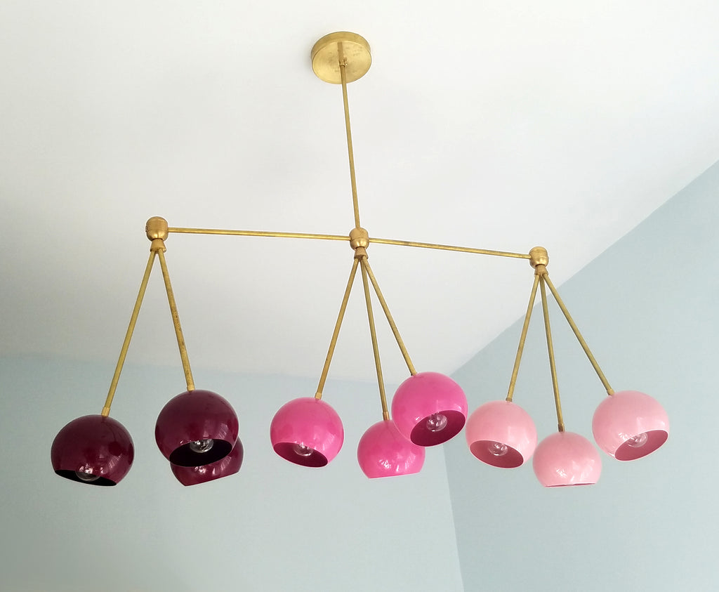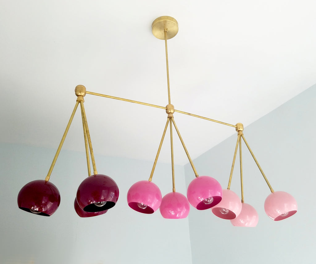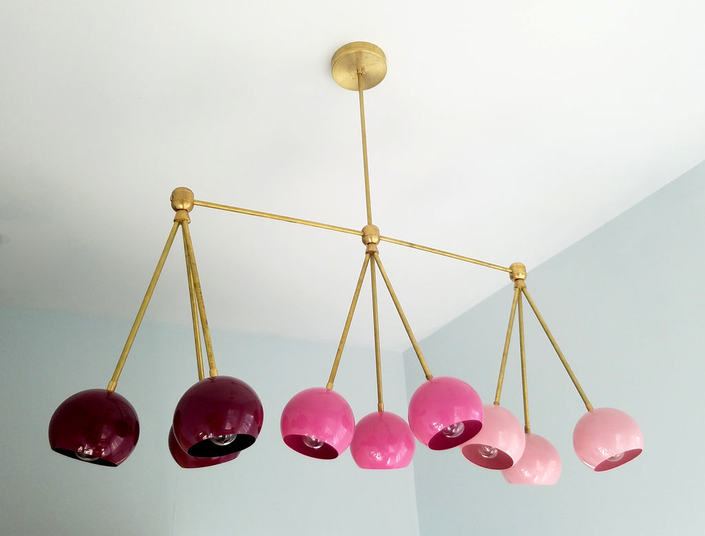 The Turmalina Chandelier is inspired by Italian mid-century Stilnovo fixtures and the prismatic colors of Tourmaline gemstones. This fixture features Loa shades in blush pink, doll pink, and black cherry or in neutral shades with a pop of Mermaid Green in the middle. With nine E26 or medium base sockets, this light can be either bright or seductively moody, depending on the bulb chosen. We love see the interior of the shades glow with color when the fixture lights up.