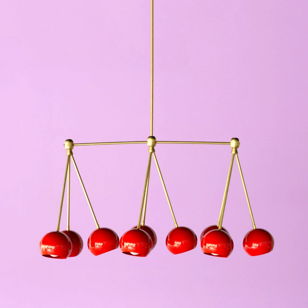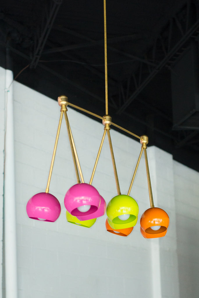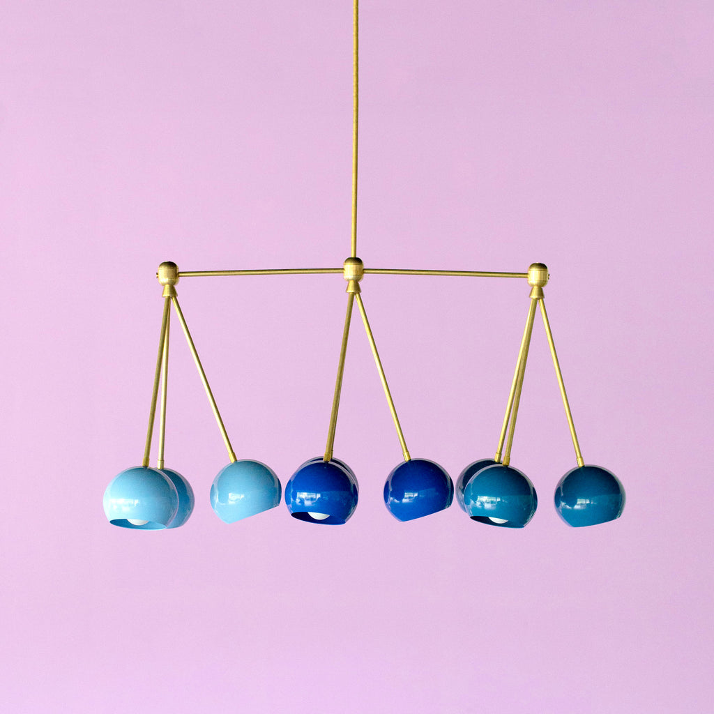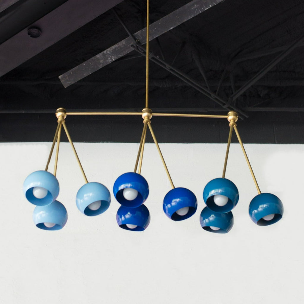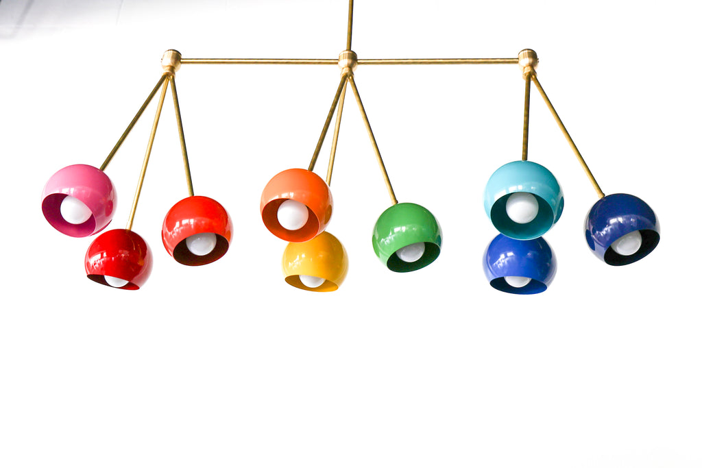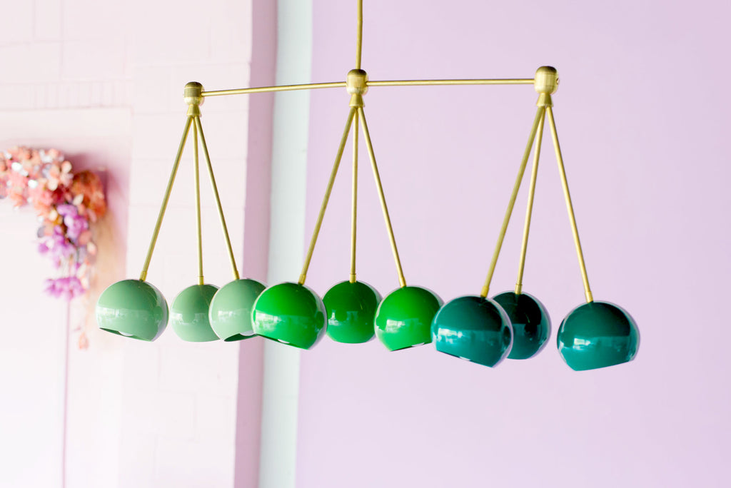 The Turmalina Chandelier is inspired by Italian mid-century Stilnovo fixtures and the prismatic colors of Tourmaline gemstones. This fixture features Loa shades in blush pink, doll pink, and black cherry or in neutral shades with a pop of Mermaid Green in the middle. With nine E26 or medium base sockets, this light can be either bright or seductively moody, depending on the bulb chosen. We love see the interior of the shades glow with color when the fixture lights up.