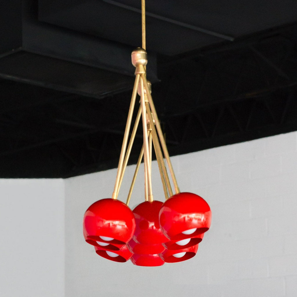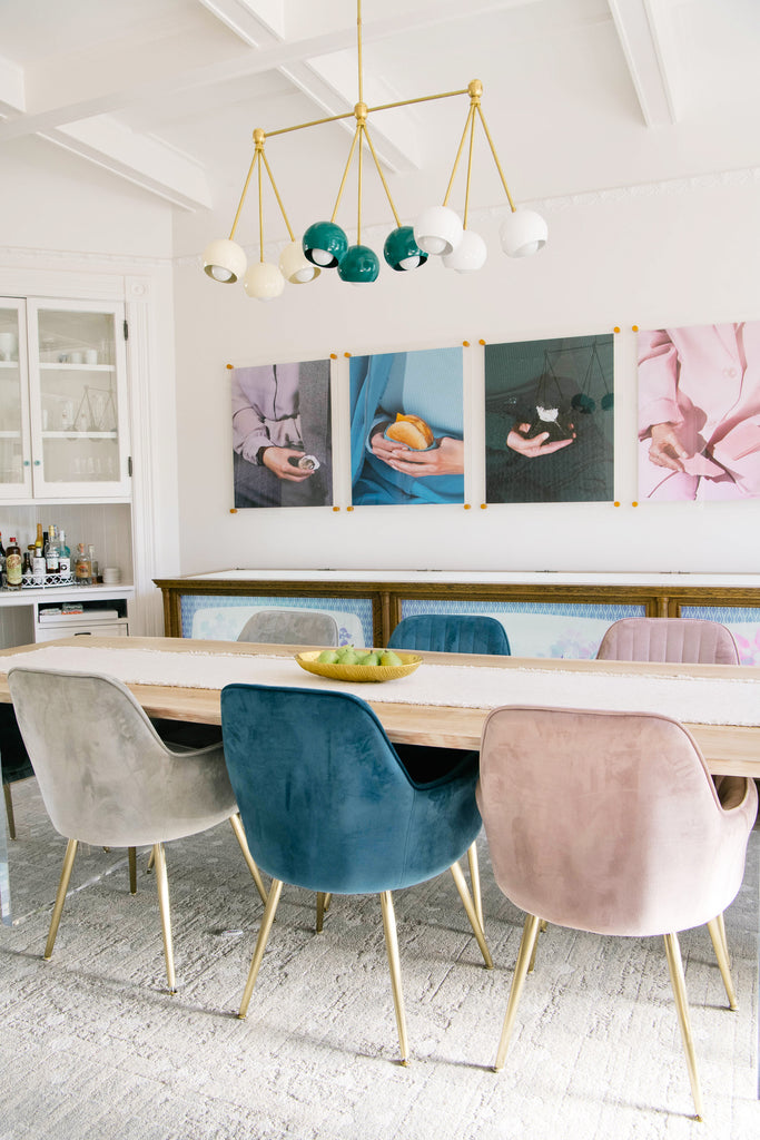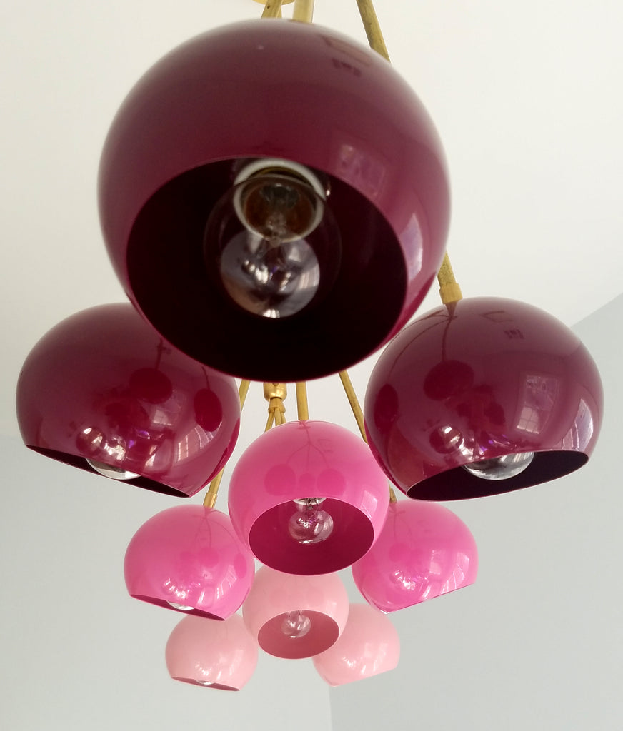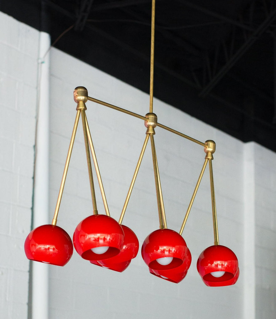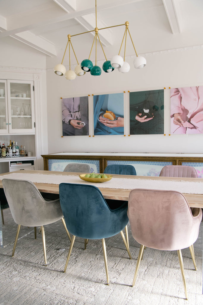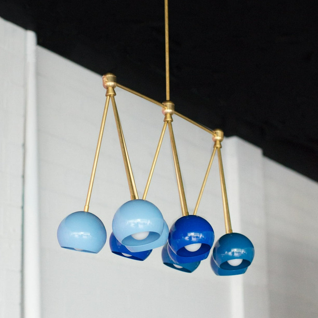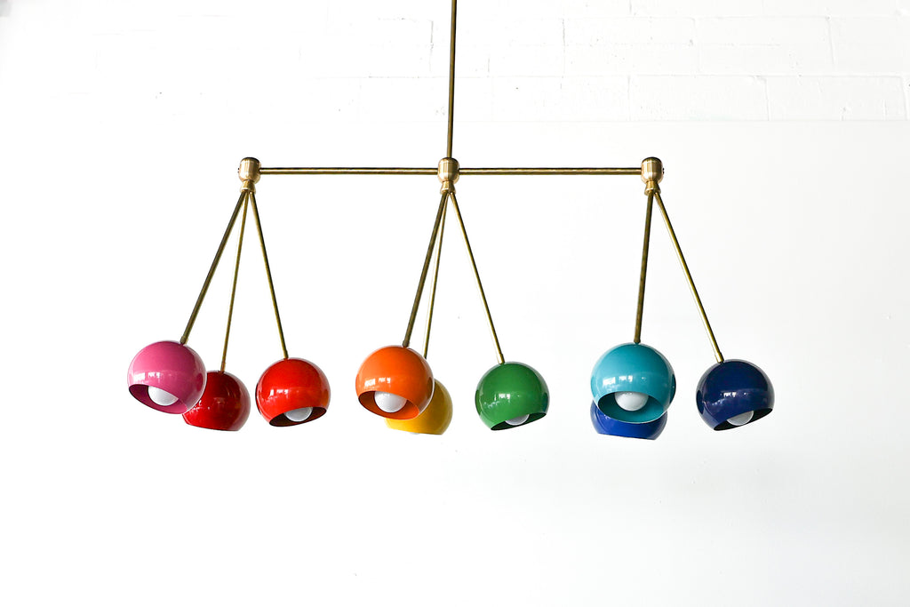 The Turmalina Chandelier is inspired by Italian mid-century Stilnovo fixtures and the prismatic colors of Tourmaline gemstones. This fixture features Loa shades in blush pink, doll pink, and black cherry or in neutral shades with a pop of Mermaid Green in the middle. With nine E26 or medium base sockets, this light can be either bright or seductively moody, depending on the bulb chosen. We love see the interior of the shades glow with color when the fixture lights up.