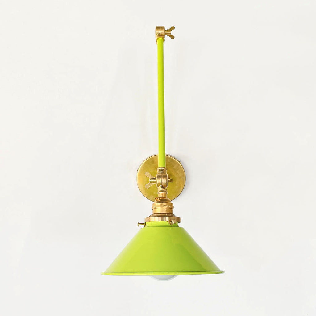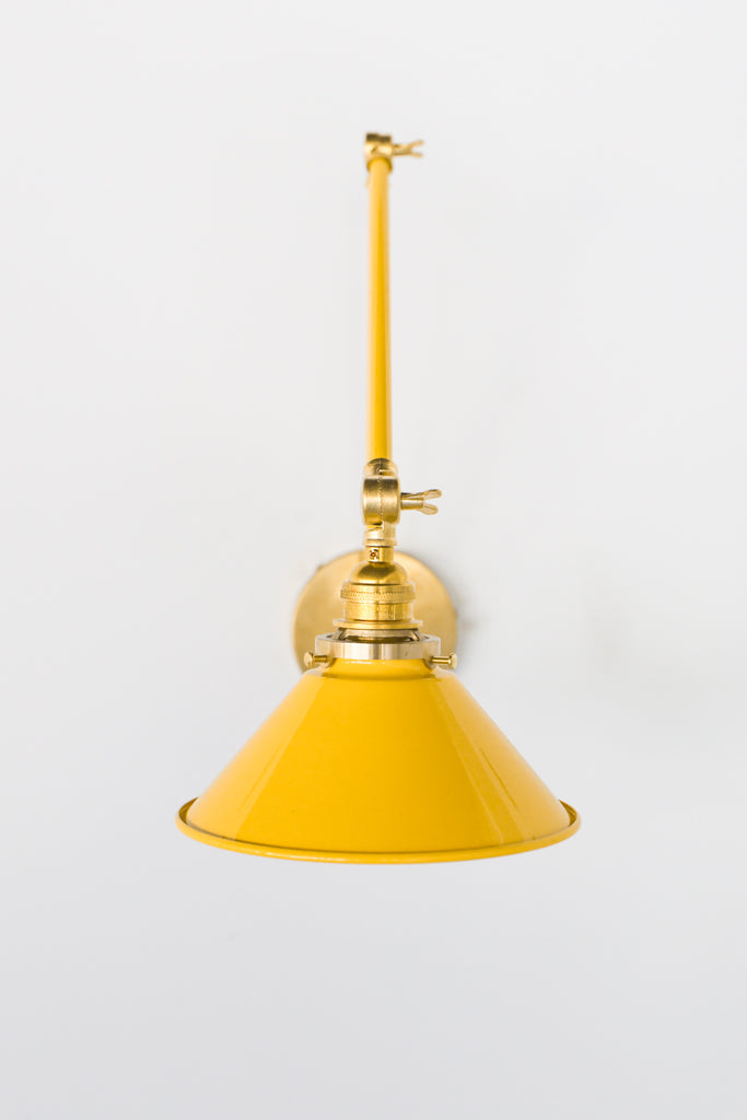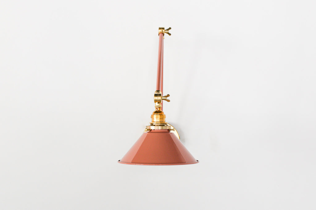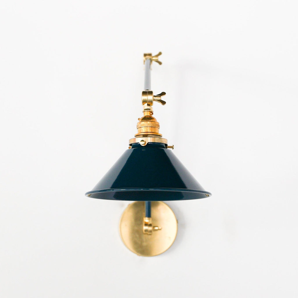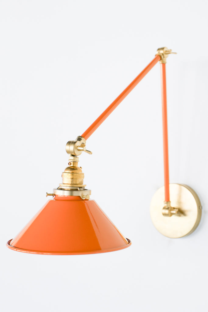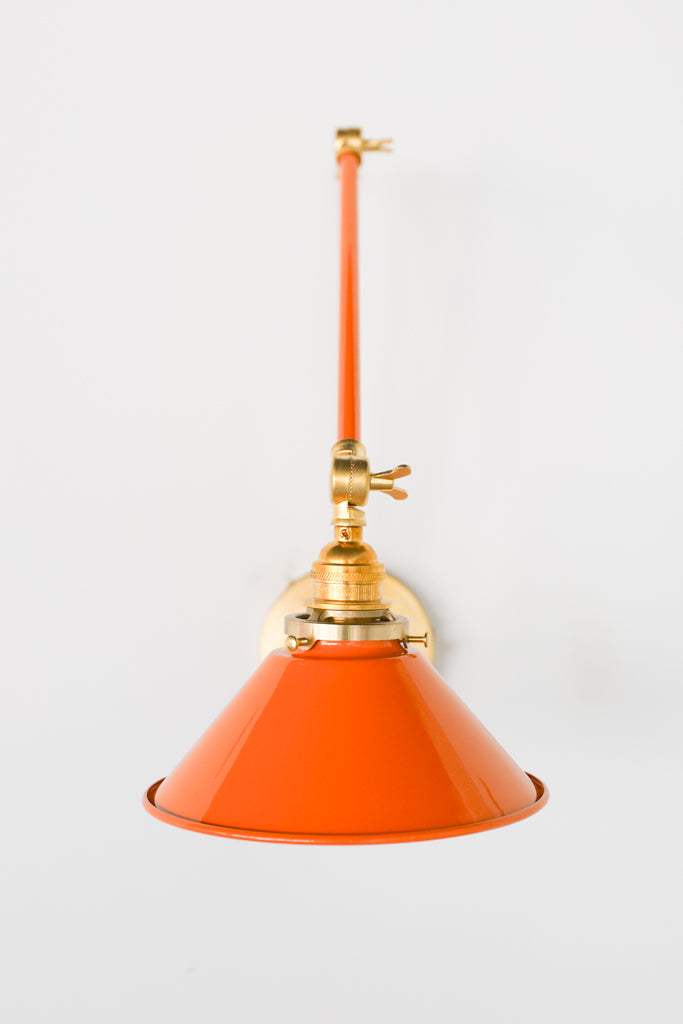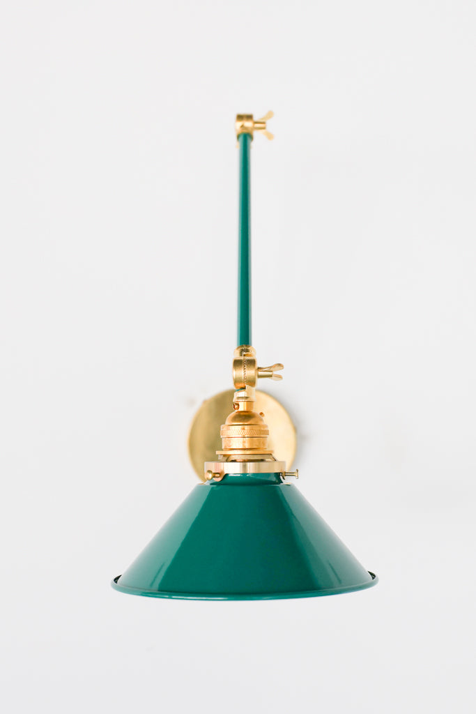 Channeling the timeless look of vintage pharmacy lamps, the Cora Adjustable Sconce adds a touch of industrial chic to your space. Featuring sleep lines and a classical conical shade, the versatile sconce goes beyond tradition with its range of modern finishes. It's available in our 30 curated colors, but we can also custom powder-coat it in any color you'd like. The metal portion can be made in raw brass, chrome, or powder-coated black.
