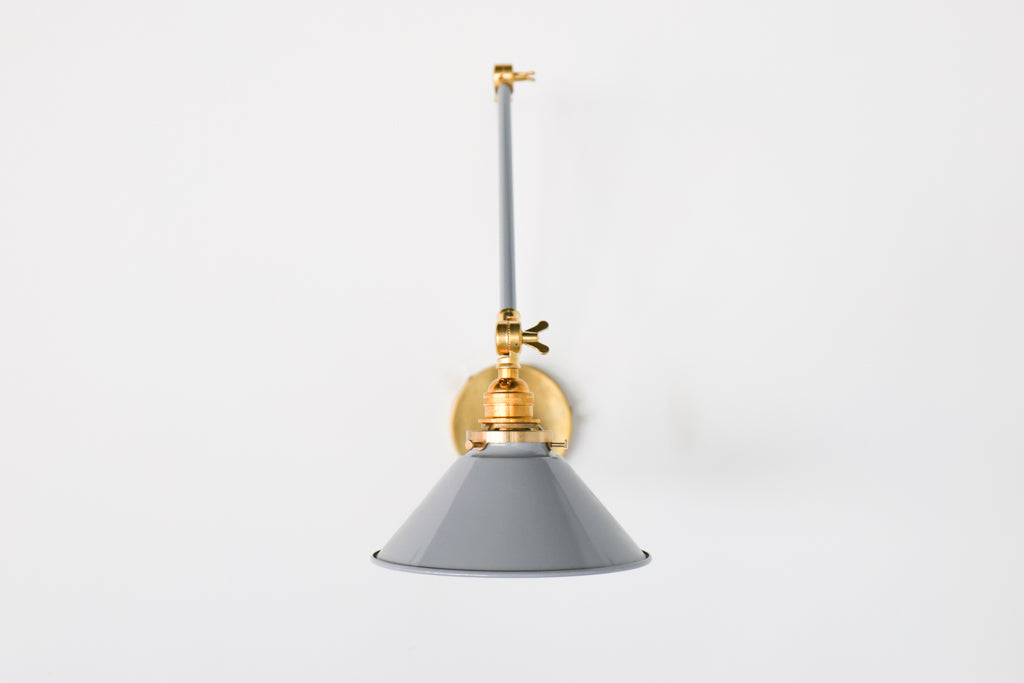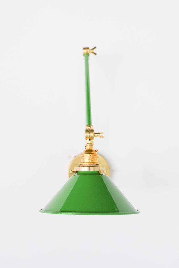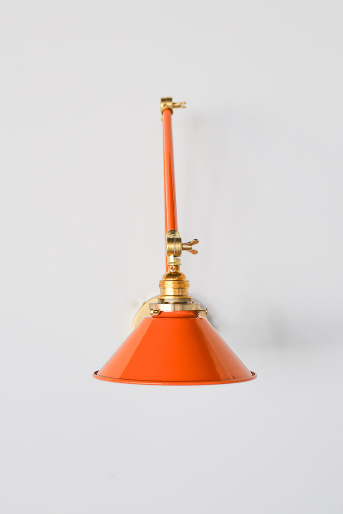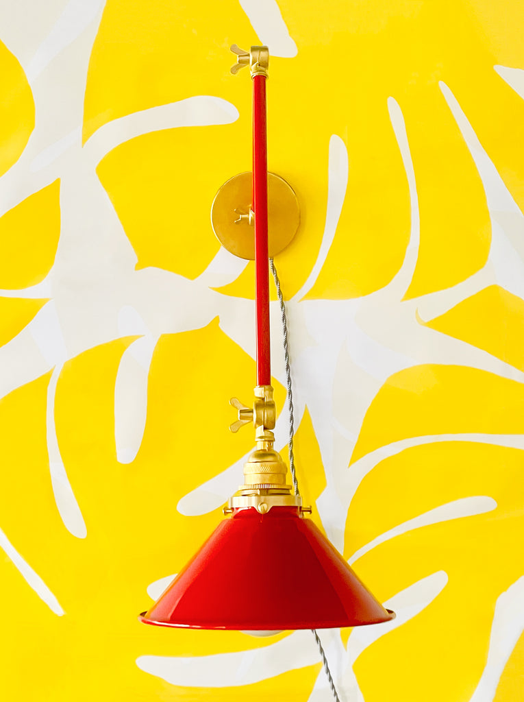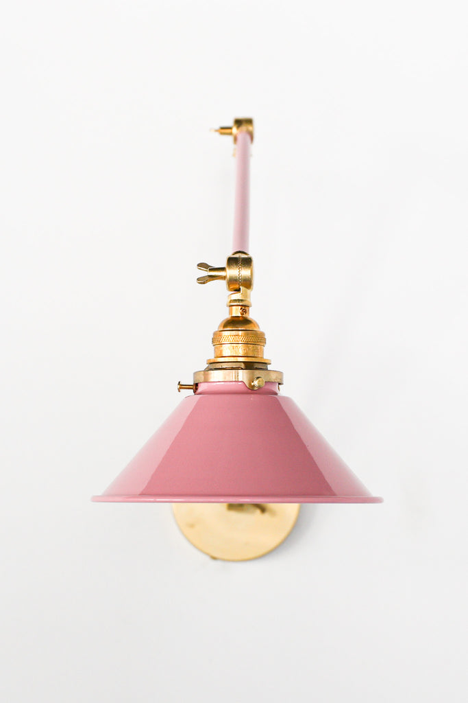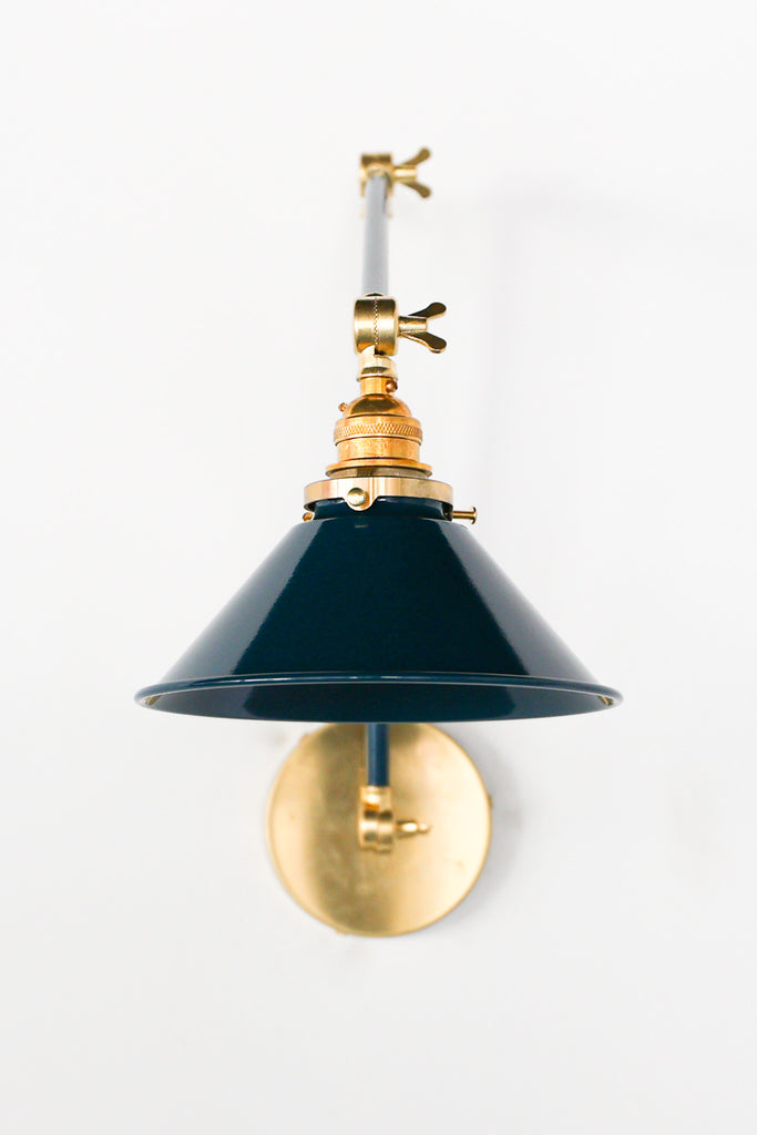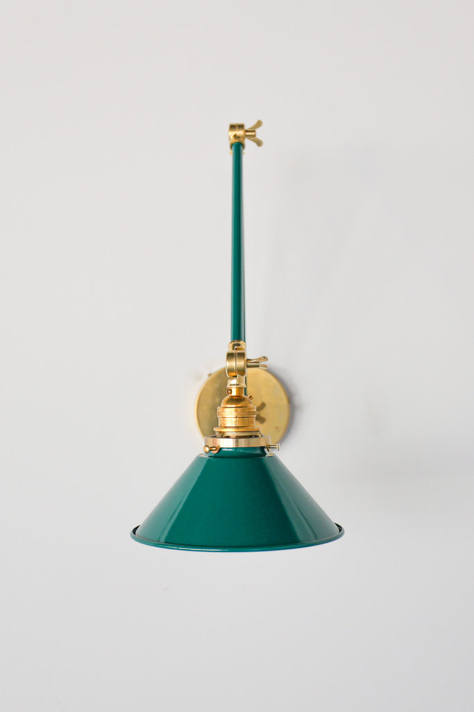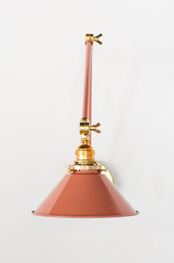 Channeling the timeless look of vintage pharmacy lamps, the Cora Adjustable Sconce adds a touch of industrial chic to your space. Featuring sleep lines and a classical conical shade, the versatile sconce goes beyond tradition with its range of modern finishes. It's available in our 30 curated colors, but we can also custom powder-coat it in any color you'd like. The metal portion can be made in raw brass, chrome, or powder-coated black.