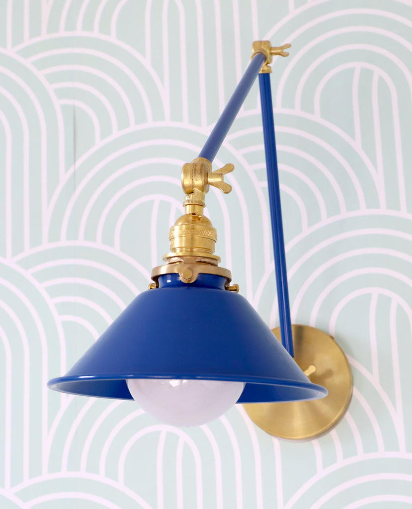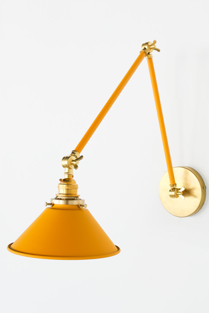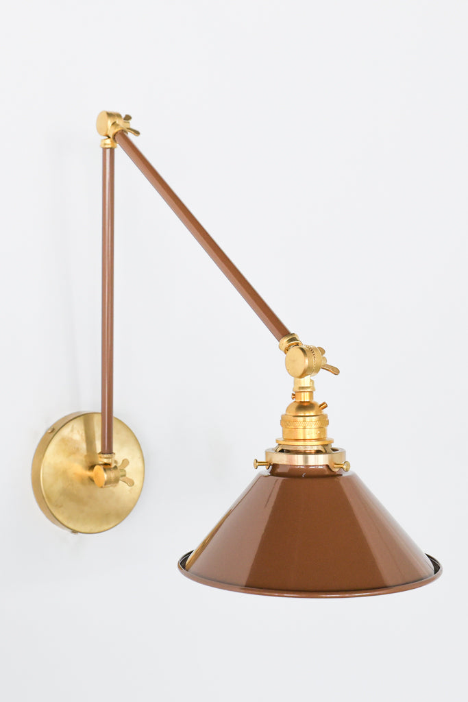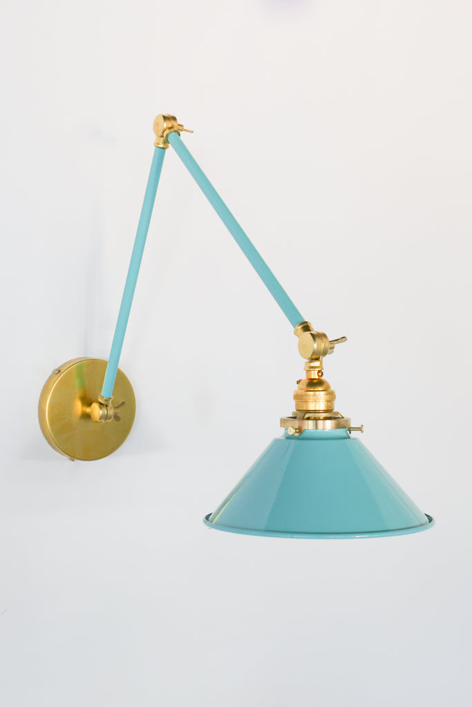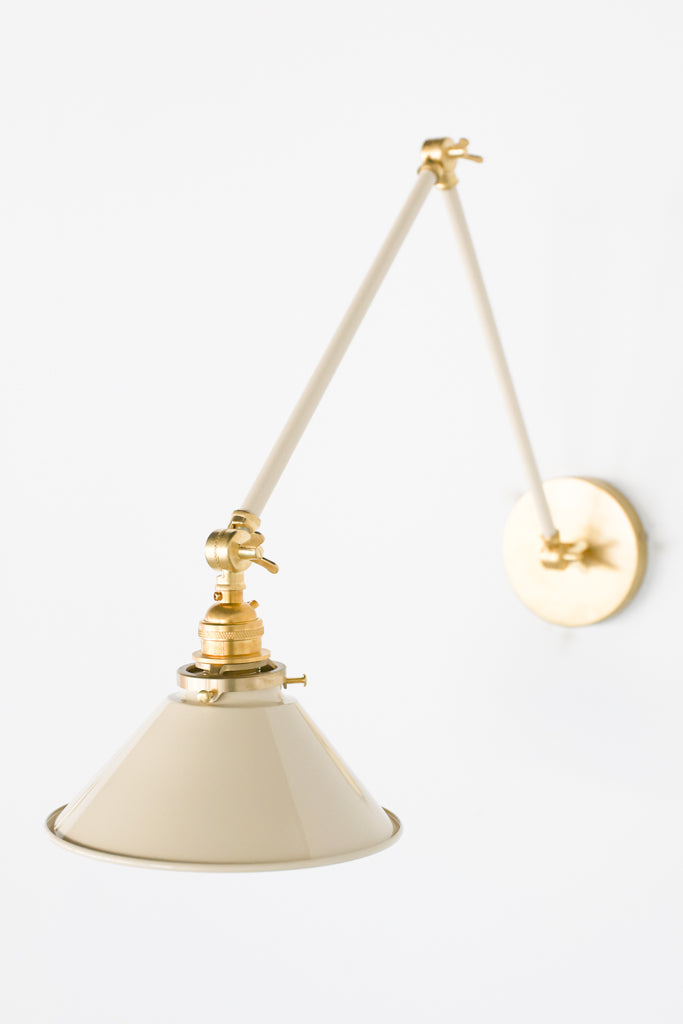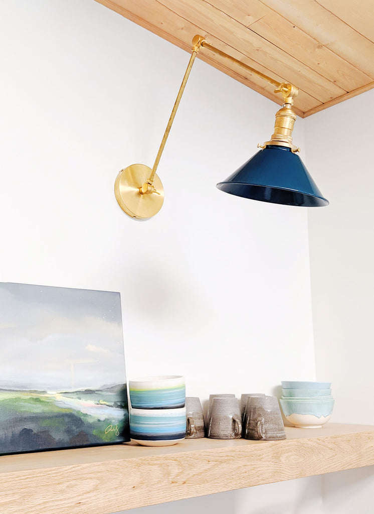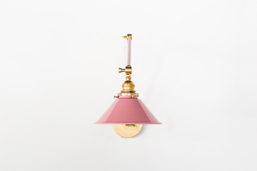 Channeling the timeless look of vintage pharmacy lamps, the Cora Adjustable Sconce adds a touch of industrial chic to your space. Featuring sleep lines and a classical conical shade, the versatile sconce goes beyond tradition with its range of modern finishes. It's available in our 30 curated colors, but we can also custom powder-coat it in any color you'd like. The metal portion can be made in raw brass, chrome, or powder-coated black.