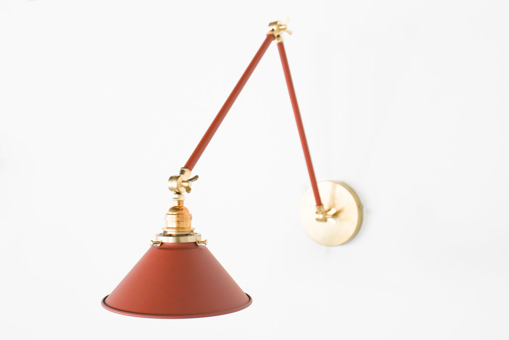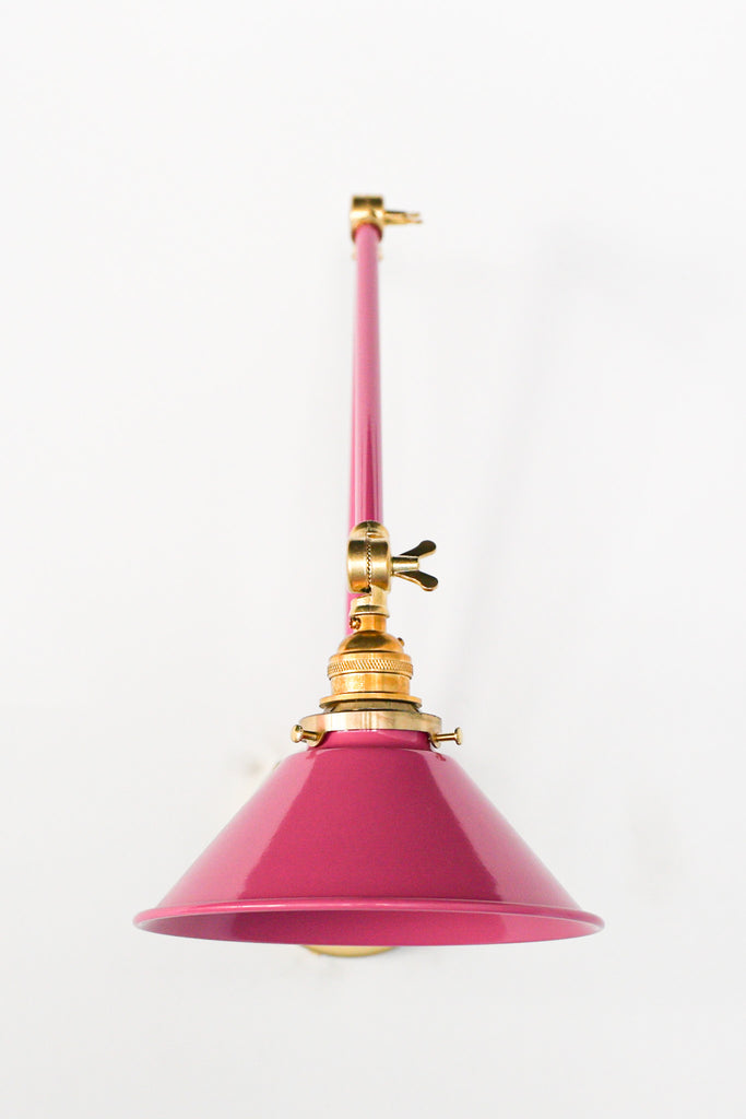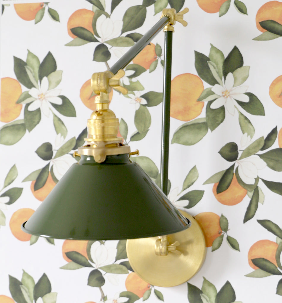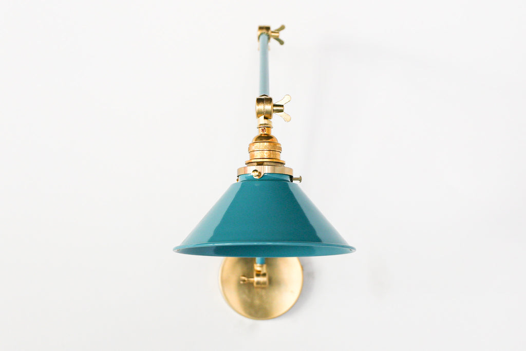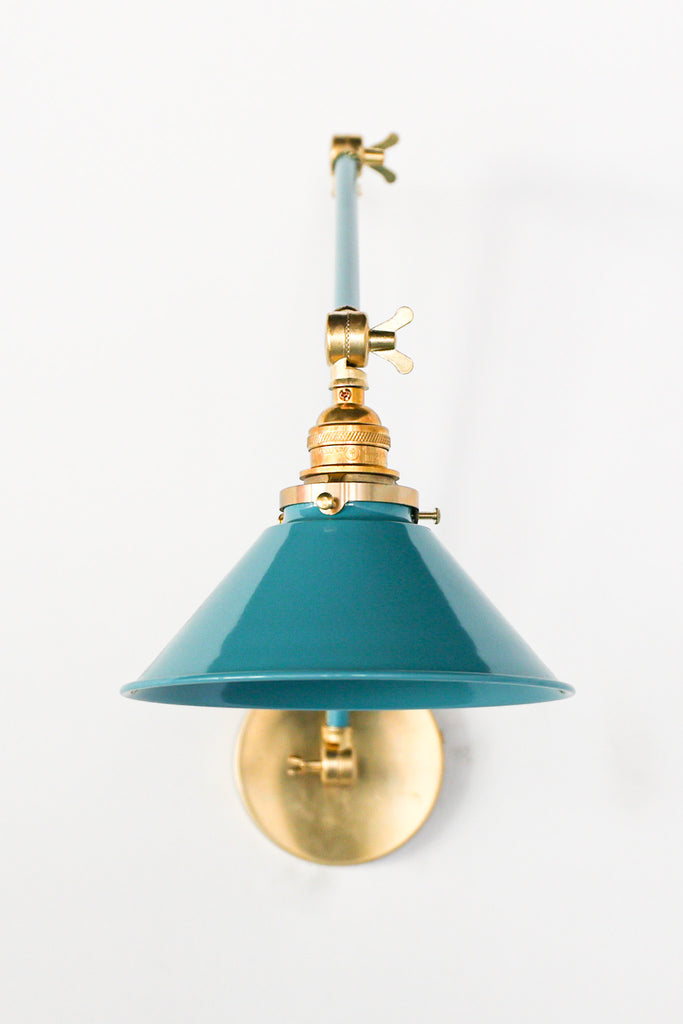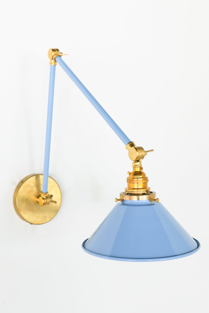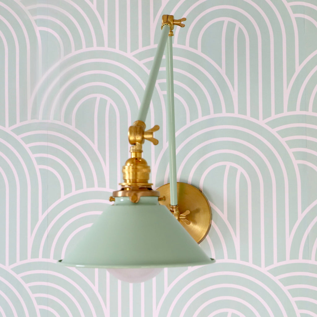 Channeling the timeless look of vintage pharmacy lamps, the Cora Adjustable Sconce adds a touch of industrial chic to your space. Featuring sleep lines and a classical conical shade, the versatile sconce goes beyond tradition with its range of modern finishes. It's available in our 30 curated colors, but we can also custom powder-coat it in any color you'd like. The metal portion can be made in raw brass, chrome, or powder-coated black.