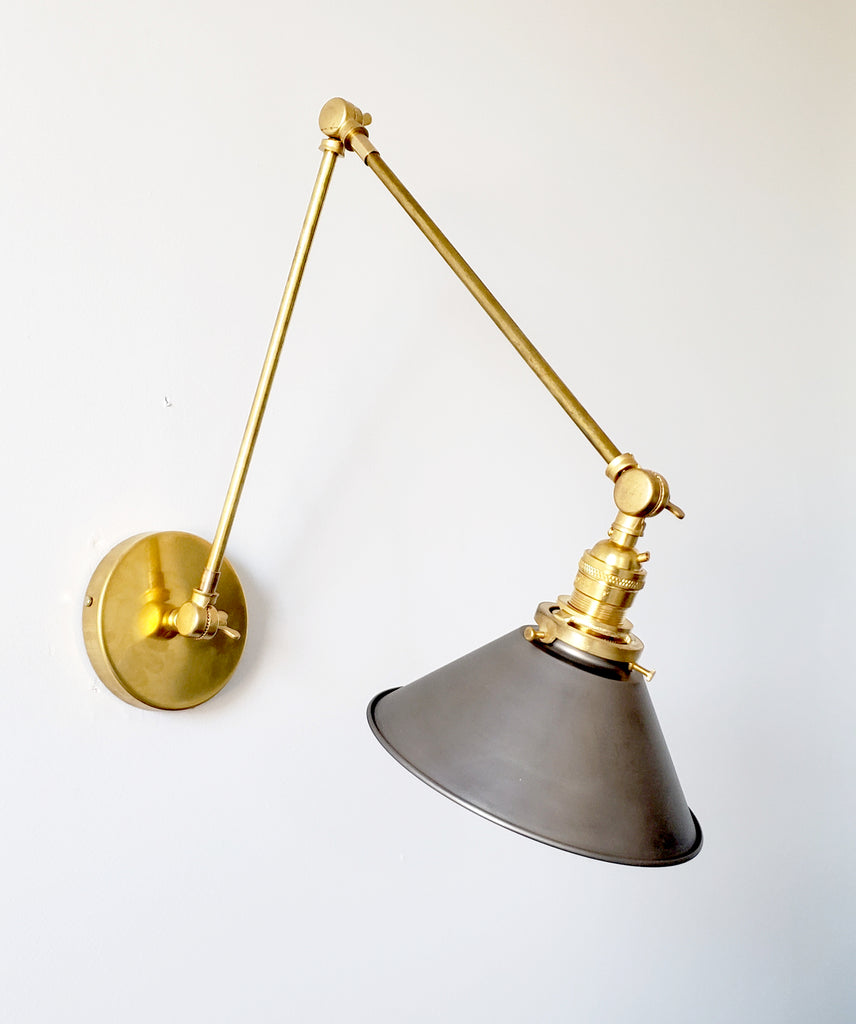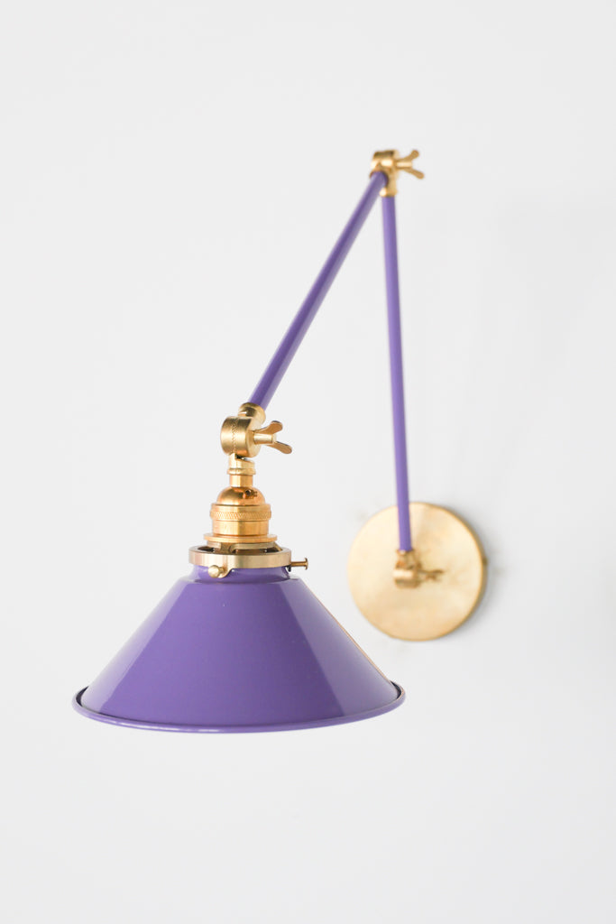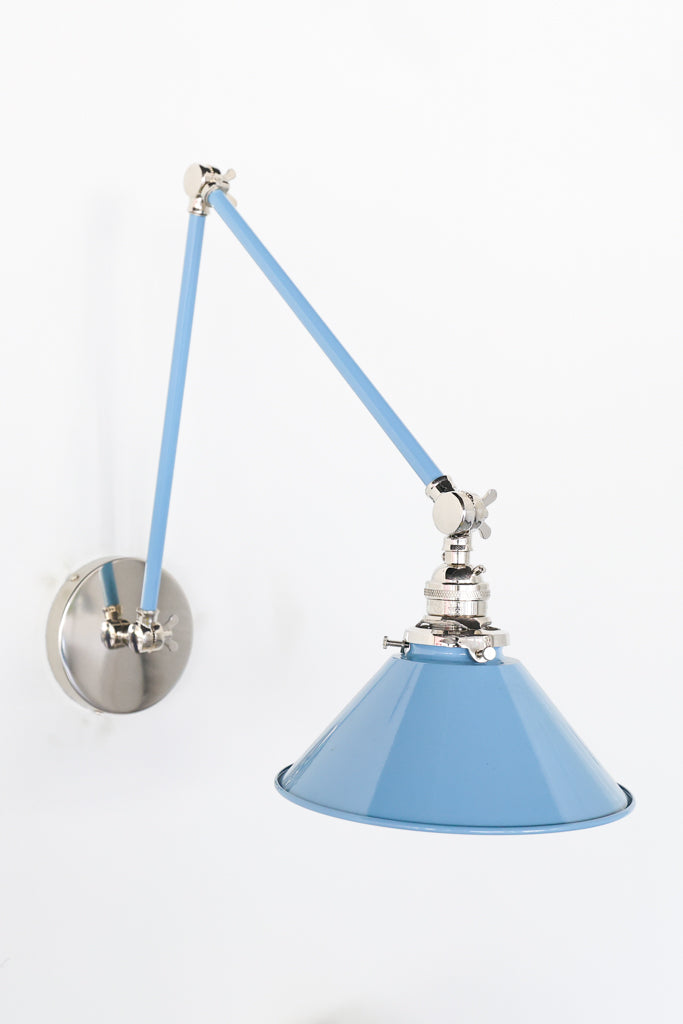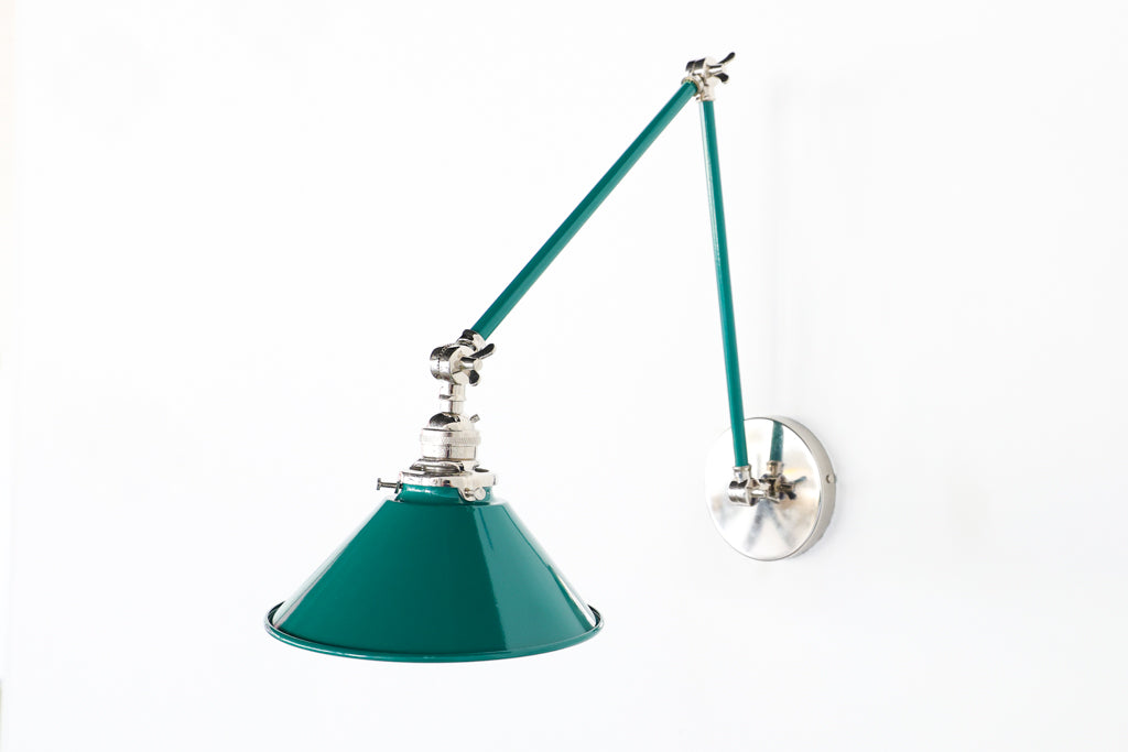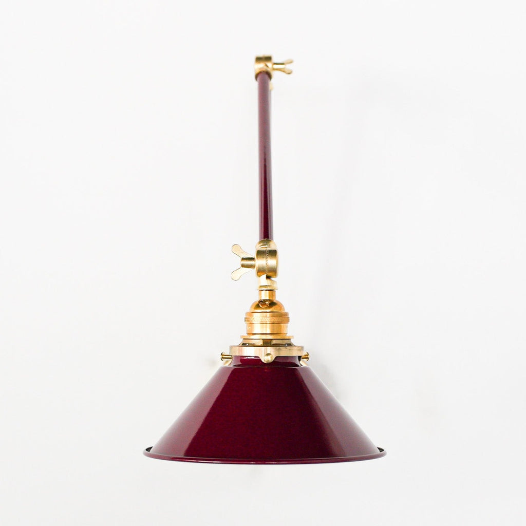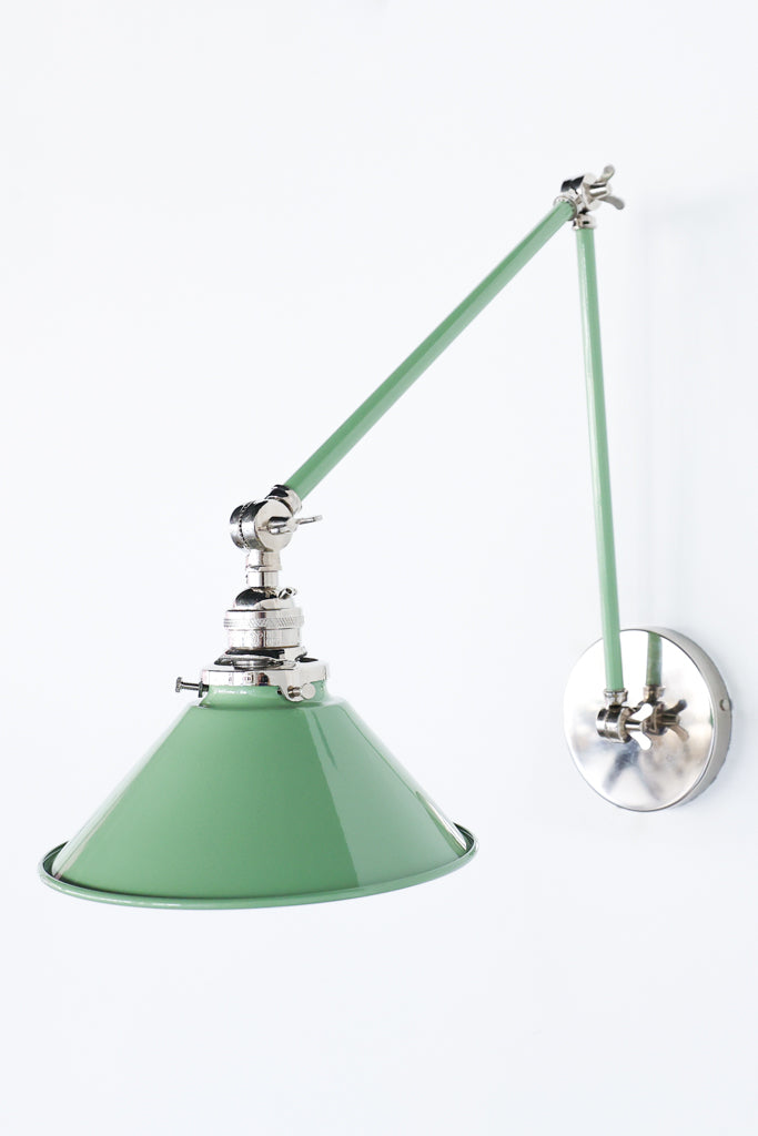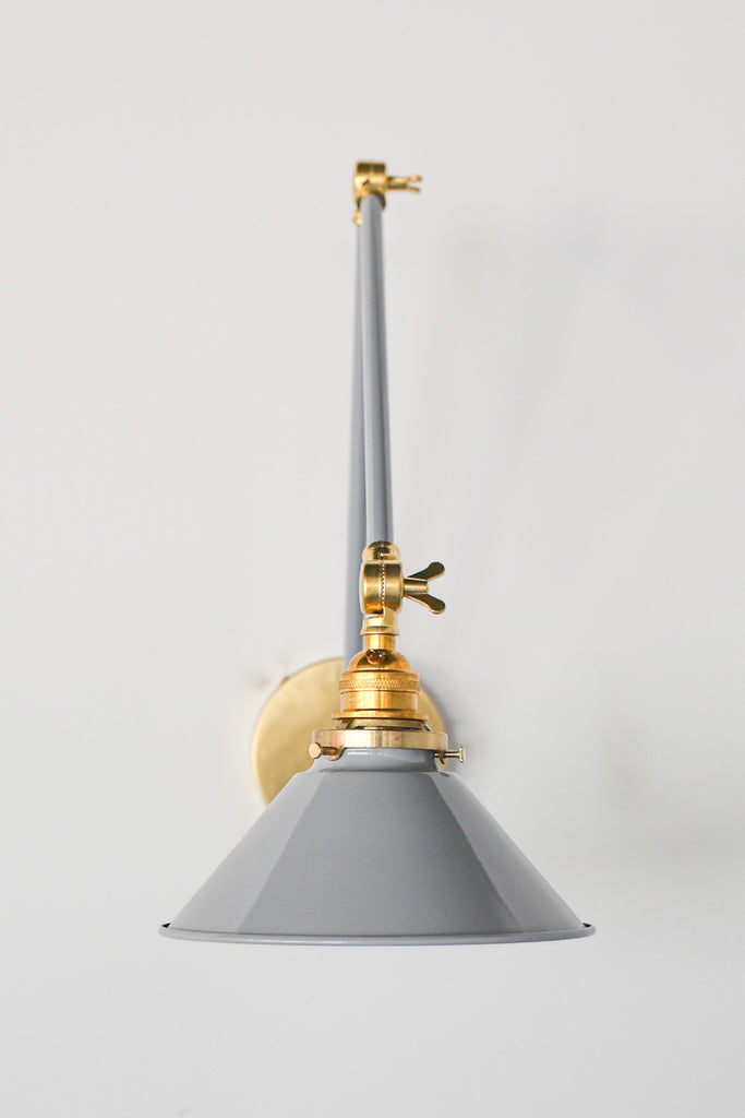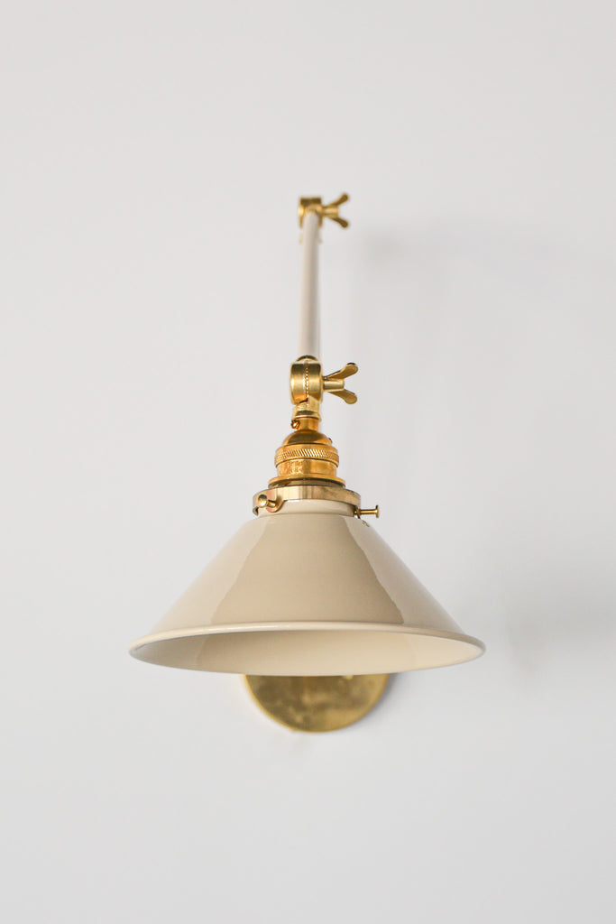 Channeling the timeless look of vintage pharmacy lamps, the Cora Adjustable Sconce adds a touch of industrial chic to your space. Featuring sleep lines and a classical conical shade, the versatile sconce goes beyond tradition with its range of modern finishes. It's available in our 30 curated colors, but we can also custom powder-coat it in any color you'd like. The metal portion can be made in raw brass, chrome, or powder-coated black.