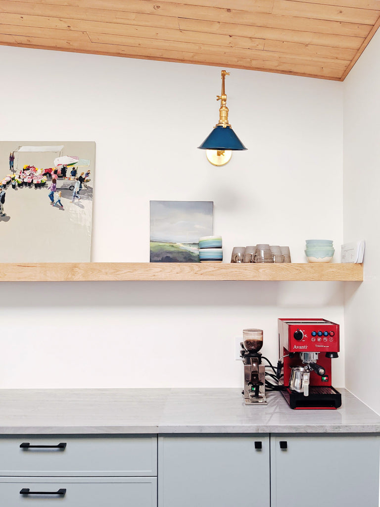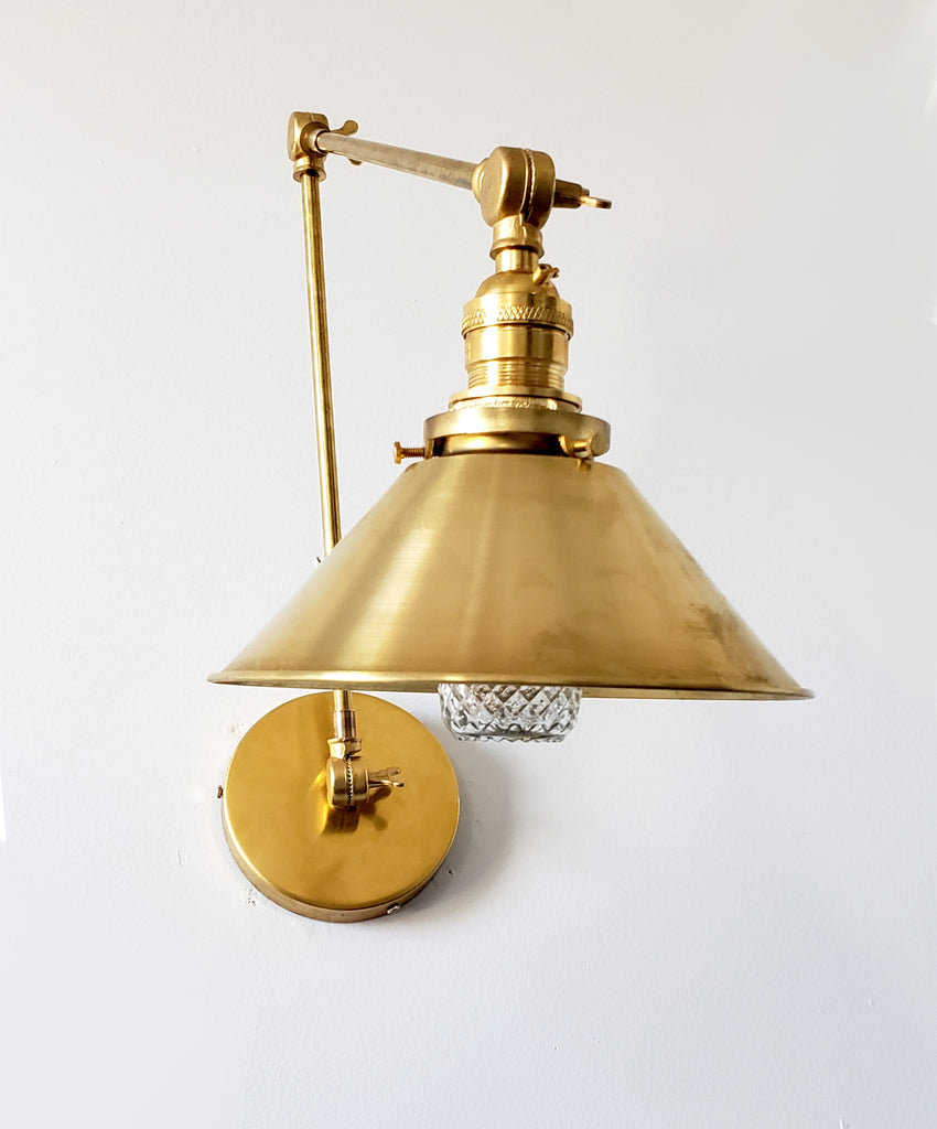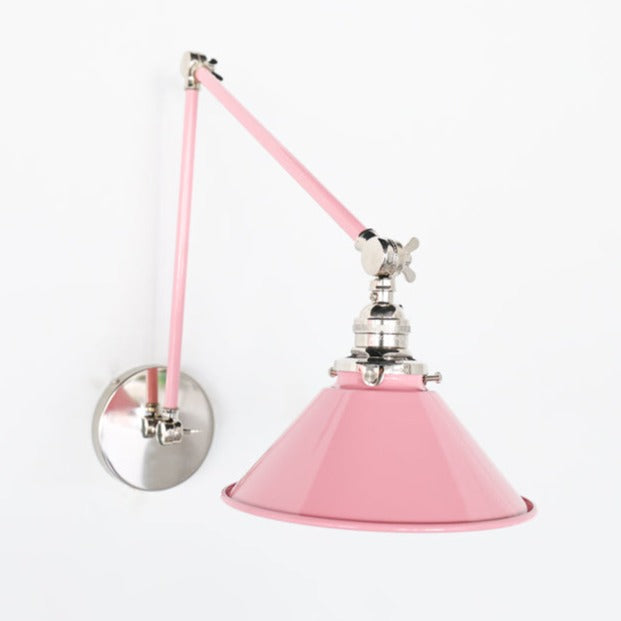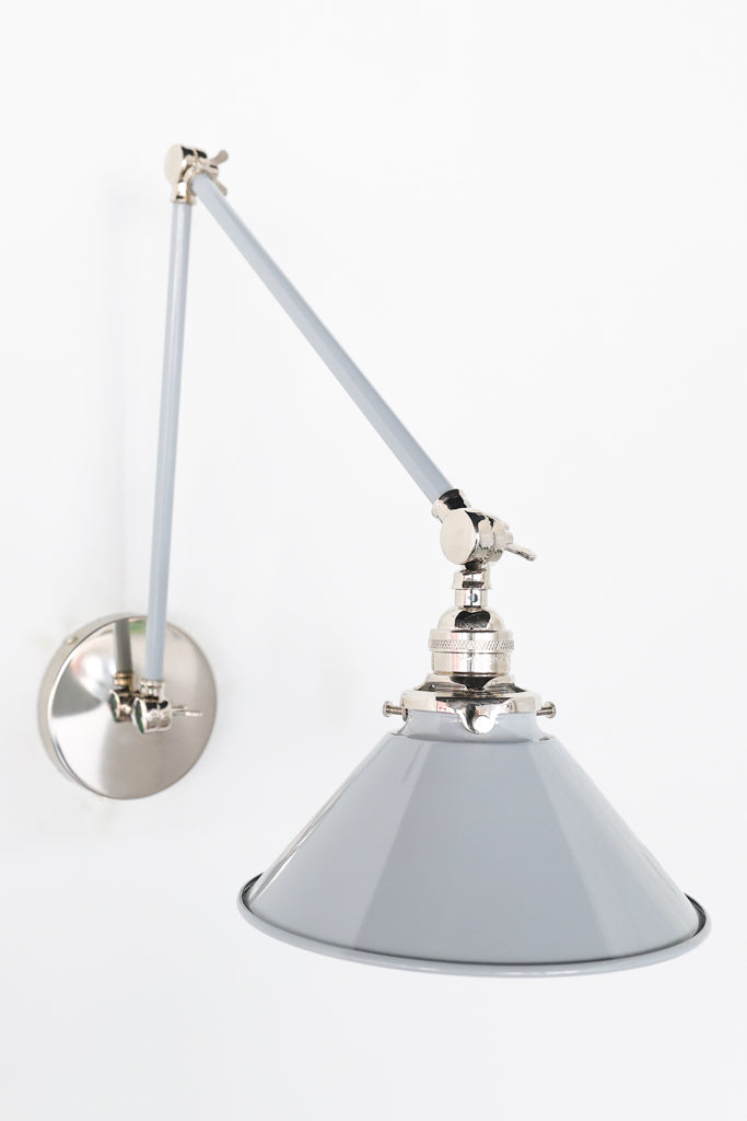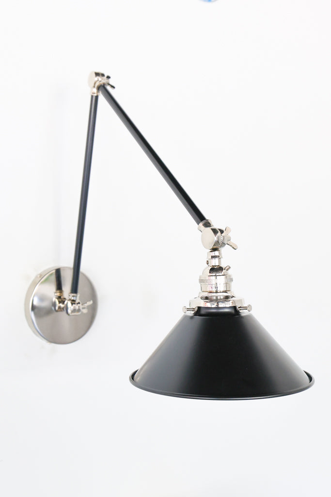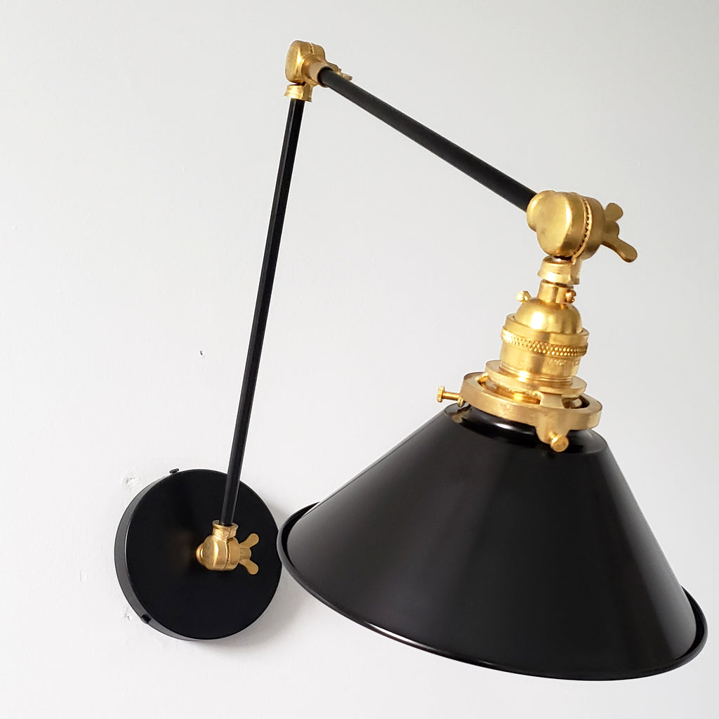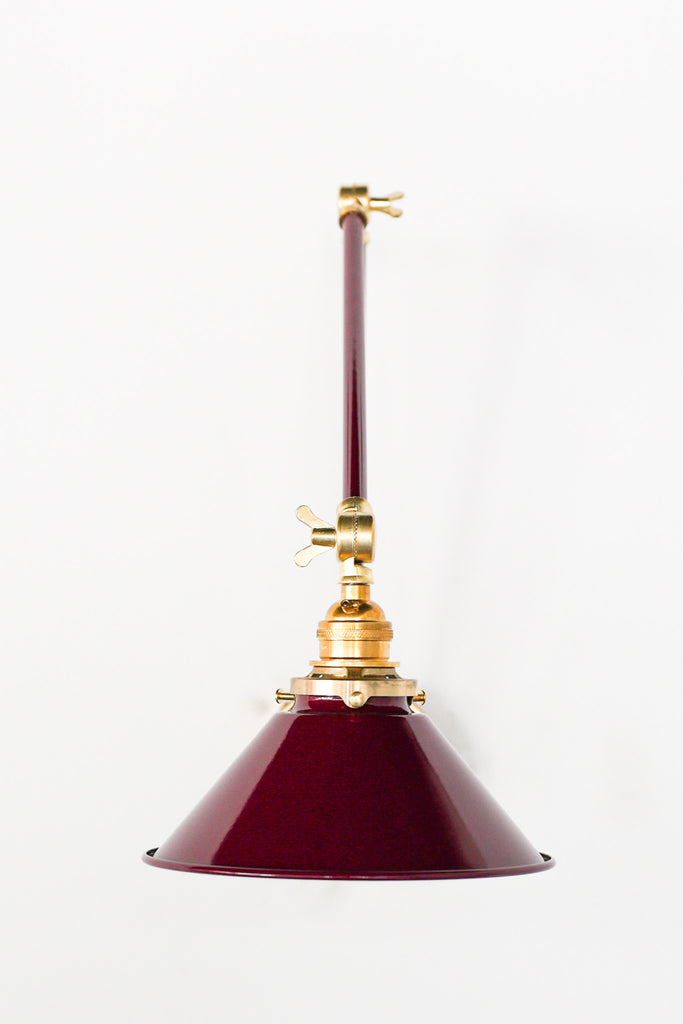 Channeling the timeless look of vintage pharmacy lamps, the Cora Adjustable Sconce adds a touch of industrial chic to your space. Featuring sleep lines and a classical conical shade, the versatile sconce goes beyond tradition with its range of modern finishes. It's available in our 30 curated colors, but we can also custom powder-coat it in any color you'd like. The metal portion can be made in raw brass, chrome, or powder-coated black.