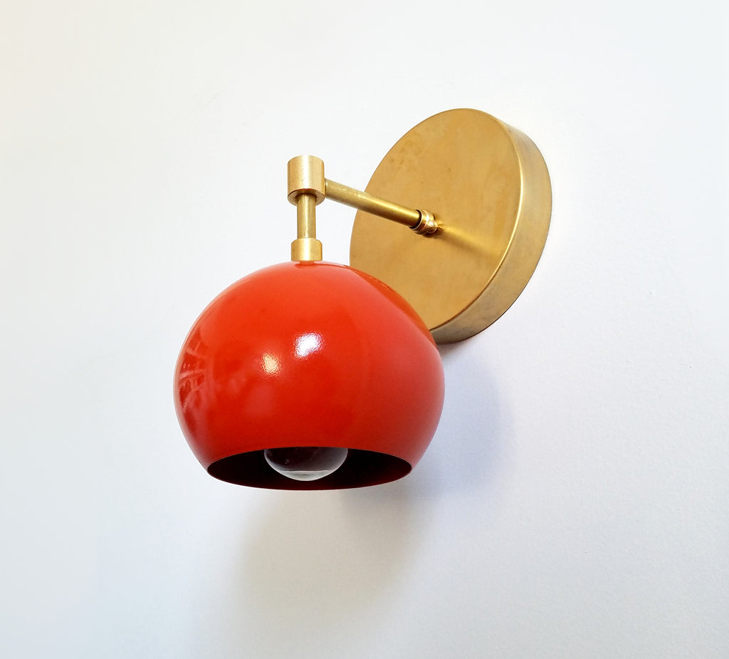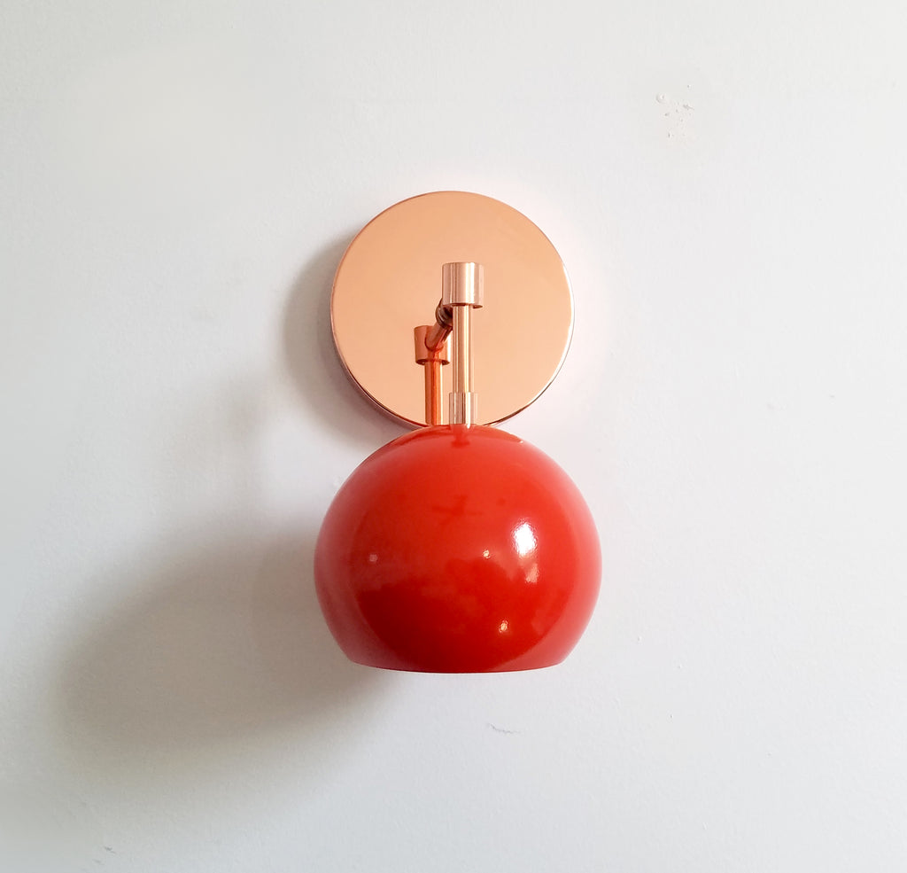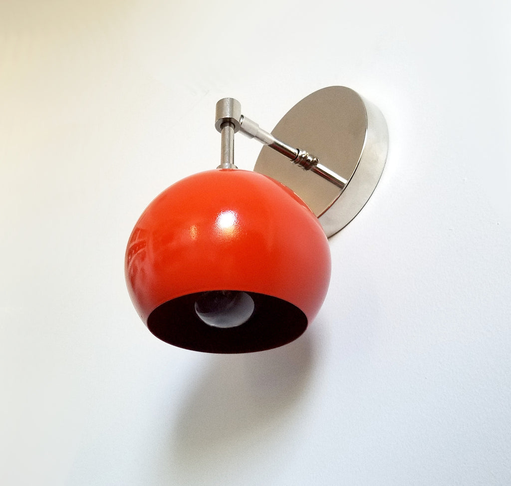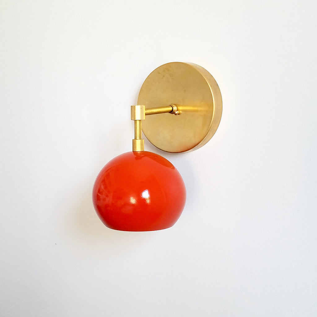 Beautiful mid-century modern inspired sconce featuring a globe-shaped Flame Orange colored shade with complimentary metal finish of either brass or chrome. This simple sconce can work as accent lighting, bathroom, lighting, or to illuminate wall art. This sconce features one E26 / medium screw base socket.