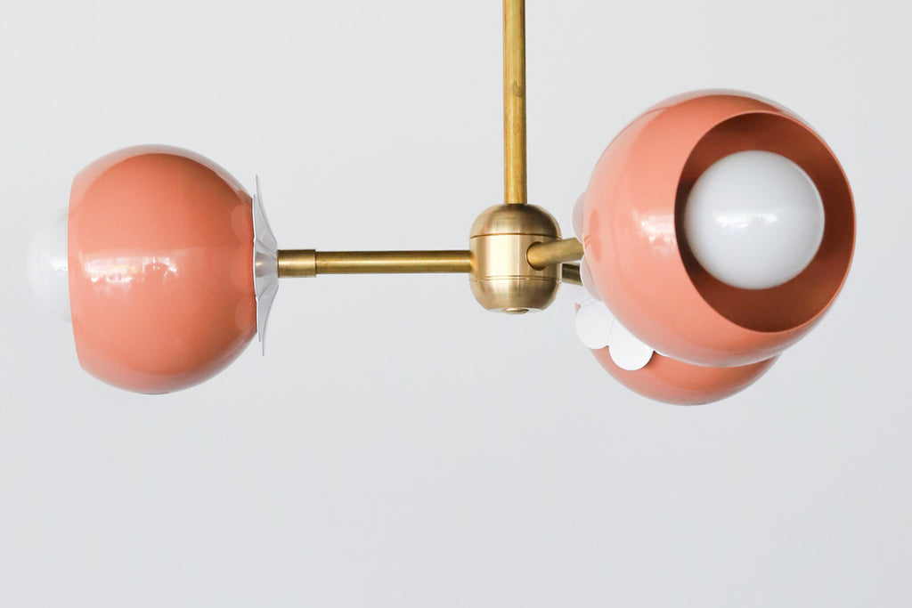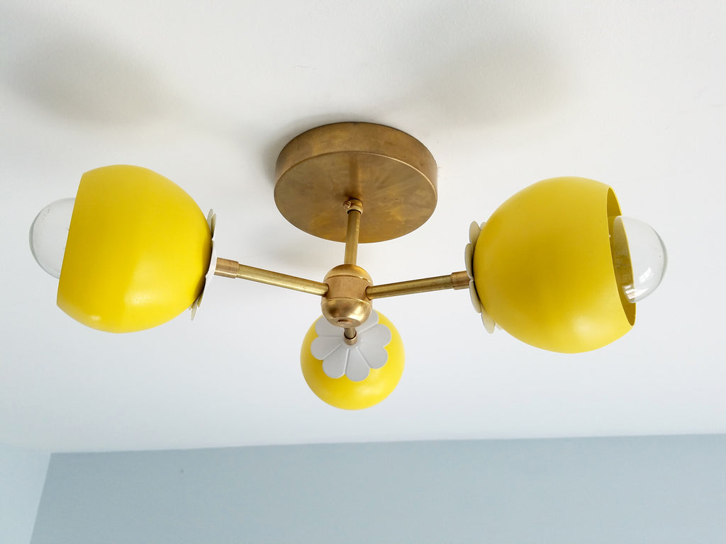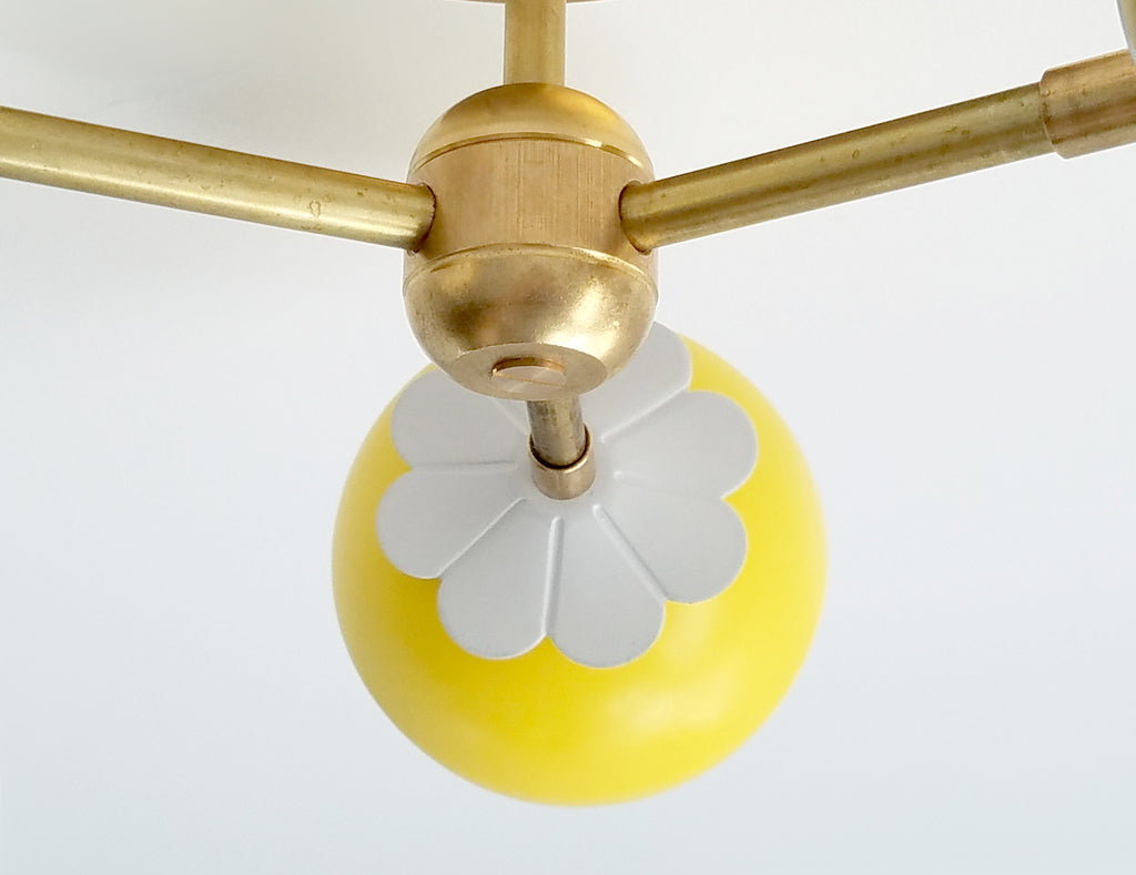 Its bold yellow with the white daisies add a pop of color and personality to any room of the house. Chic, playful, and elegant chandelier. This is the perfect fixture to brighten up any kids room or play room. The fixture comes with a 4 inch downrod. Additional downrod lengths may be purchased here. Available in brass and chrome finishes. If you have questions about metal finishes, learn more here.