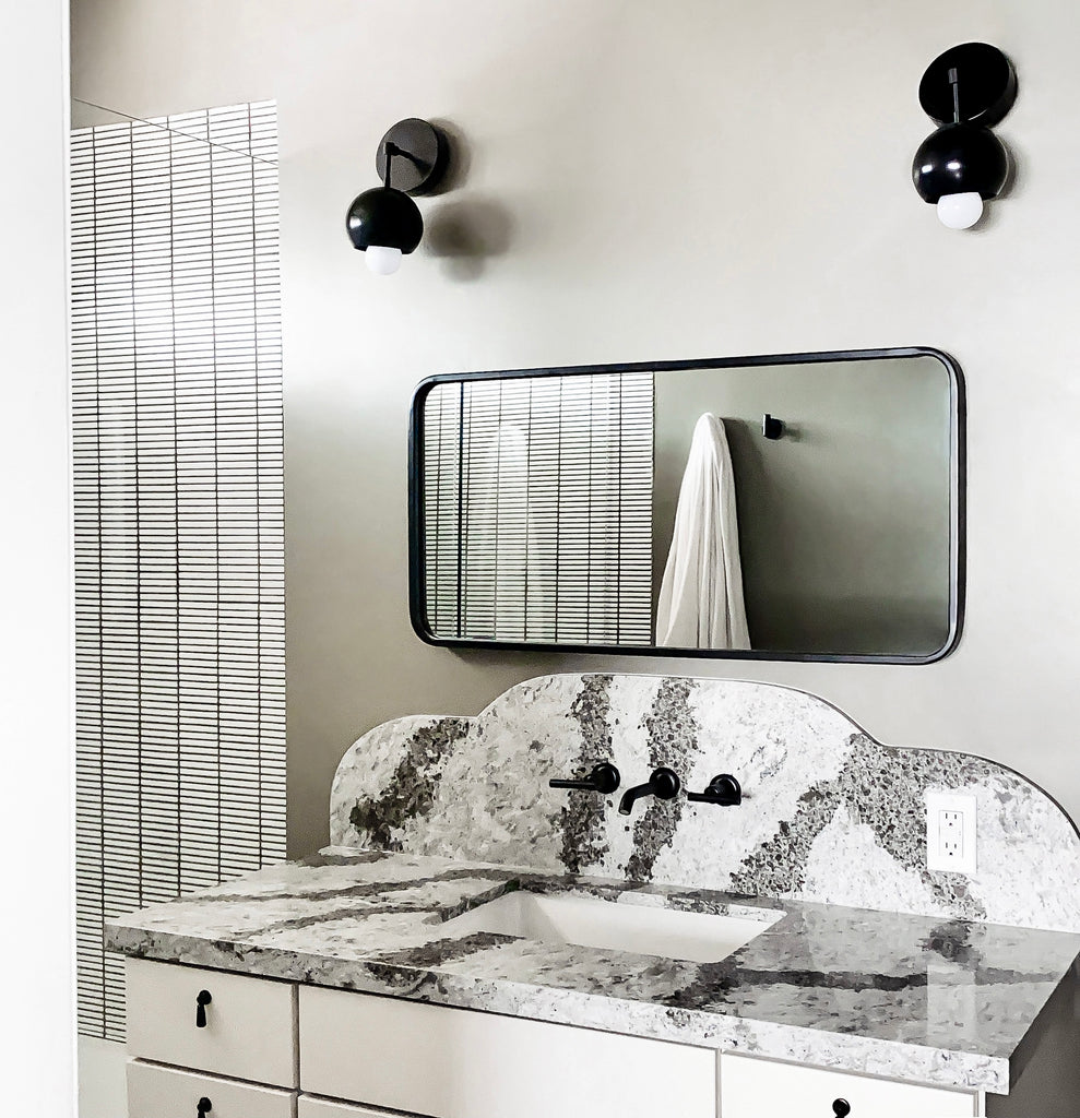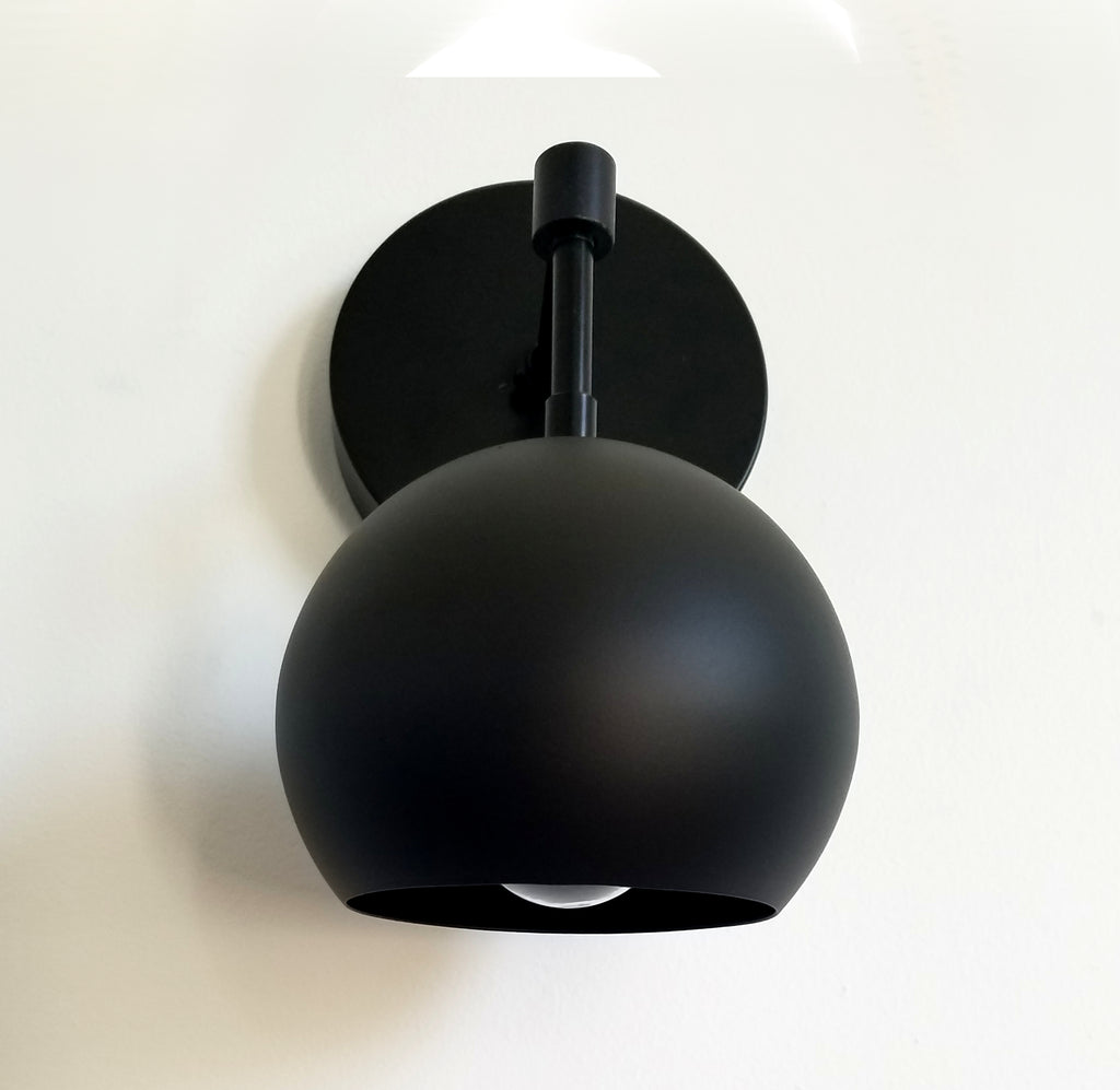 The Loa Sconce is a simple beautiful sconce featuring a globe-shaped black shade with complimentary metal finish of either brass or chrome. This simple sconce can work as accent lighting, bathroom, lighting, or to illuminate a picture. Painted Loa Sconce features a matte black-colored shade that works beautifully with the gold/brass tones of the body of the sconce.The sockets are standard-sized (E26). All measurements can be adjusted; just send me a message! This can be altered for plug wiring. Message me for details.