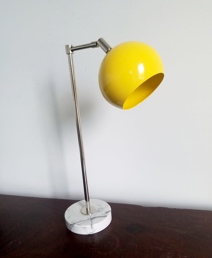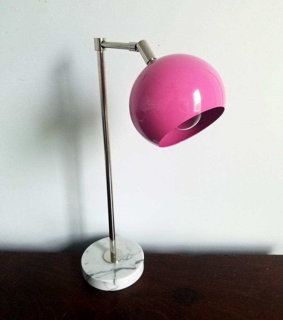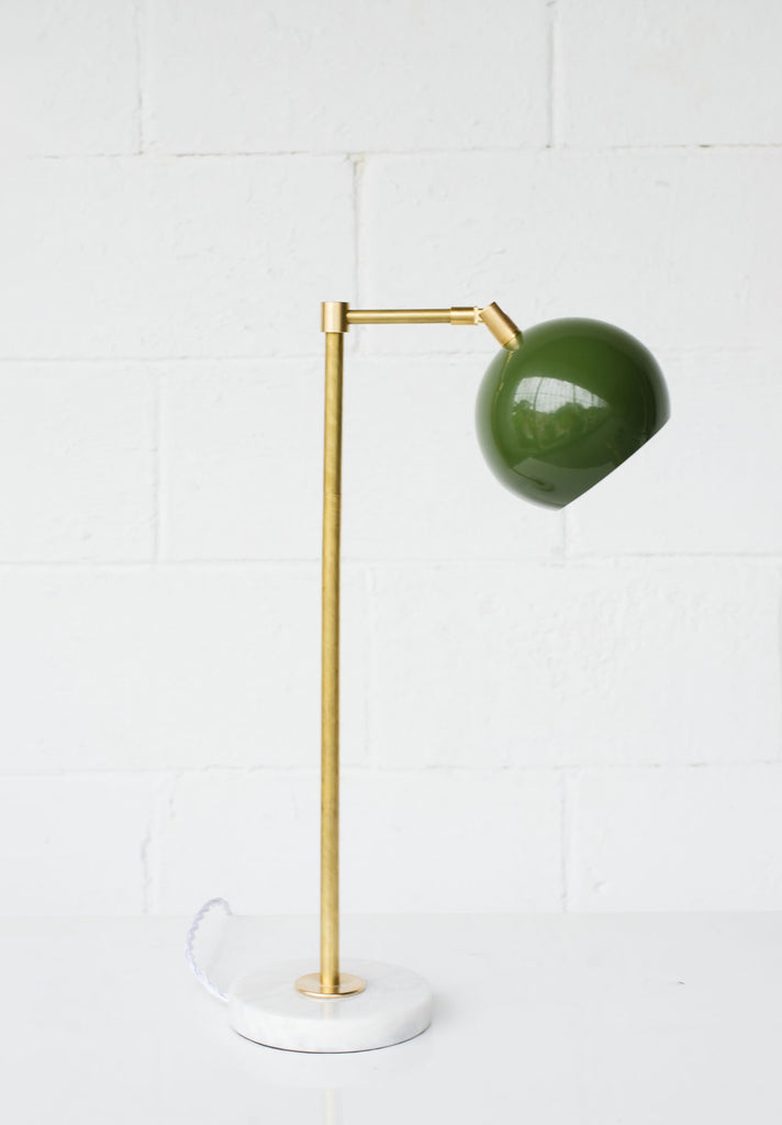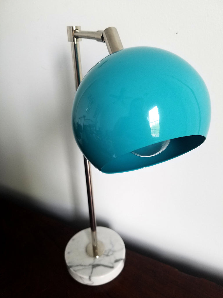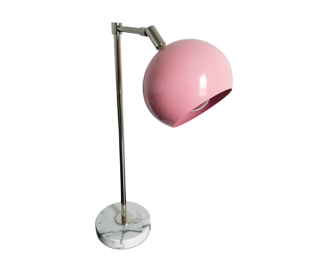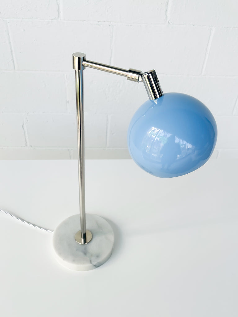 Capable of lighting the way to a finished homework assignment or completed project, the Loa Task Lamp with Marble Base from Sazerac Stitches is the perfect lighting solution for desks, nightstands, and other small spaces. It has a modern colorful light globe, a chrome or brass arm and lamp pole and a circular base made of genuine Carrera marble. This desk lamp has a multipositional head.