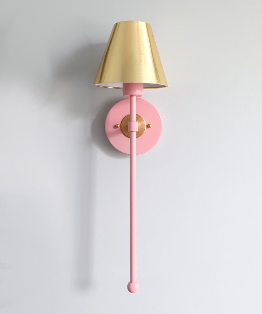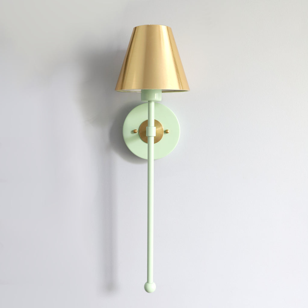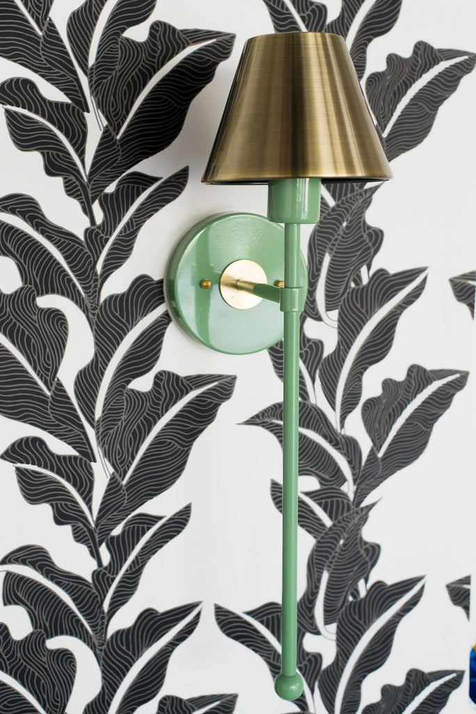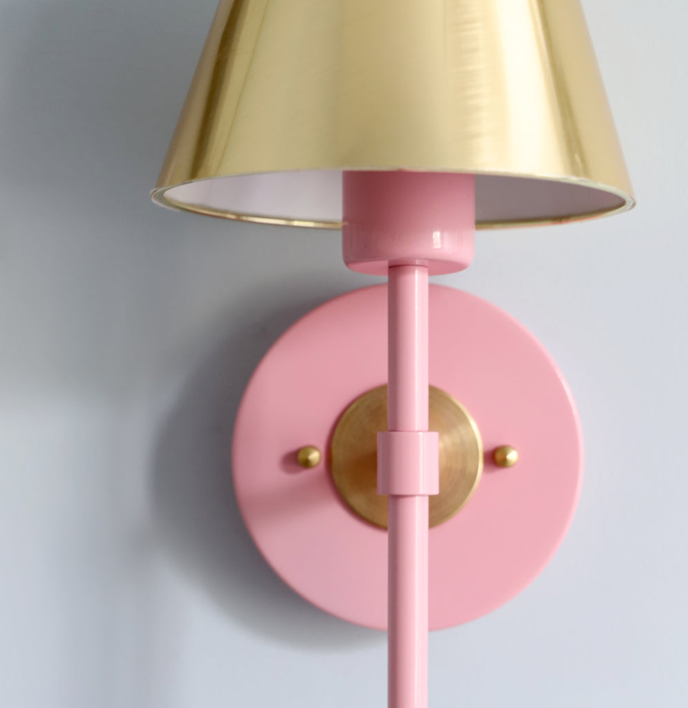 Color is the star of the show in the Dupre Single Light Sconce.  The Dupre sconce is a larger sconce with a pretty brass colored shade and a single brass accent.  The shaded single light sconce would be beautiful as accent lighting in a bathroom with additional overhead lighting, on either side of a large piece of art, or running the length of a a long hallway.  Hardwire installation; however, a plug in option can be added here.