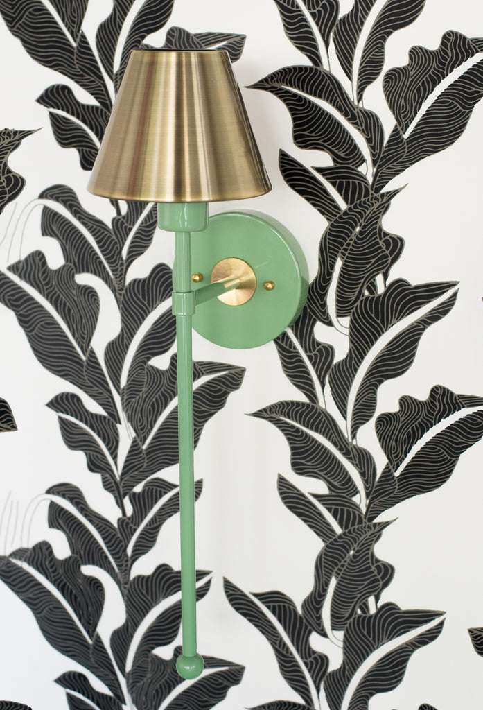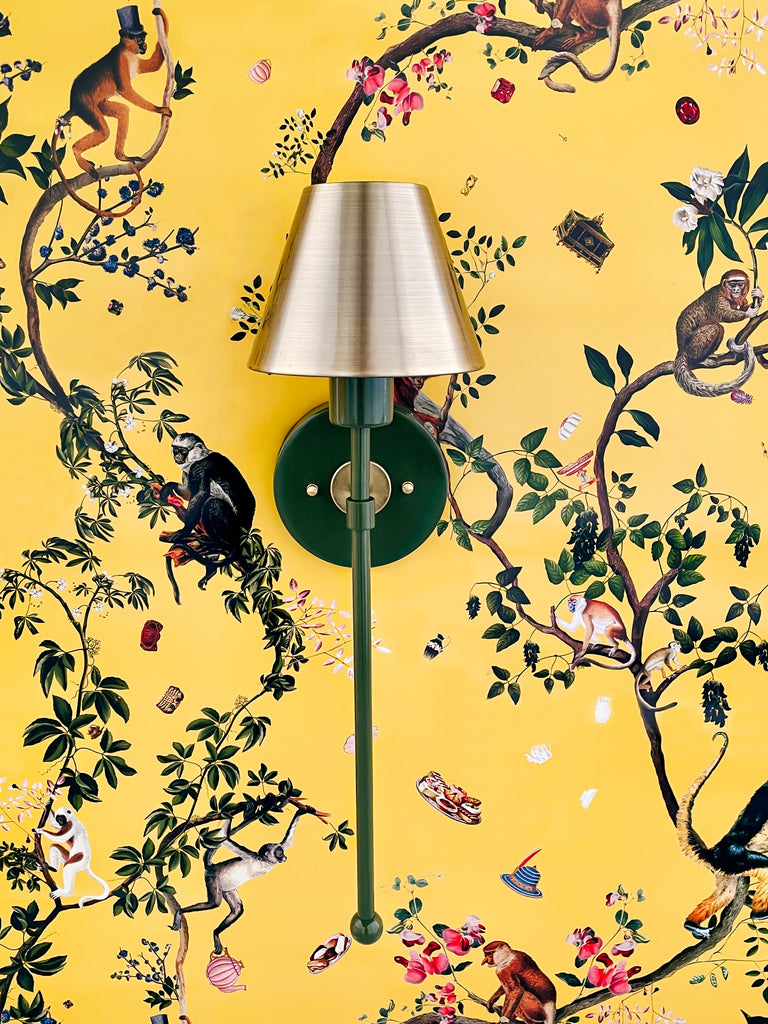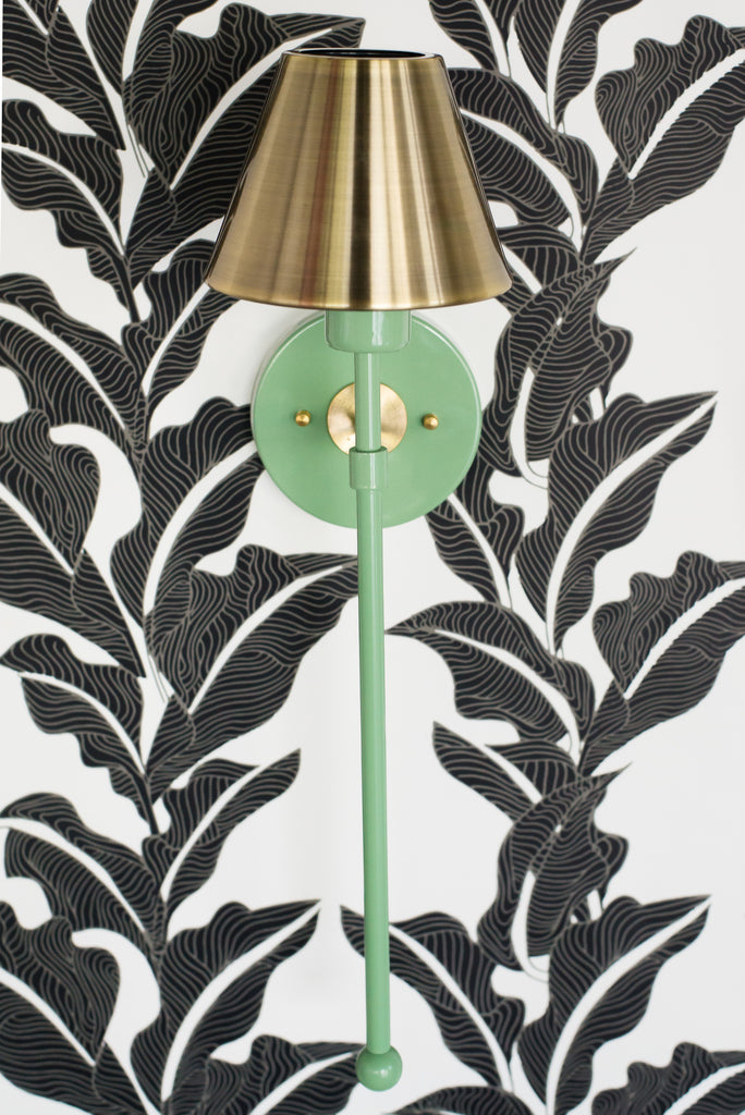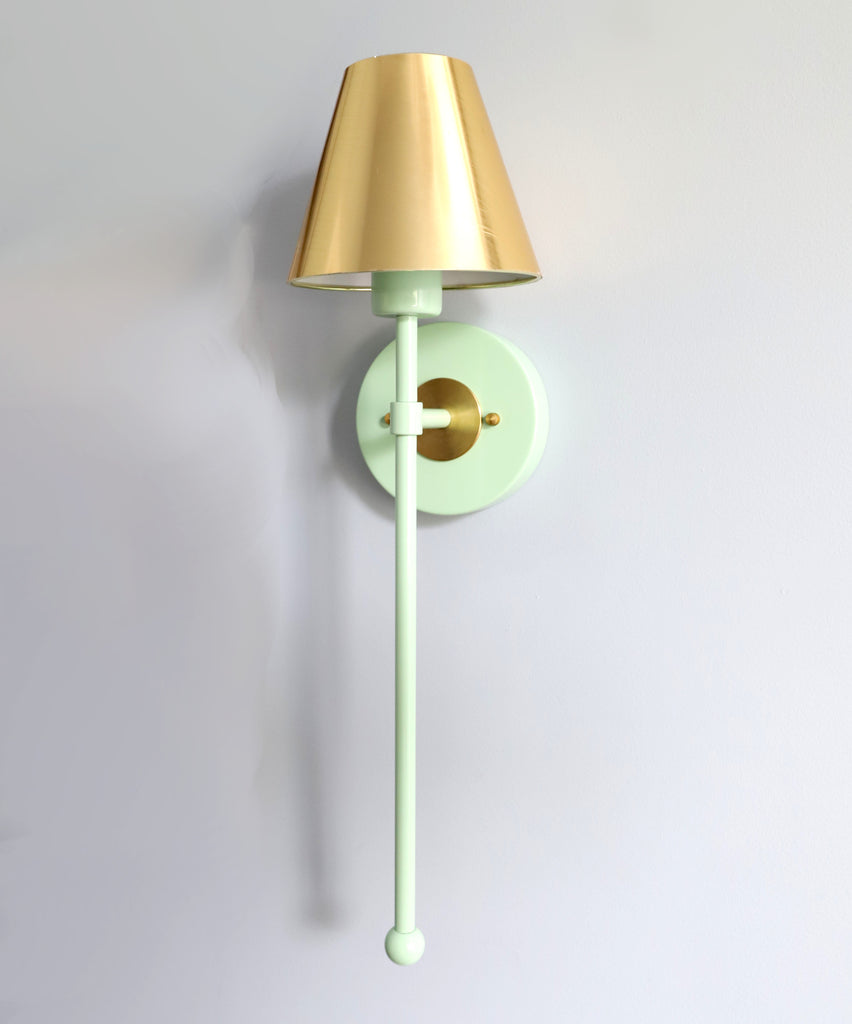 Color is the star of the show in the Dupre Single Light Sconce.  The Dupre sconce is a larger sconce with a pretty brass colored shade and a single brass accent.  The shaded single light sconce would be beautiful as accent lighting in a bathroom with additional overhead lighting, on either side of a large piece of art, or running the length of a a long hallway.  Hardwire installation; however, a plug in option can be added here.