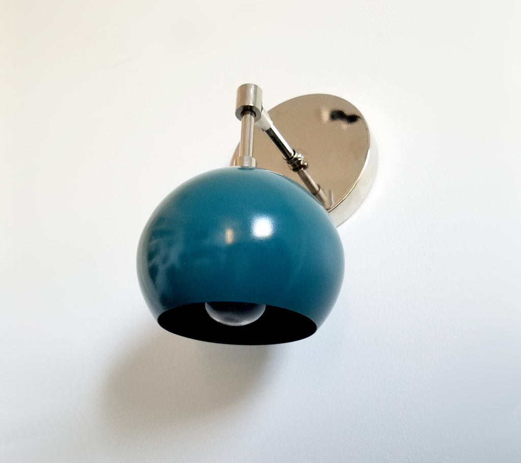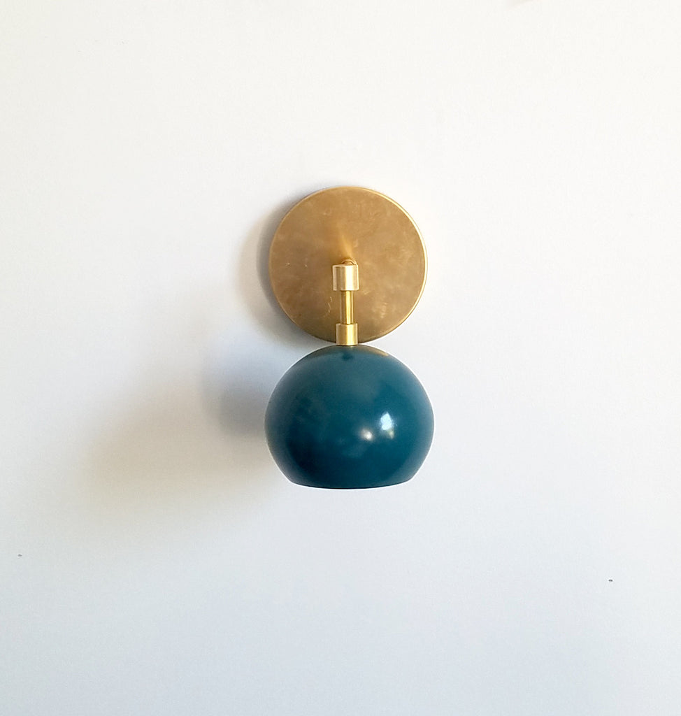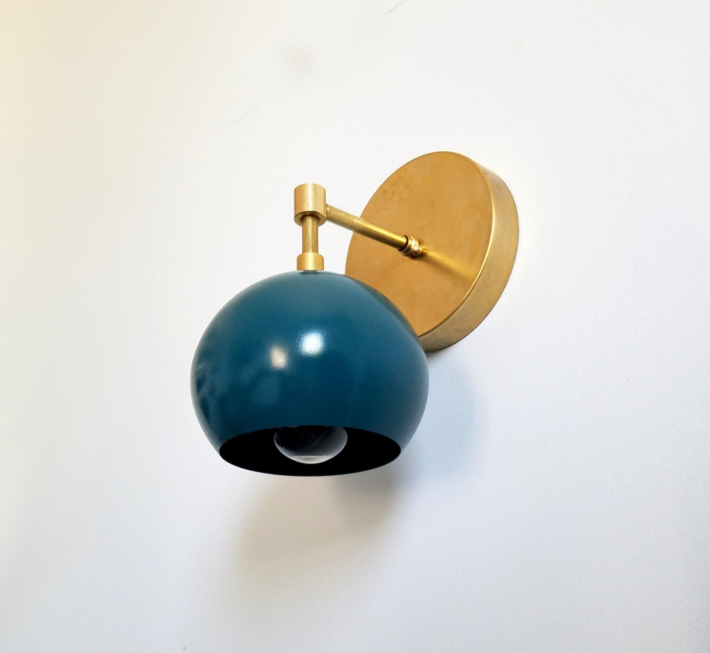 Beautiful mid-century modern inspired sconce featuring a globe-shaped Lagoon Blue shade with complimentary metal finish of either brass or chrome. This simple sconce can work as accent lighting, bathroom, lighting, or to illuminate wall art. This sconce features one E26 / medium screw base socket.