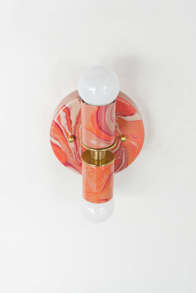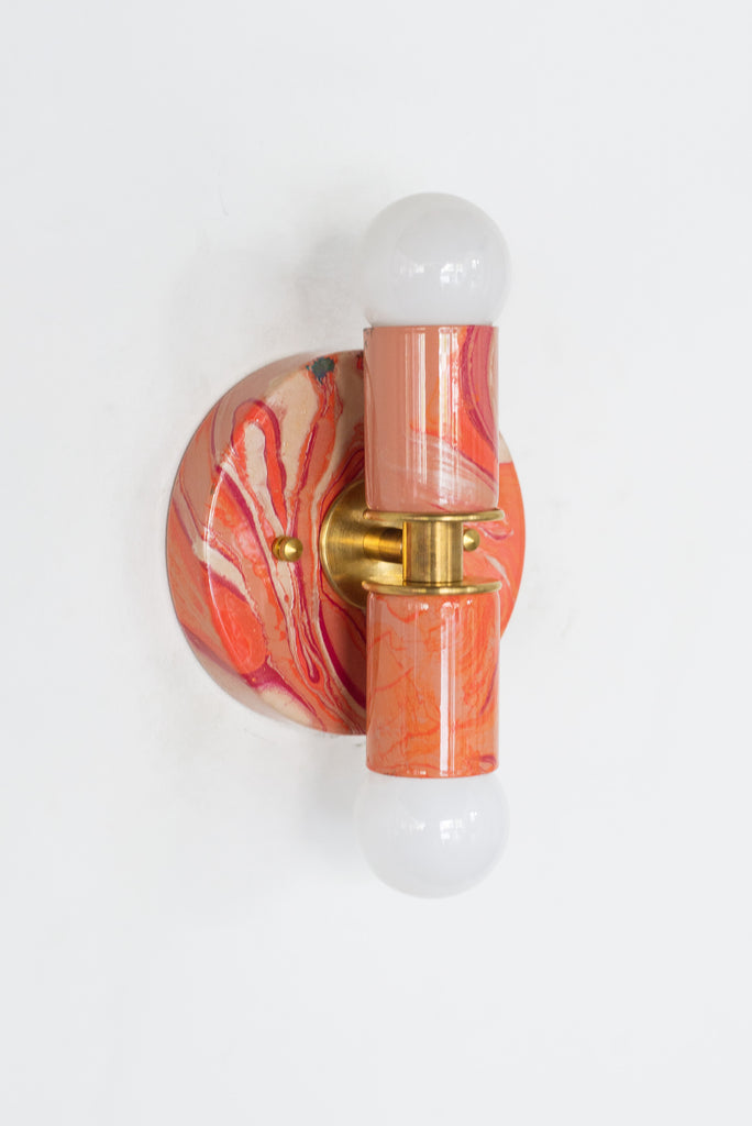 Color is the star of the show in the Thalia Sconce. Named after a Greek Muse, the Thalia sconce is saturated in color with metal accents. The two-light sconce or flush mount ceiling light is compact and can be used in small spaces that need high impact design. The fixture can be installed on a wall or ceiling in both horizontal or vertical position. Hardwire installation; however, a plug in option can be added here.