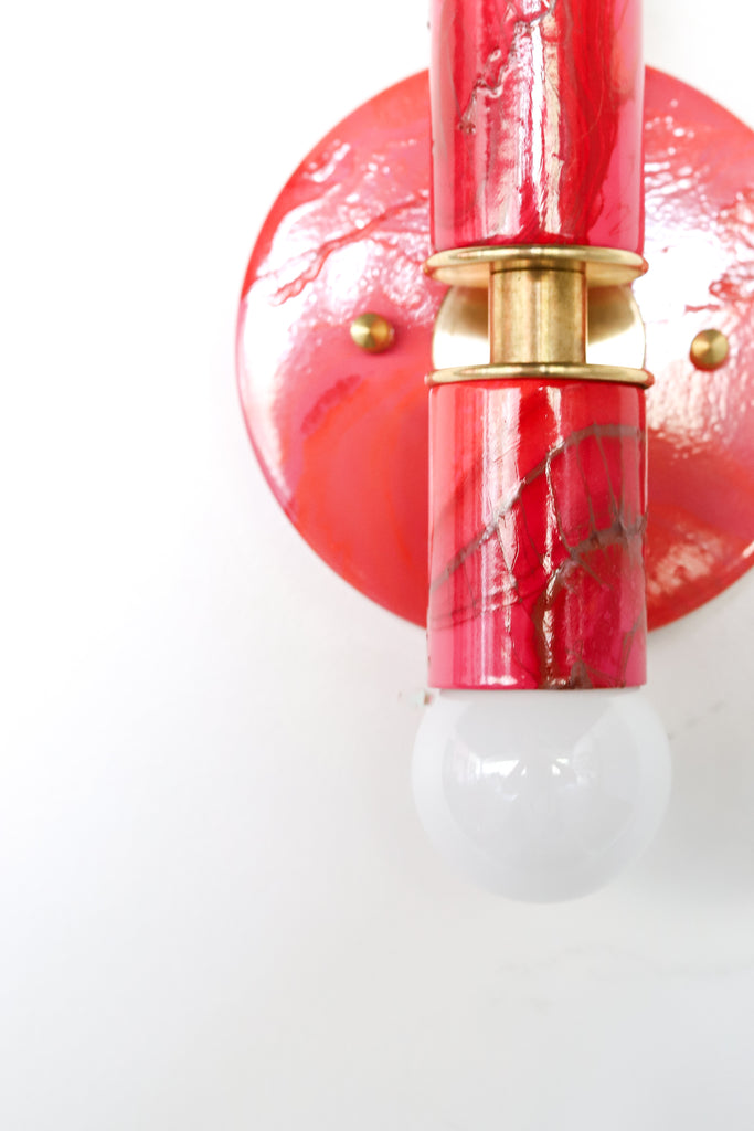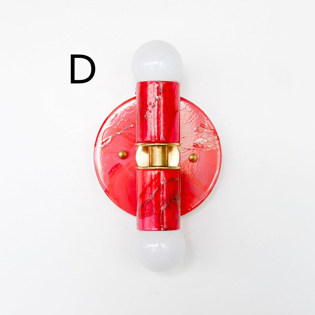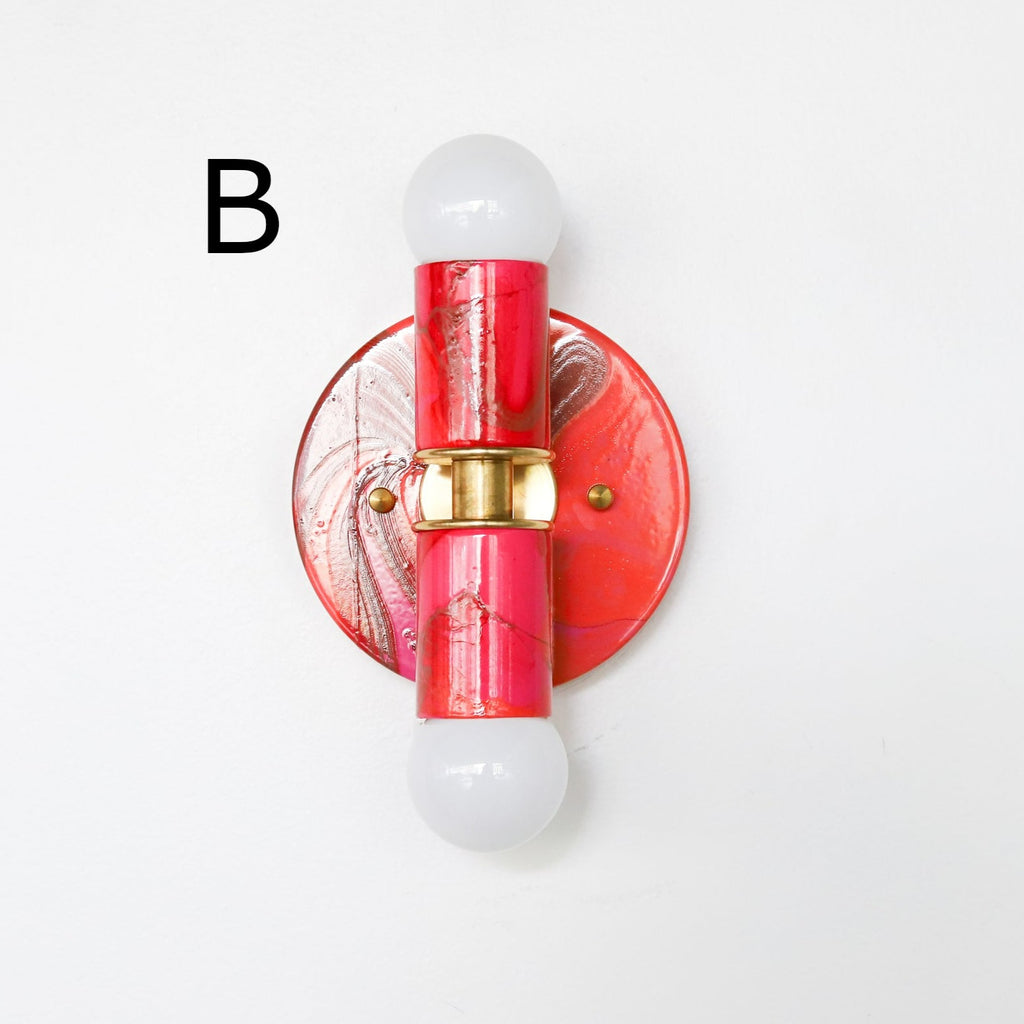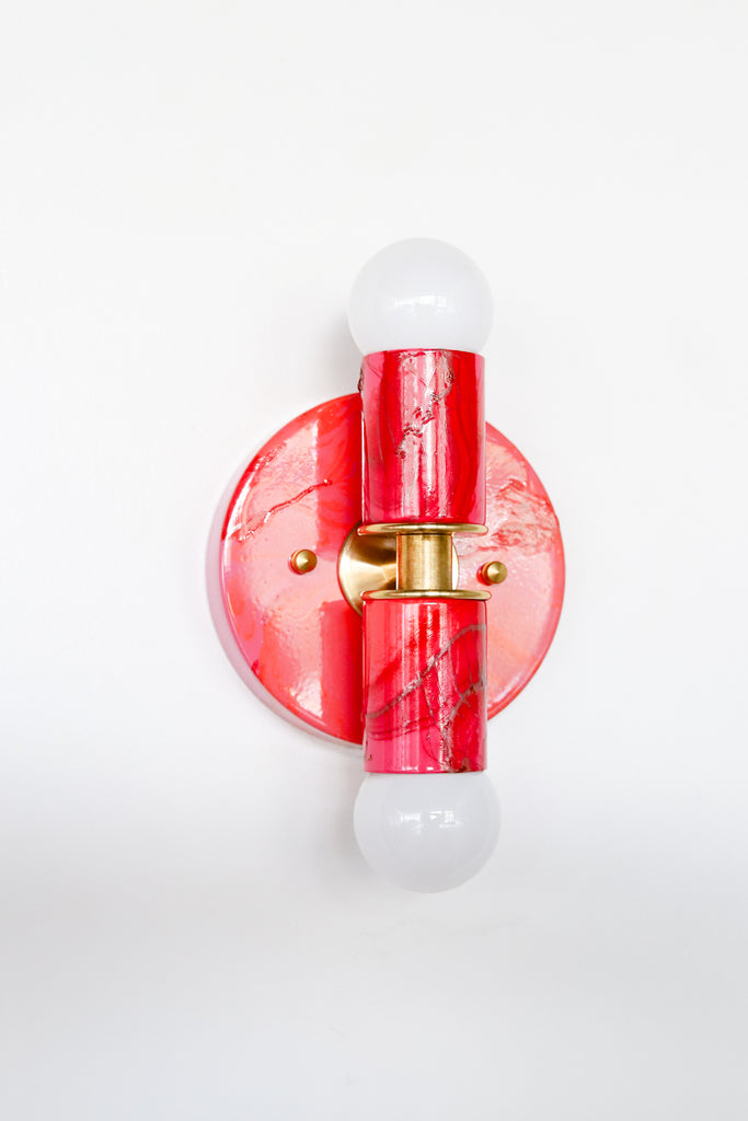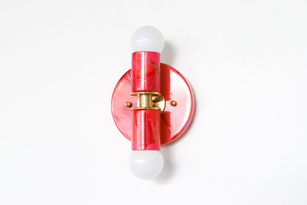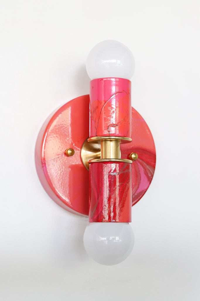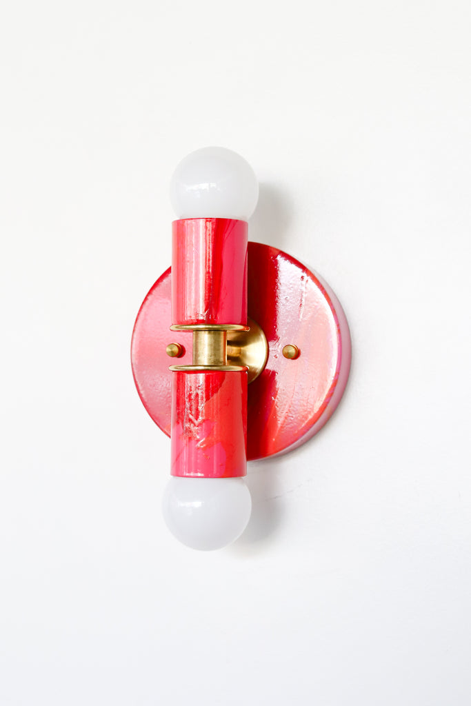 Color is the star of the show in the Thalia Sconce. Named after a Greek Muse, the Thalia sconce is saturated in color with metal accents. The two-light sconce or flush mount ceiling light is compact and can be used in small spaces that need high impact design. The fixture can be installed on a wall or ceiling in both horizontal or vertical position. Hardwire installation; however, a plug in option can be added here.