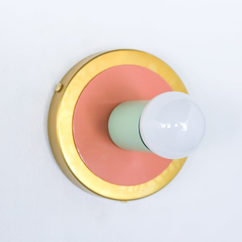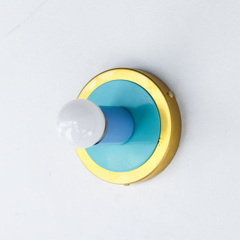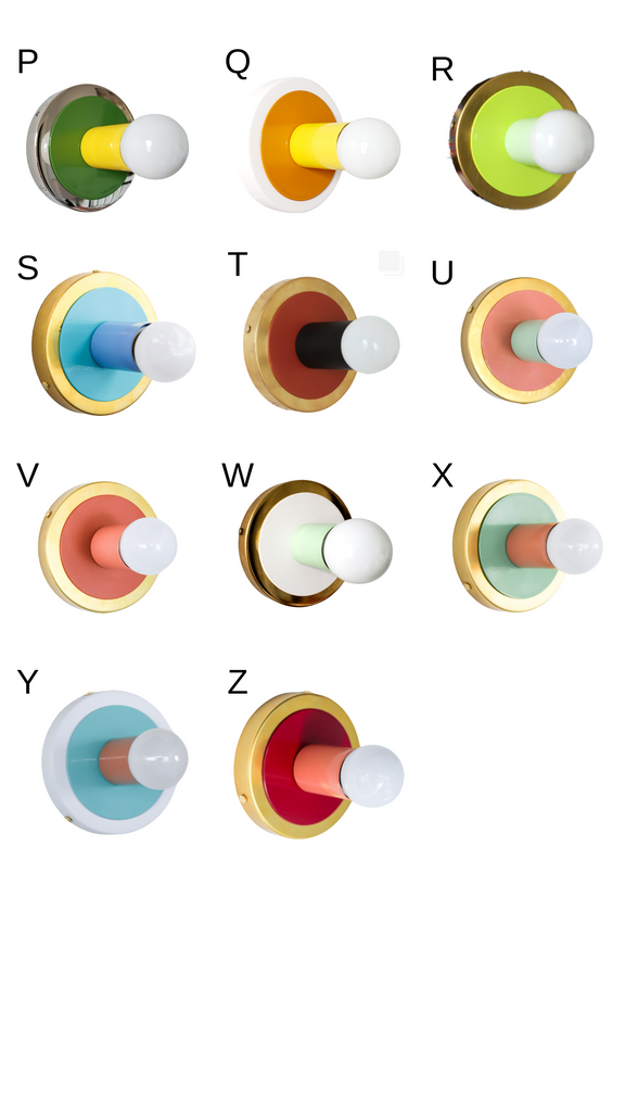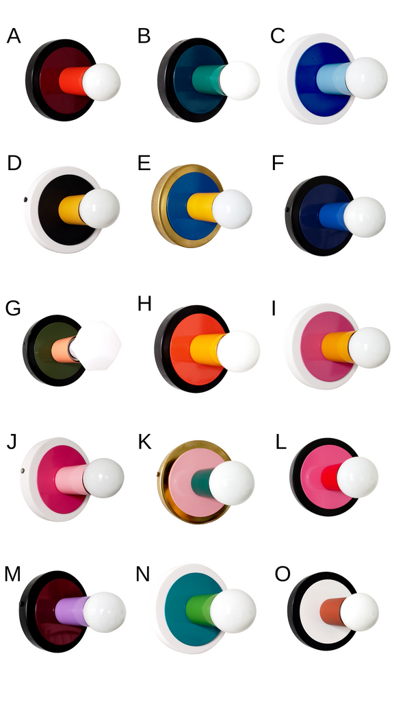 The Warhol is a fun playfully colorful sconce or flush mount ceiling fixture that features a two complementary colors on a black, white, brass, or chrome wall/ceiling plate.  This lighting fixture could be used alone or as a cluster of fixtures.