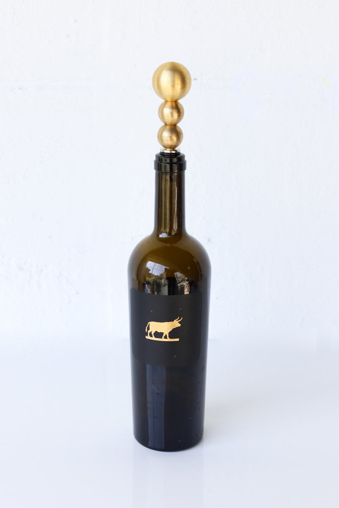 Inspired by geometric shapes, the Brass Ball Bottle Stopper is a great tool for sealing wines, vinegars, oils, and most screw-top liquor bottles. Each has a stainless steel base, raw brass finish, and rubber bands to secure the grip. Raw brass means that the brass has been left in a pure state, without any kind of protective coating applied. The exposed raw brass can oxidize and interact with elements in the environment, causing it to patina and change over time, which is also known as a “living finish.”