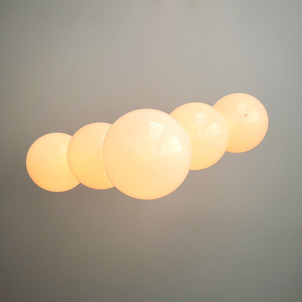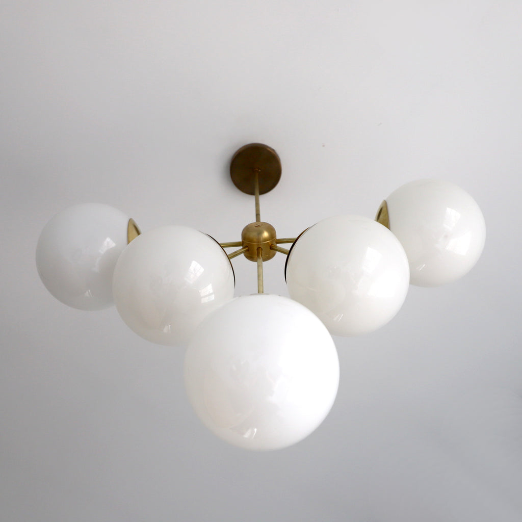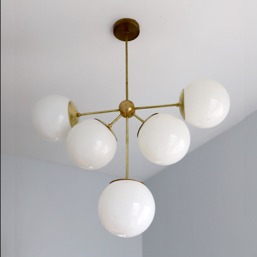Symmetry and the flared arms of the Charity Chandelier evoke Art Deco styling. The white glass and brass body makes it easy to pair this oversized chandelier with trendy, classic, or even midcentury modern home decor.