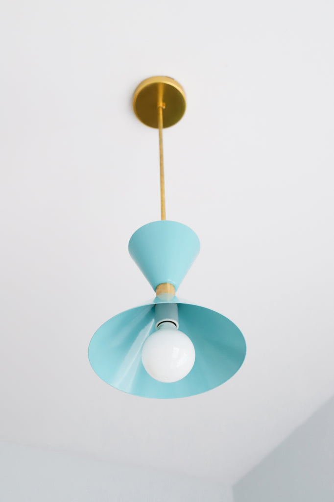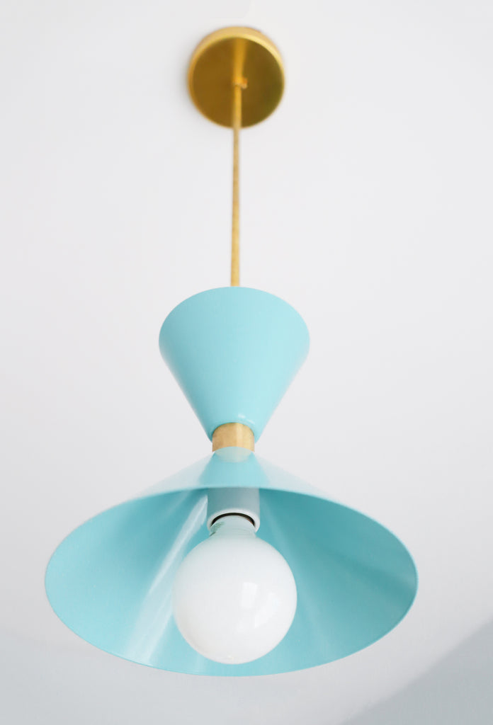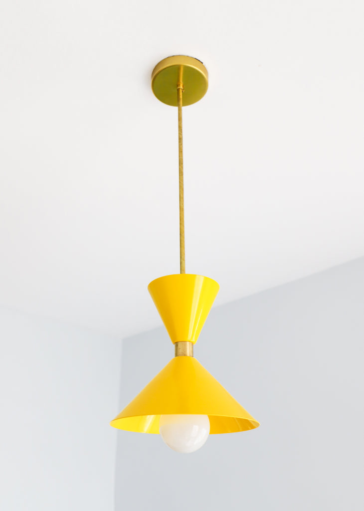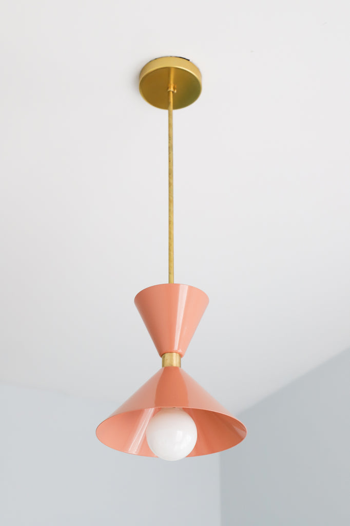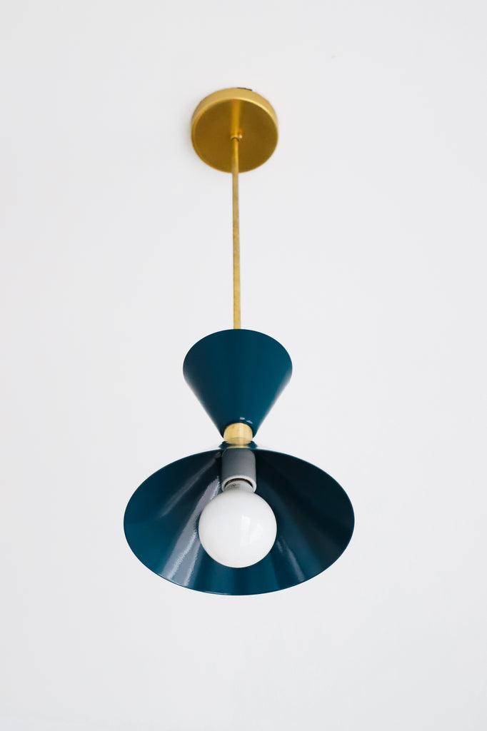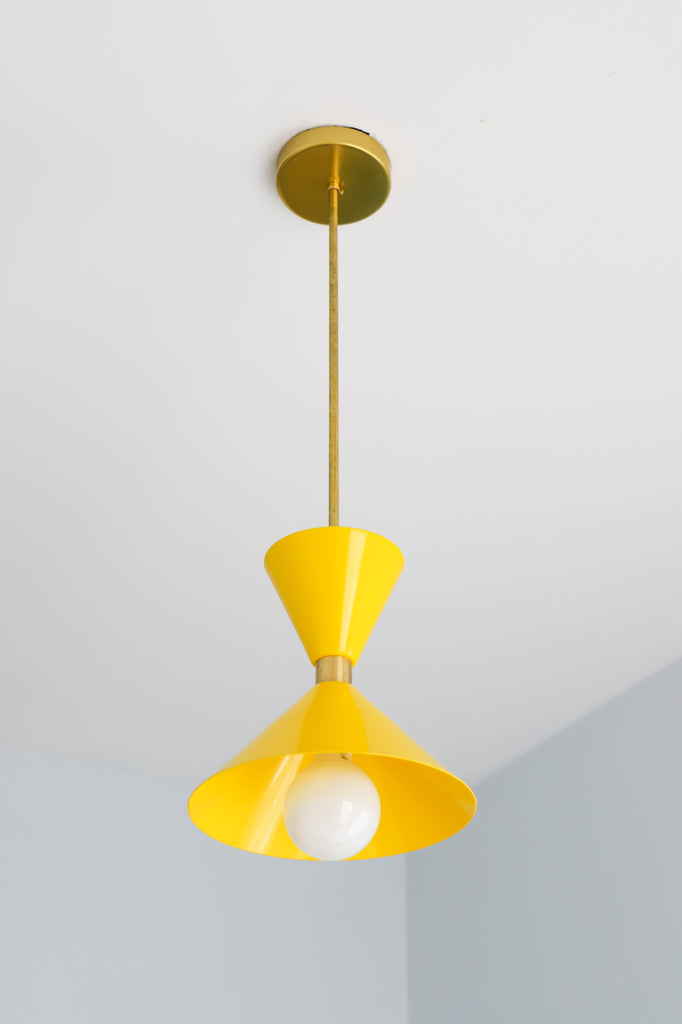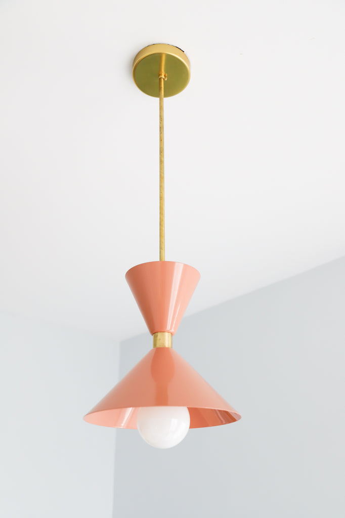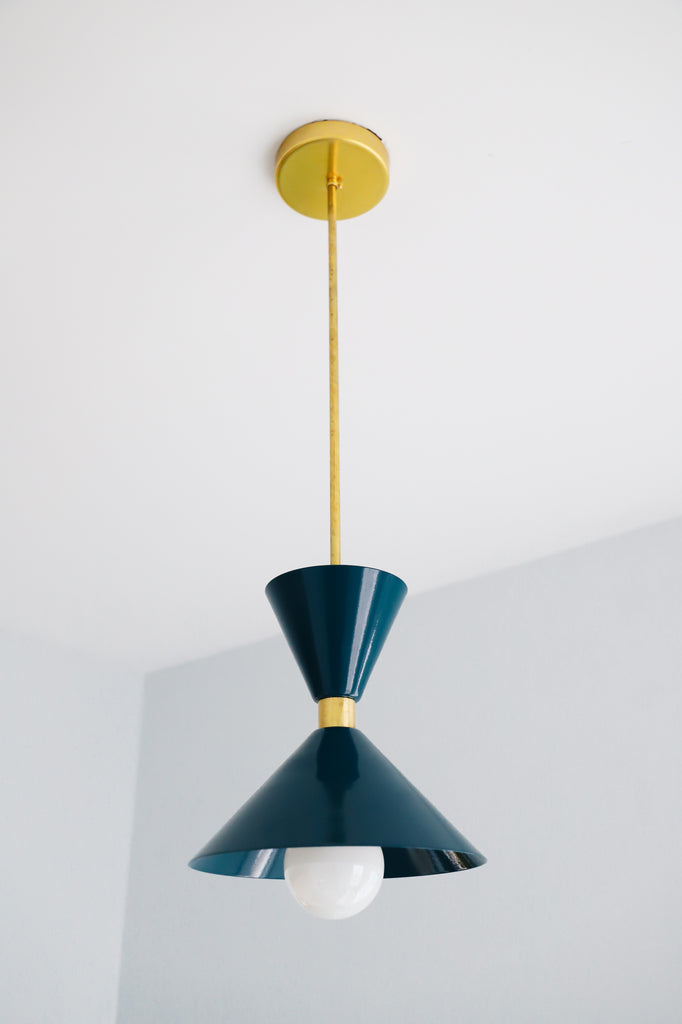 The Clancy Pendant Light is a masculine hour-glass shaped sconce with two cones and a centered brass band. It is available in our 29 different powdercoated colors. It has a single E26/medium base socket. The raw brass will develop a patina over time or can be polished occasionally to retain it's beautiful brassy sheen. We love this pendant over a kitchen island, used as bedside lighting, or as a creative alternative to the bathroom vanity light.