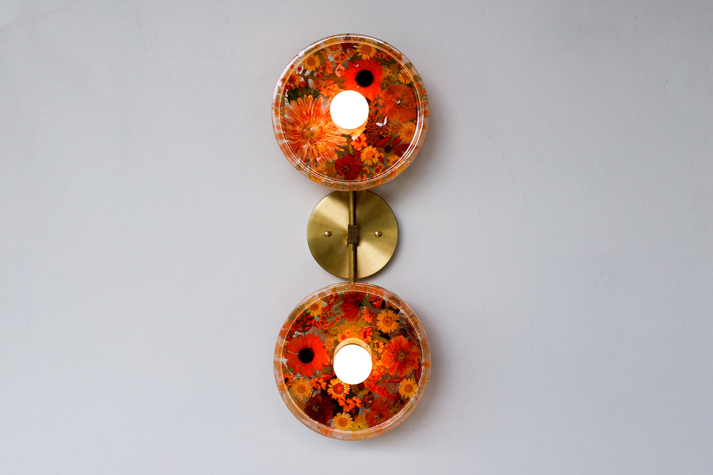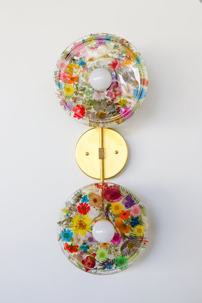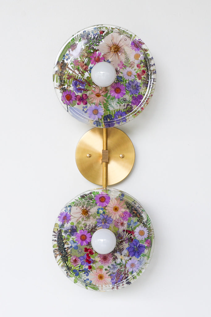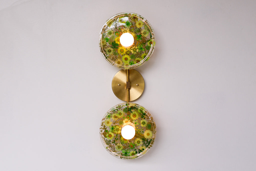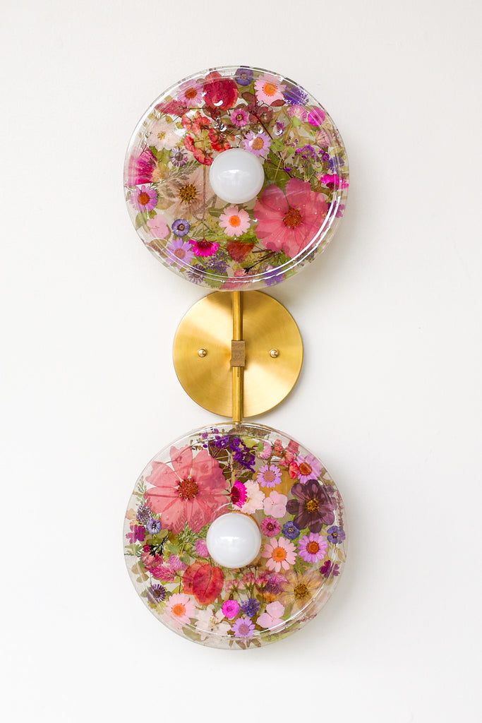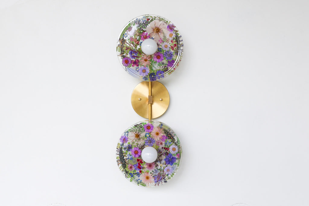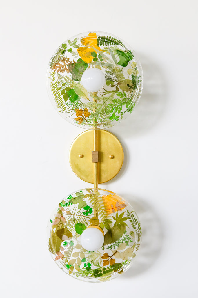 This beautiful sconce or flushmount offers a unique way to bring botanical elements into your décor. The handmade disc features real dried leaves or flowers encased in resin. This romantic fixture is perfect for bathroom accent lighting, as a flushmount in a small space, or installed as a collection to make a bold installation.