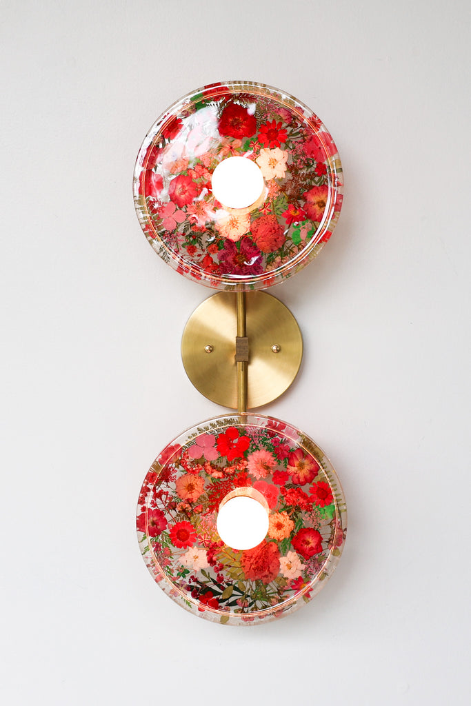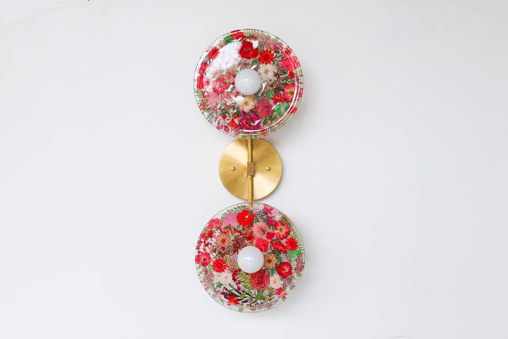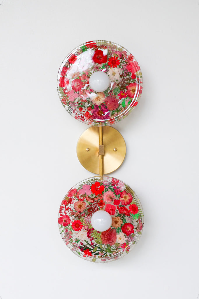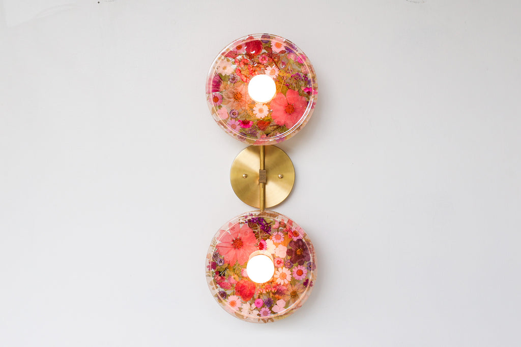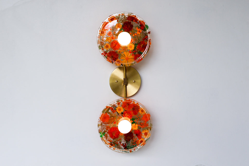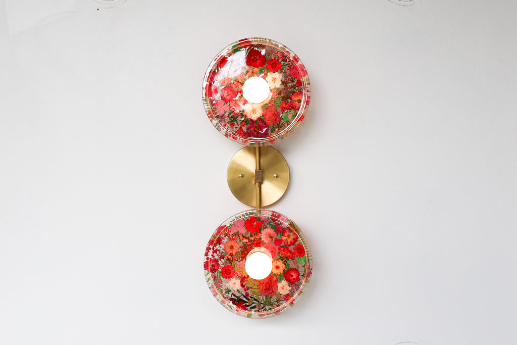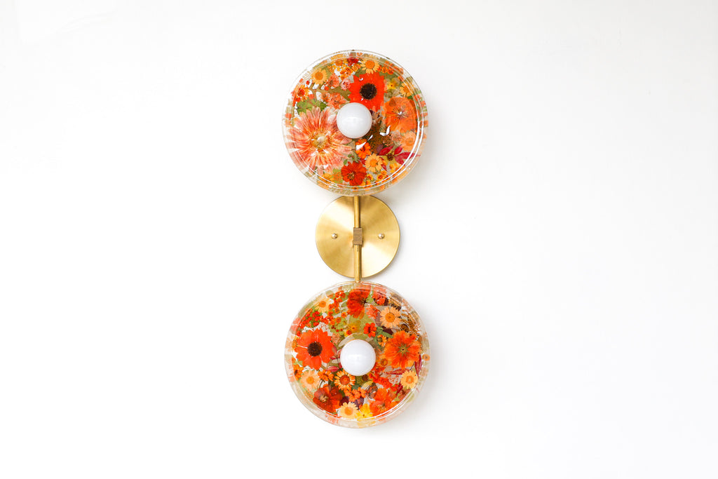 This beautiful sconce or flushmount offers a unique way to bring botanical elements into your décor. The handmade disc features real dried leaves or flowers encased in resin. This romantic fixture is perfect for bathroom accent lighting, as a flushmount in a small space, or installed as a collection to make a bold installation.