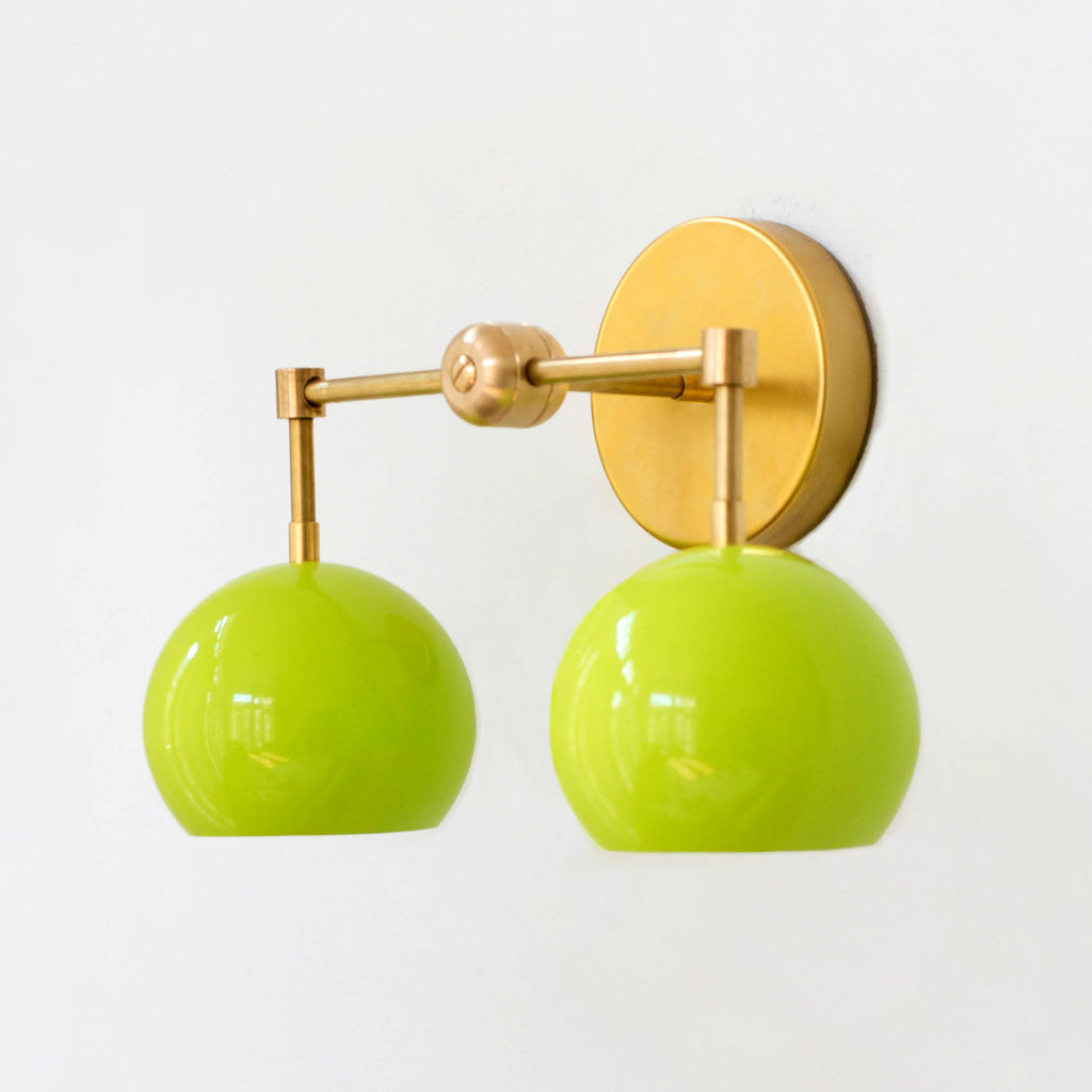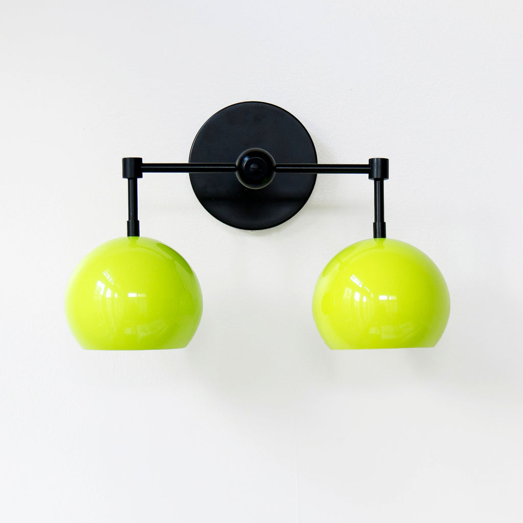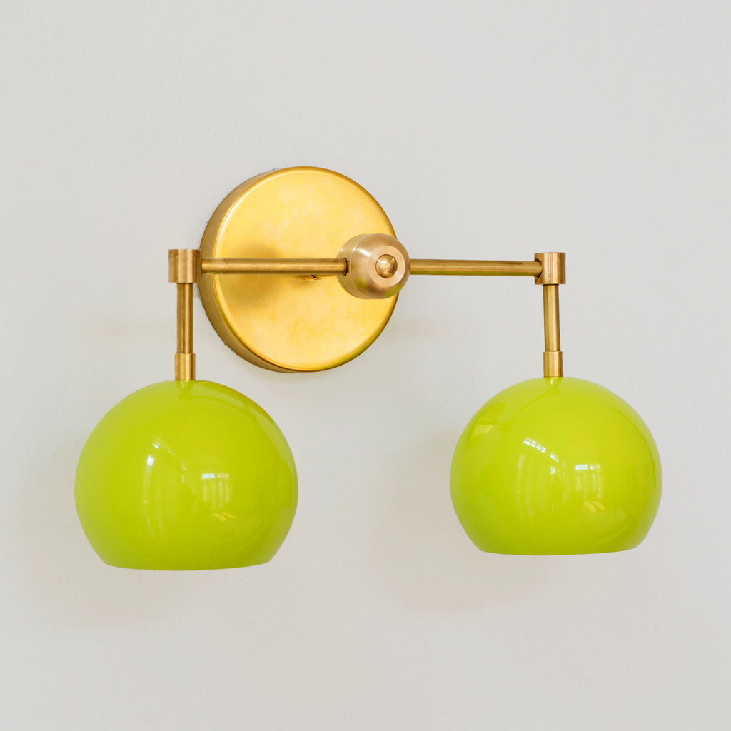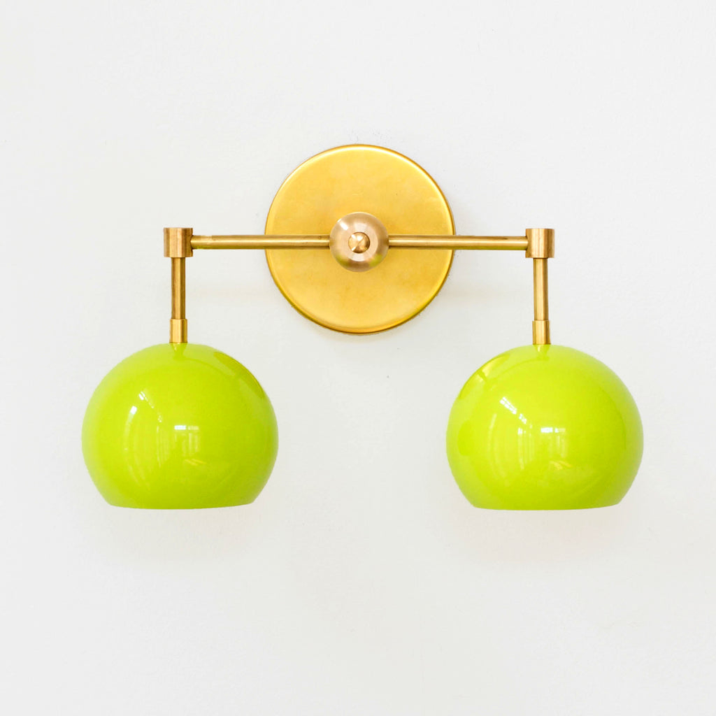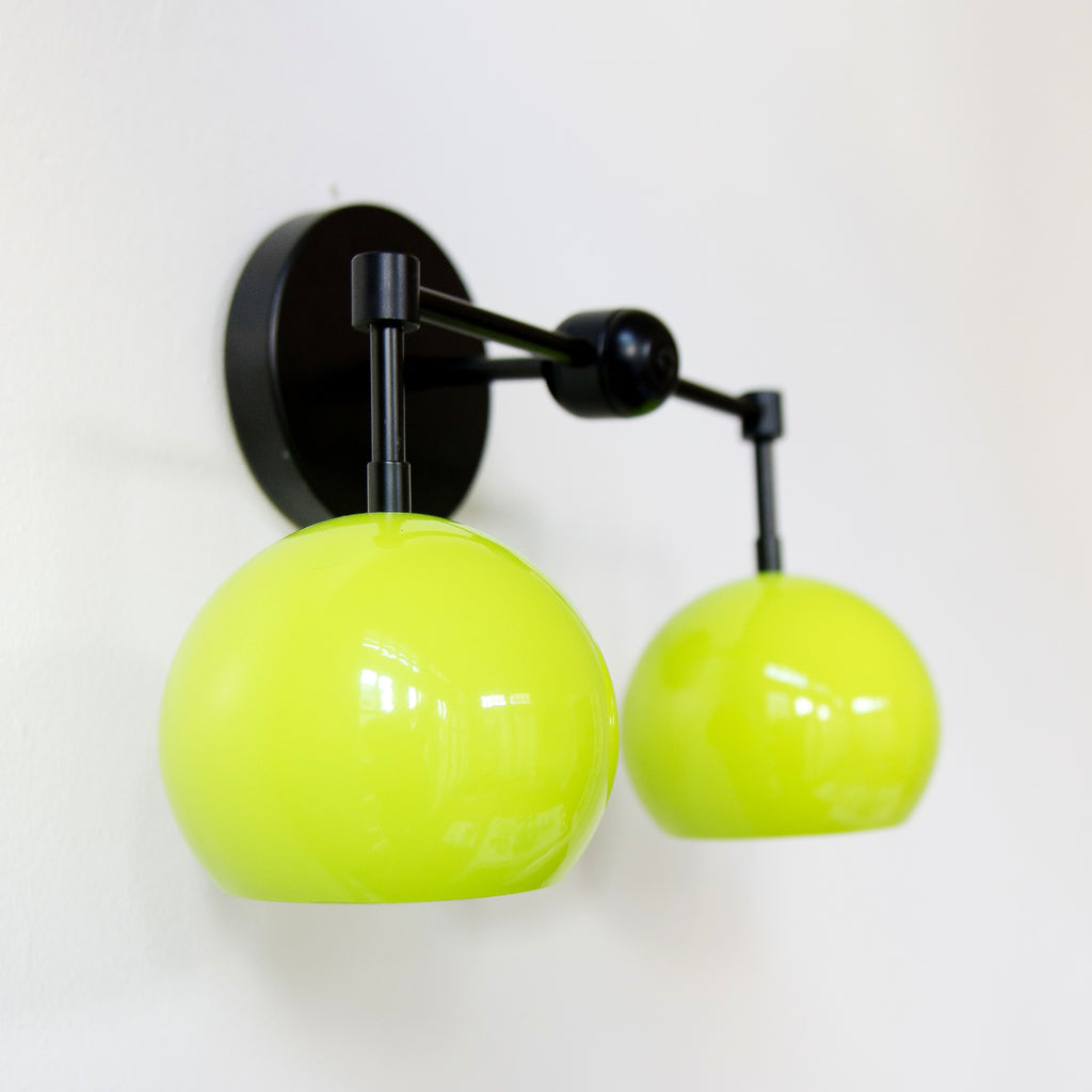 The Double Loa Sconce has a simple, minimalist design that can be fun or modern. Either way, it is bound to garner loads of compliments. This fixture is a two-light version of our single Loa sconce. The shades are globe-shaped and finished in a glossy neon chartreuse colored powdercoated finish.