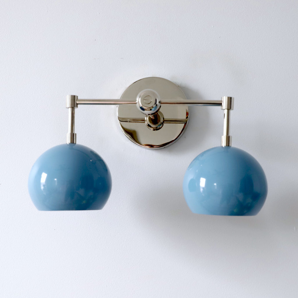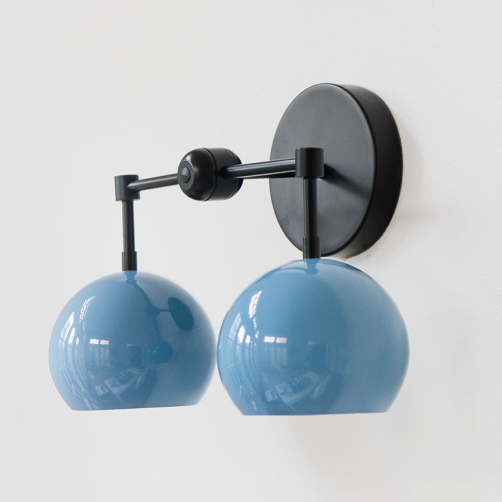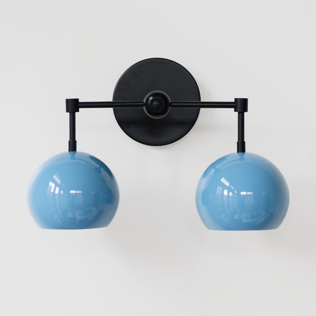 The Double Loa Sconce has a simple, minimalist design that can be fun or modern. Either way, it is bound to garner loads of compliments. This fixture is a two-light version of our single Loa sconce. The shades are globe-shaped and finished in a glossy light blue colored powdercoated finish.