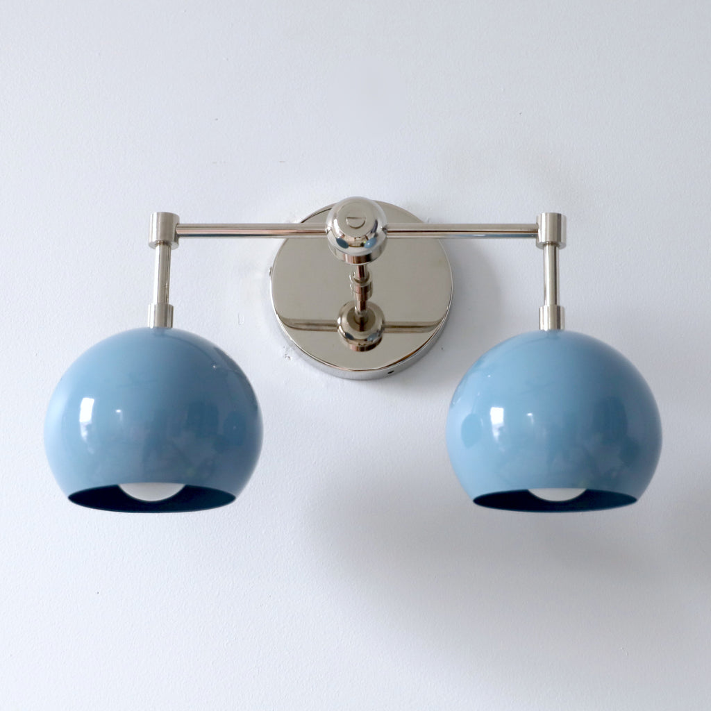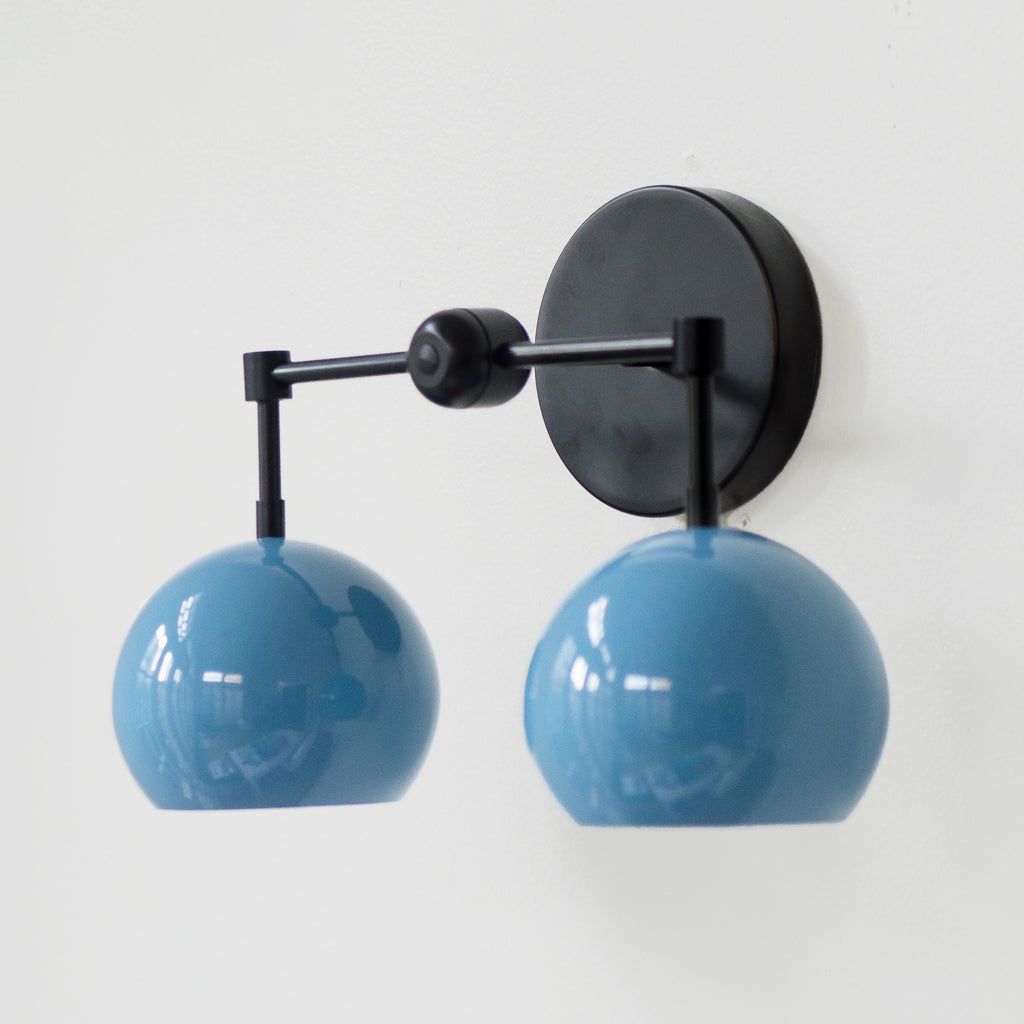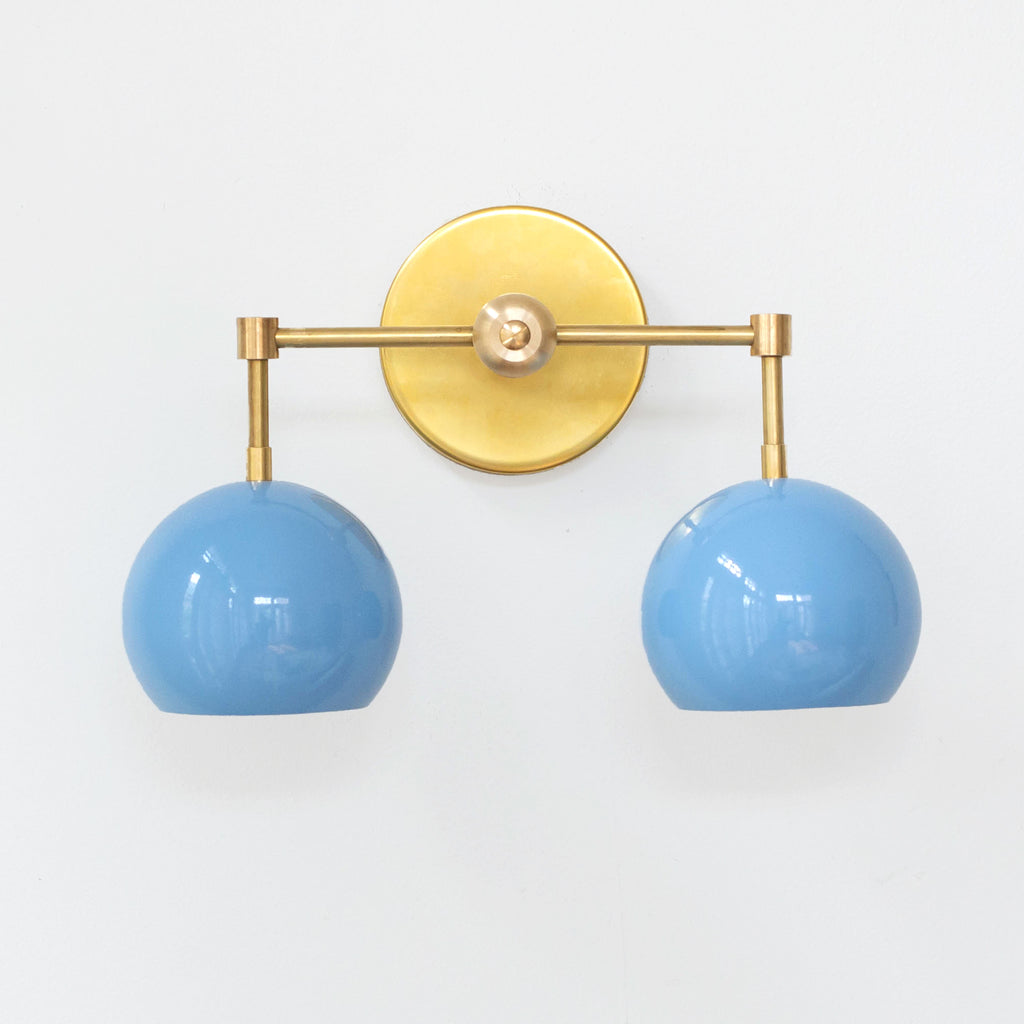 The Double Loa Sconce has a simple, minimalist design that can be fun or modern. Either way, it is bound to garner loads of compliments. This fixture is a two-light version of our single Loa sconce. The shades are globe-shaped and finished in a glossy light blue colored powdercoated finish.