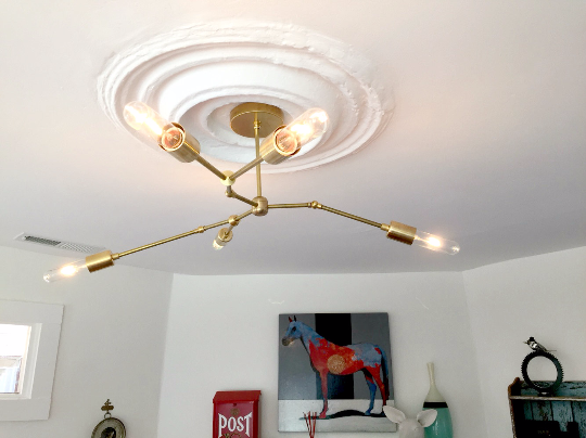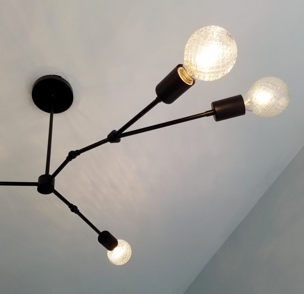 This three armed light has five lights total, so it's moderately bright, depending upon your choice of bulb. Arm and downrod length may be customized. Message me for details.