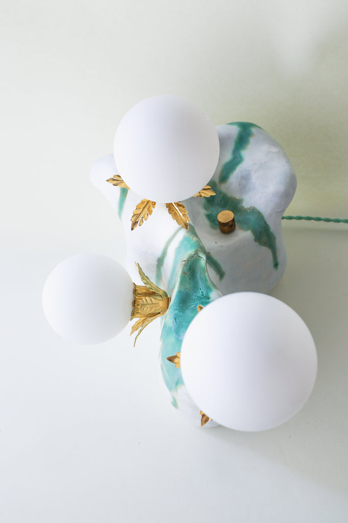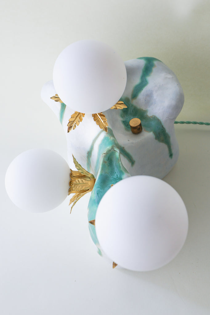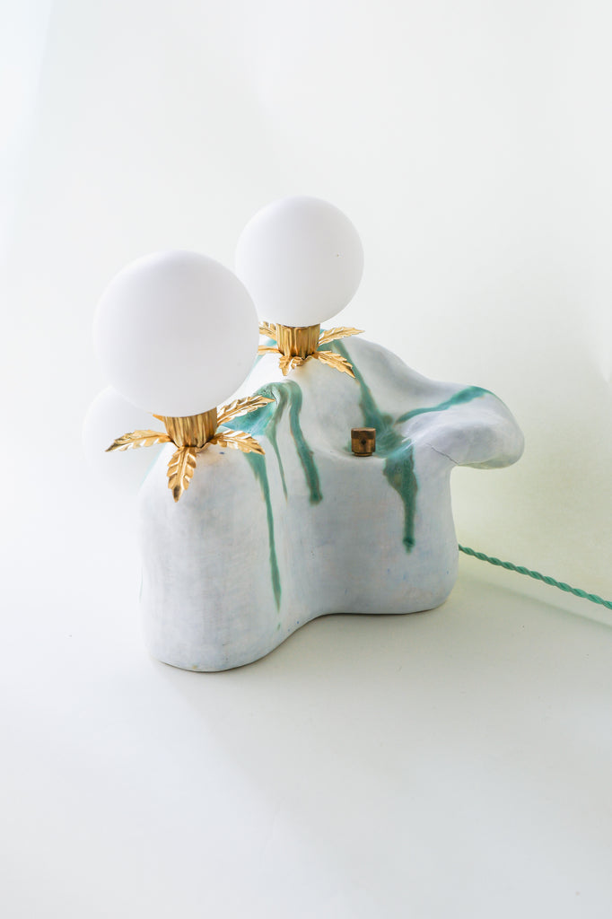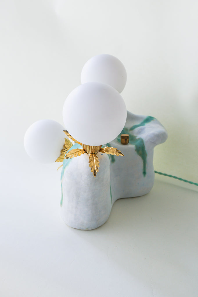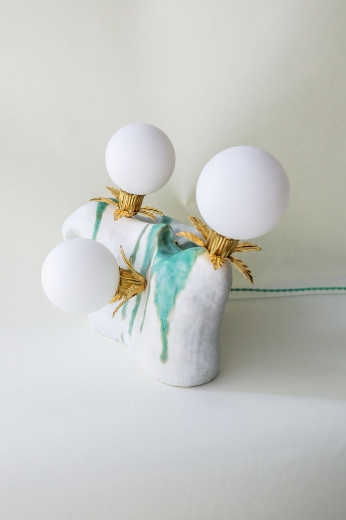 This sculptural table lamp was hand-built in stoneware, then finished in a creamy white eggshell glaze with a blue-green patina drip that pools along the form. Three frosted globes rise from raw brass petal bobèches, giving the piece a cactus-meets-creature silhouette. It is substantial and reads as functional art on a console, shelf, or pedestal. The integrated dimmer lets you set a soft glow or brighter ambient light. When viewed from the front, the globes sit to the top and left and the dimmer knob is on the right.