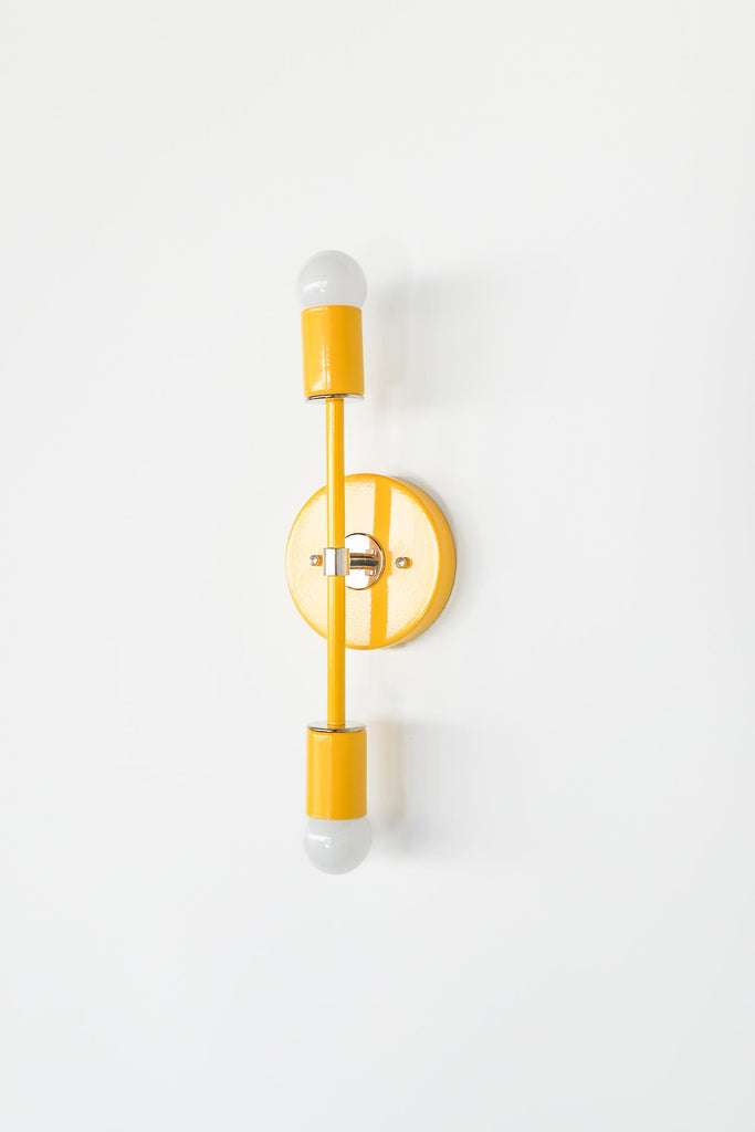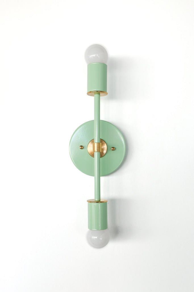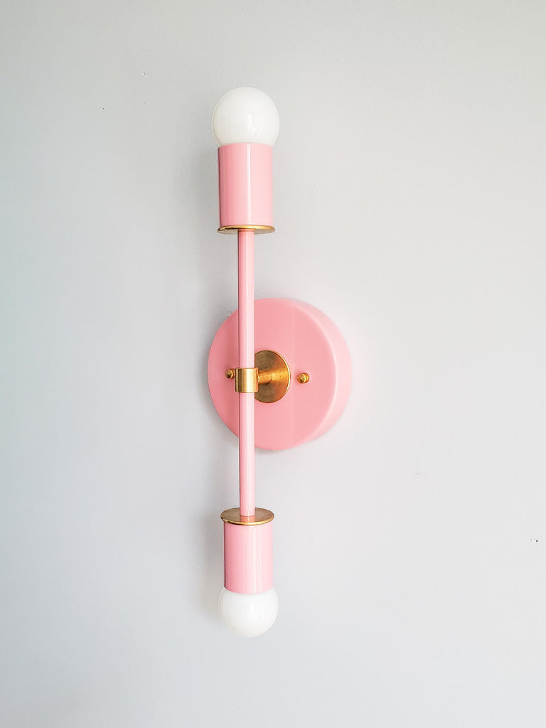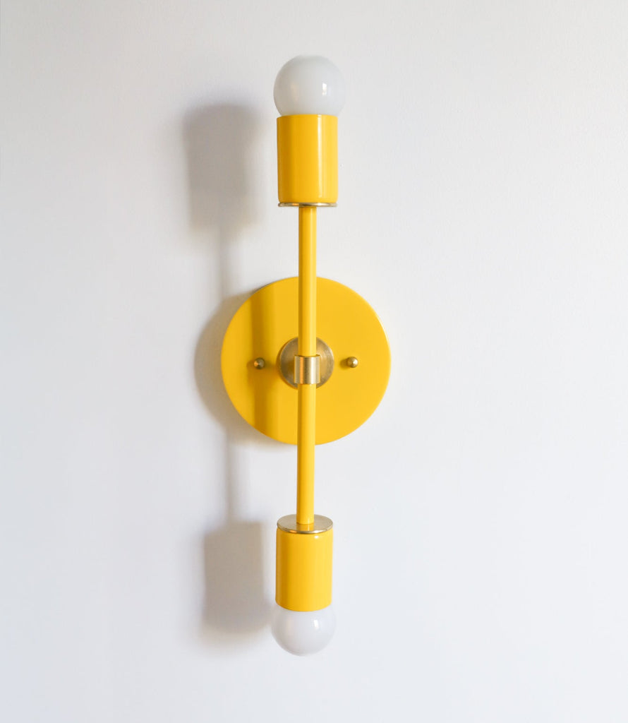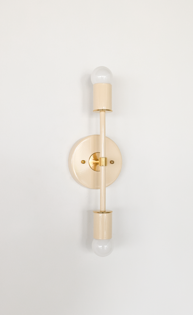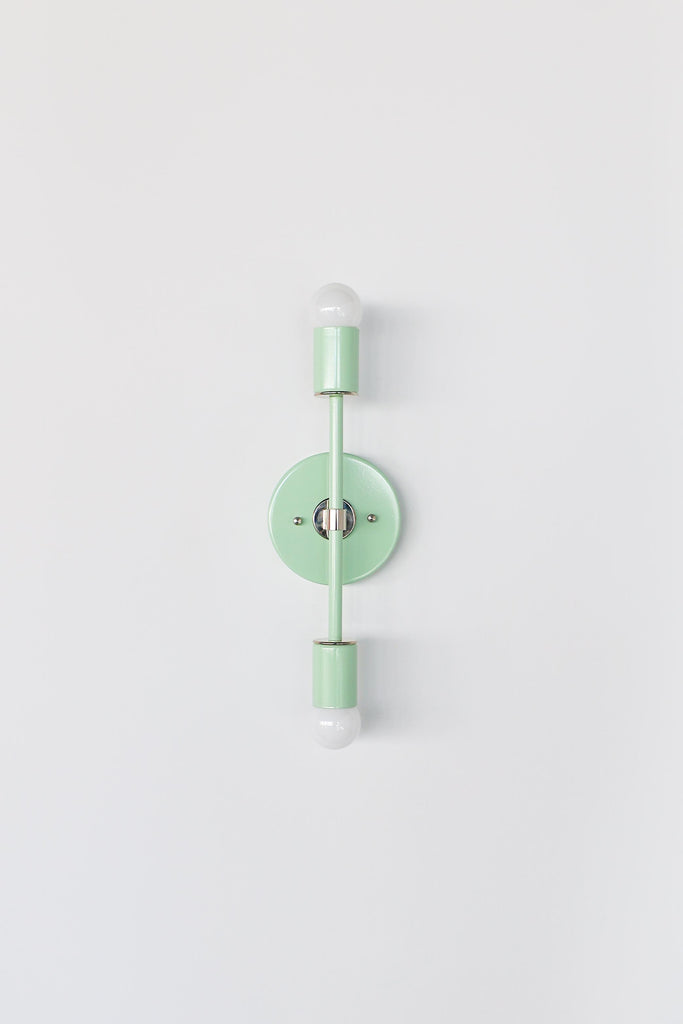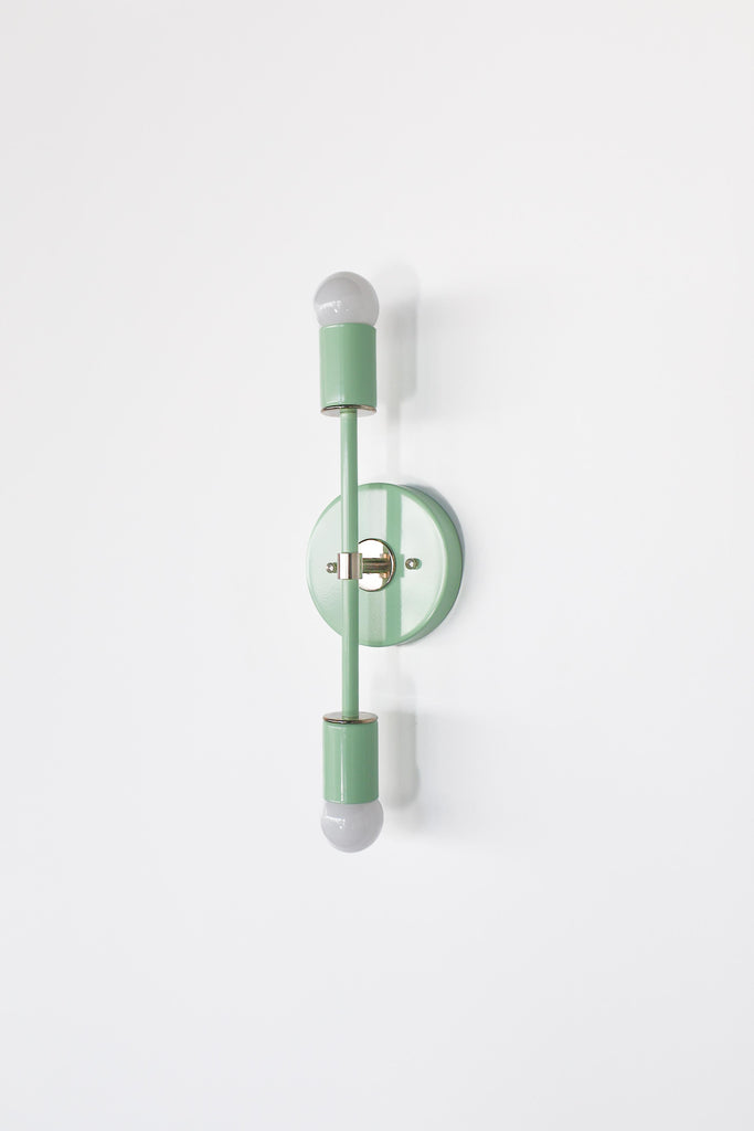 Color is the star of the show in the Thalia Sconce. Named after a Greek Muse, the Thalia sconce is saturated in color with metal accents. The two-light sconce or flush mount ceiling light is slightly elongated and can be used in small spaces that need high impact design. The fixture can be installed on a wall or ceiling in both horizontal or vertical position. Hardwire installation; however, a plug in option can be added here.