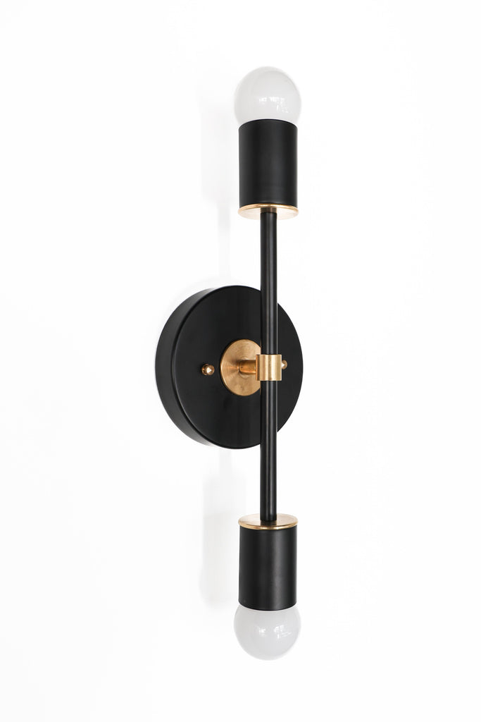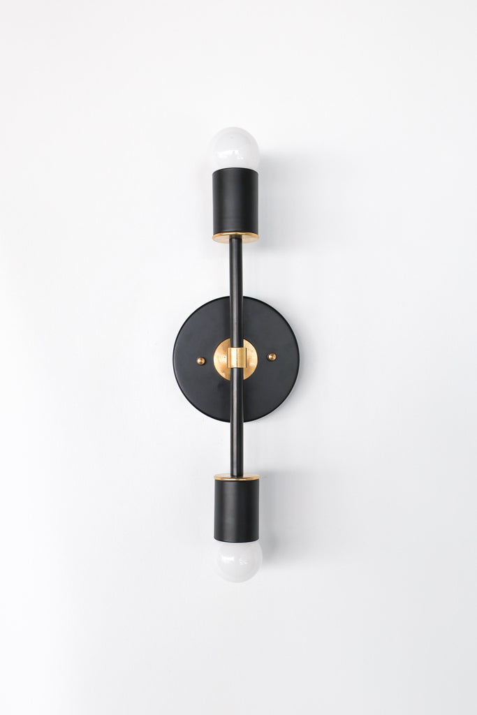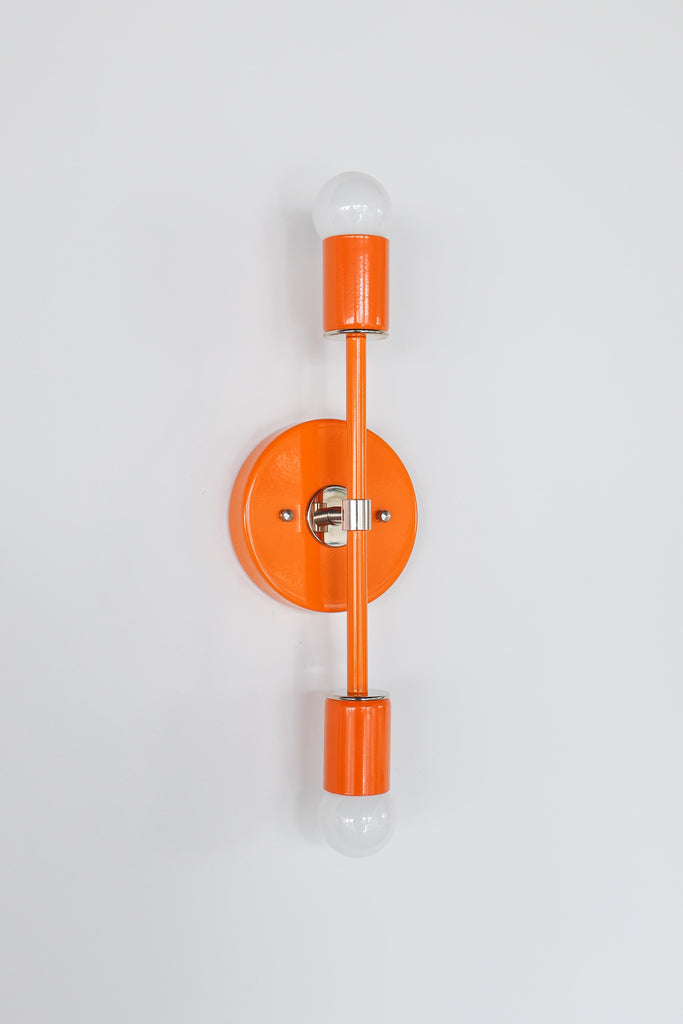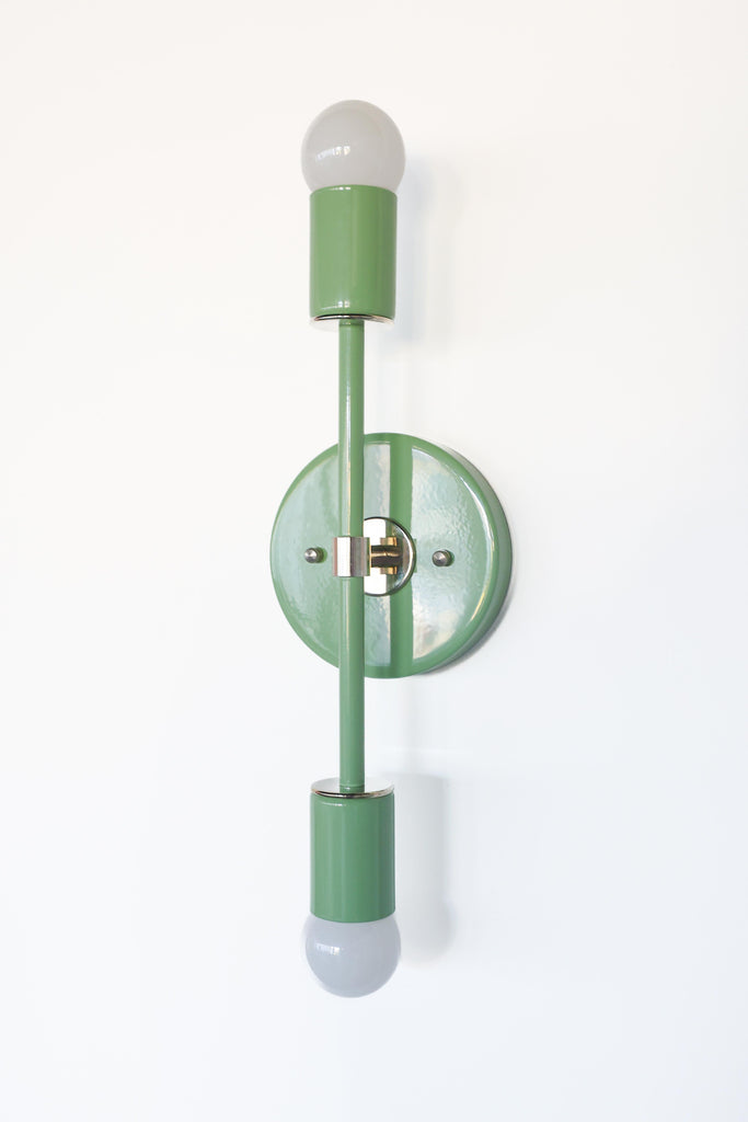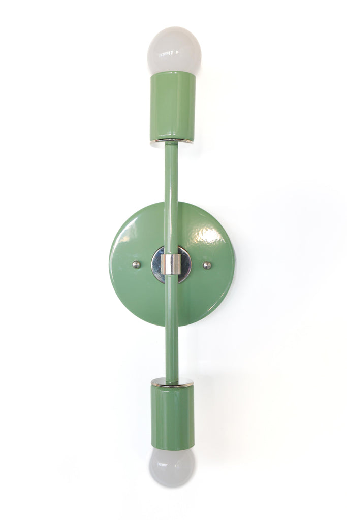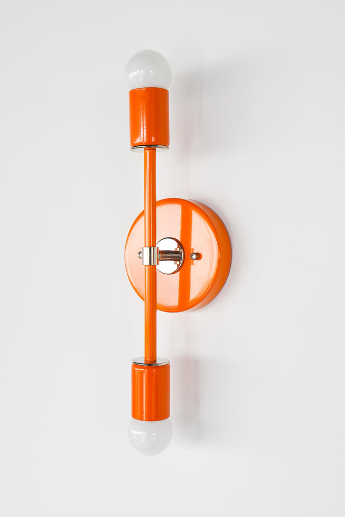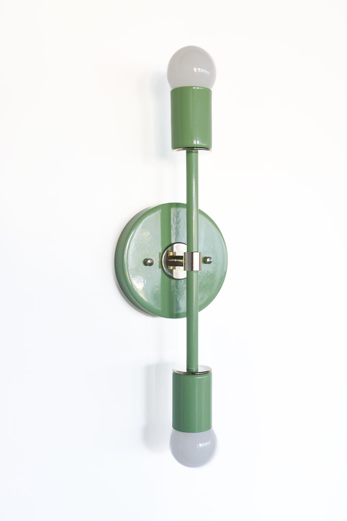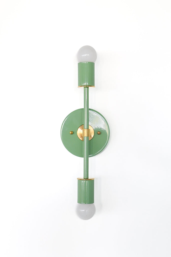 Color is the star of the show in the Thalia Sconce. Named after a Greek Muse, the Thalia sconce is saturated in color with metal accents. The two-light sconce or flush mount ceiling light is slightly elongated and can be used in small spaces that need high impact design. The fixture can be installed on a wall or ceiling in both horizontal or vertical position. Hardwire installation; however, a plug in option can be added here.